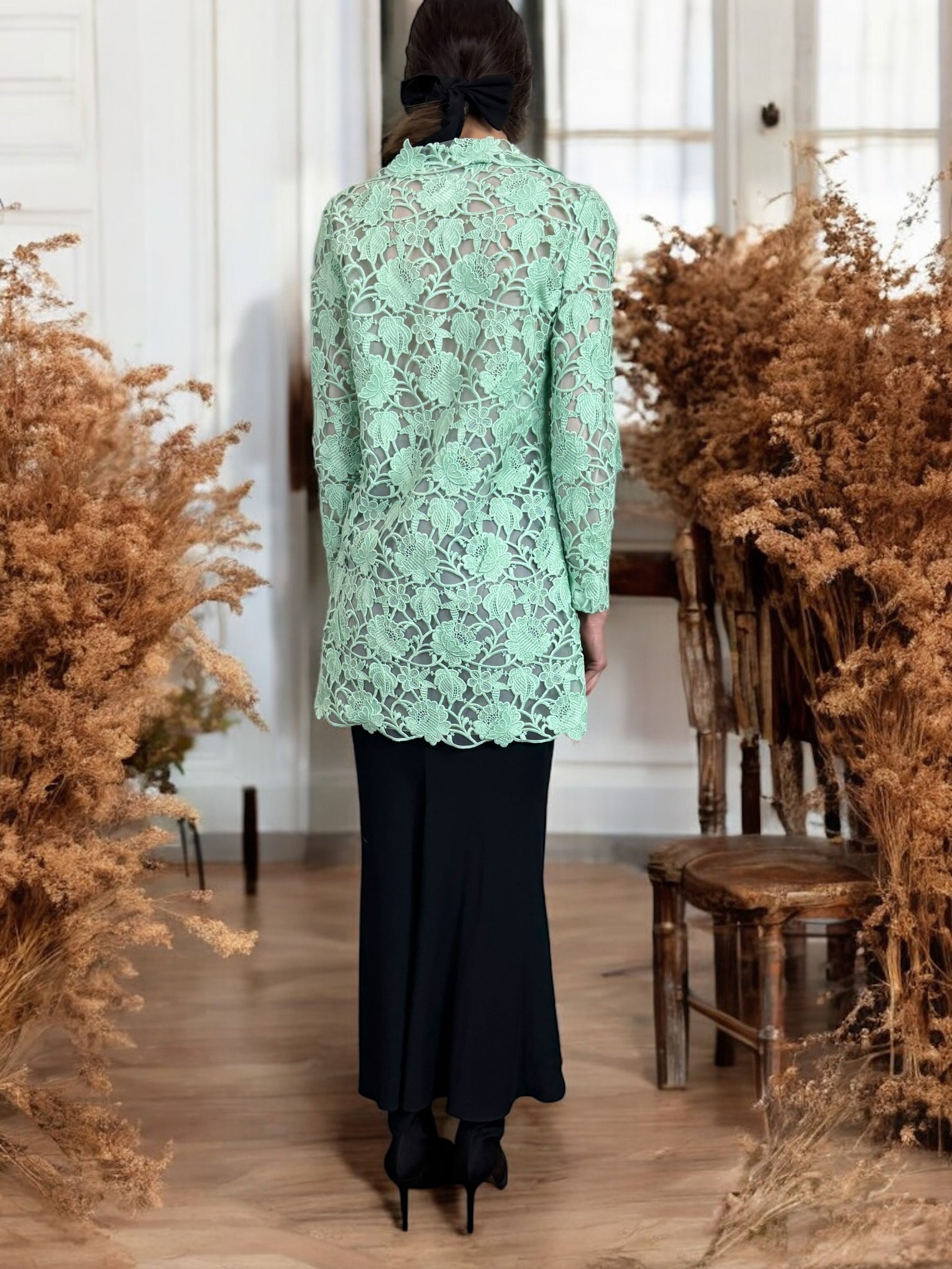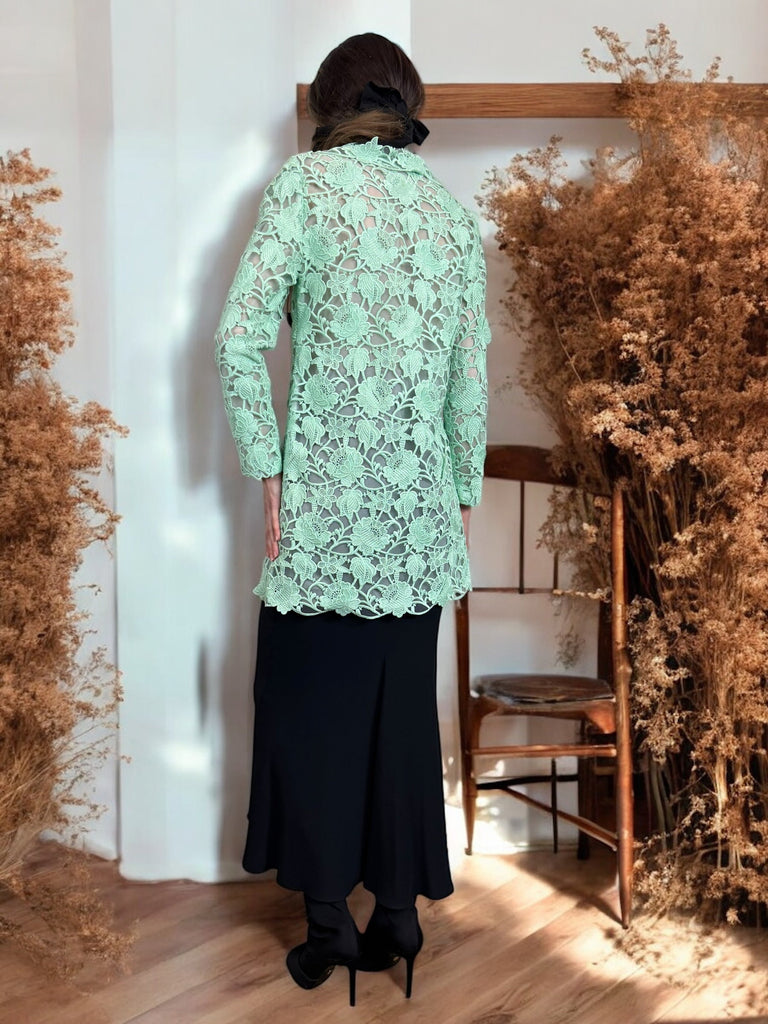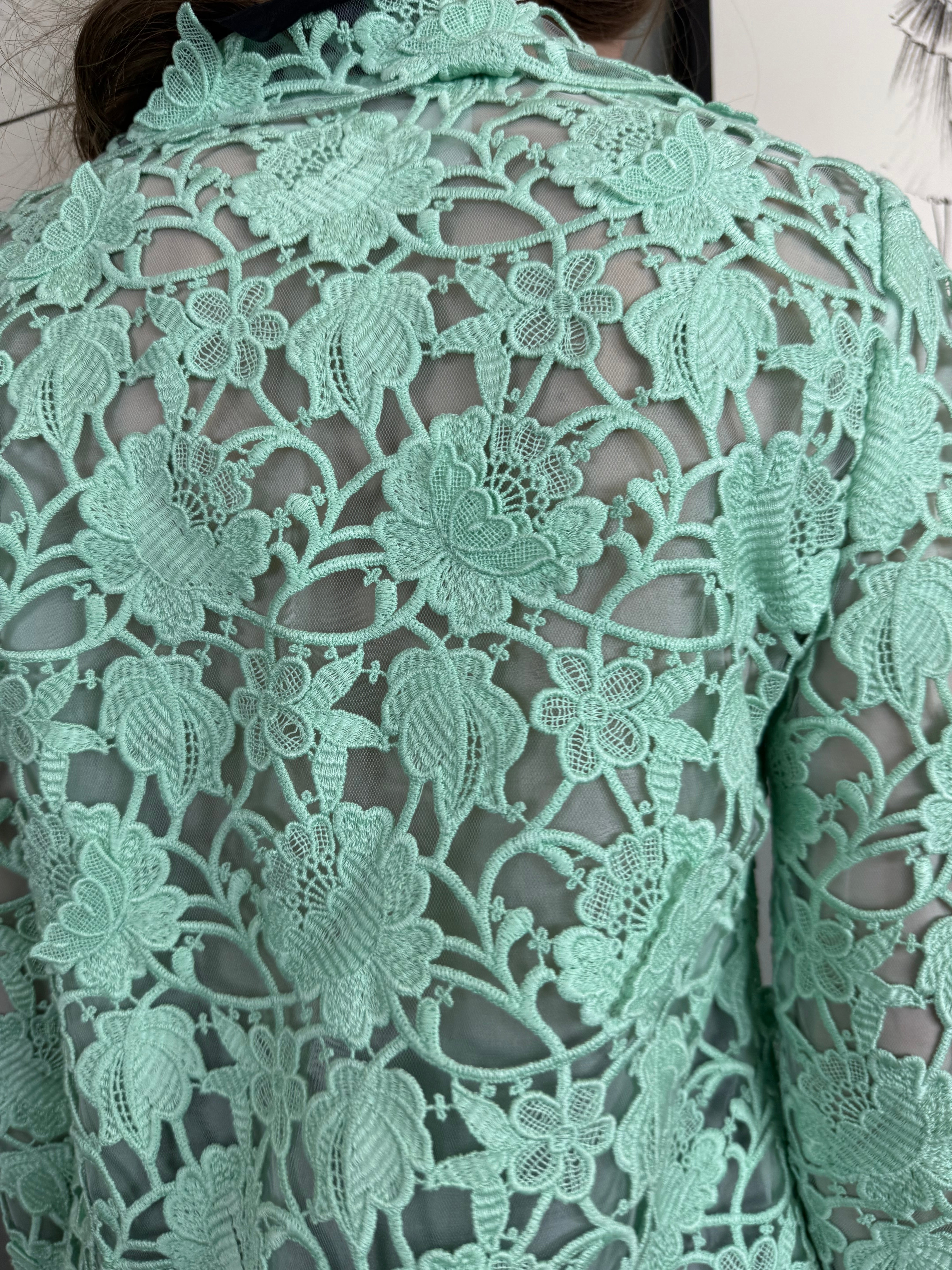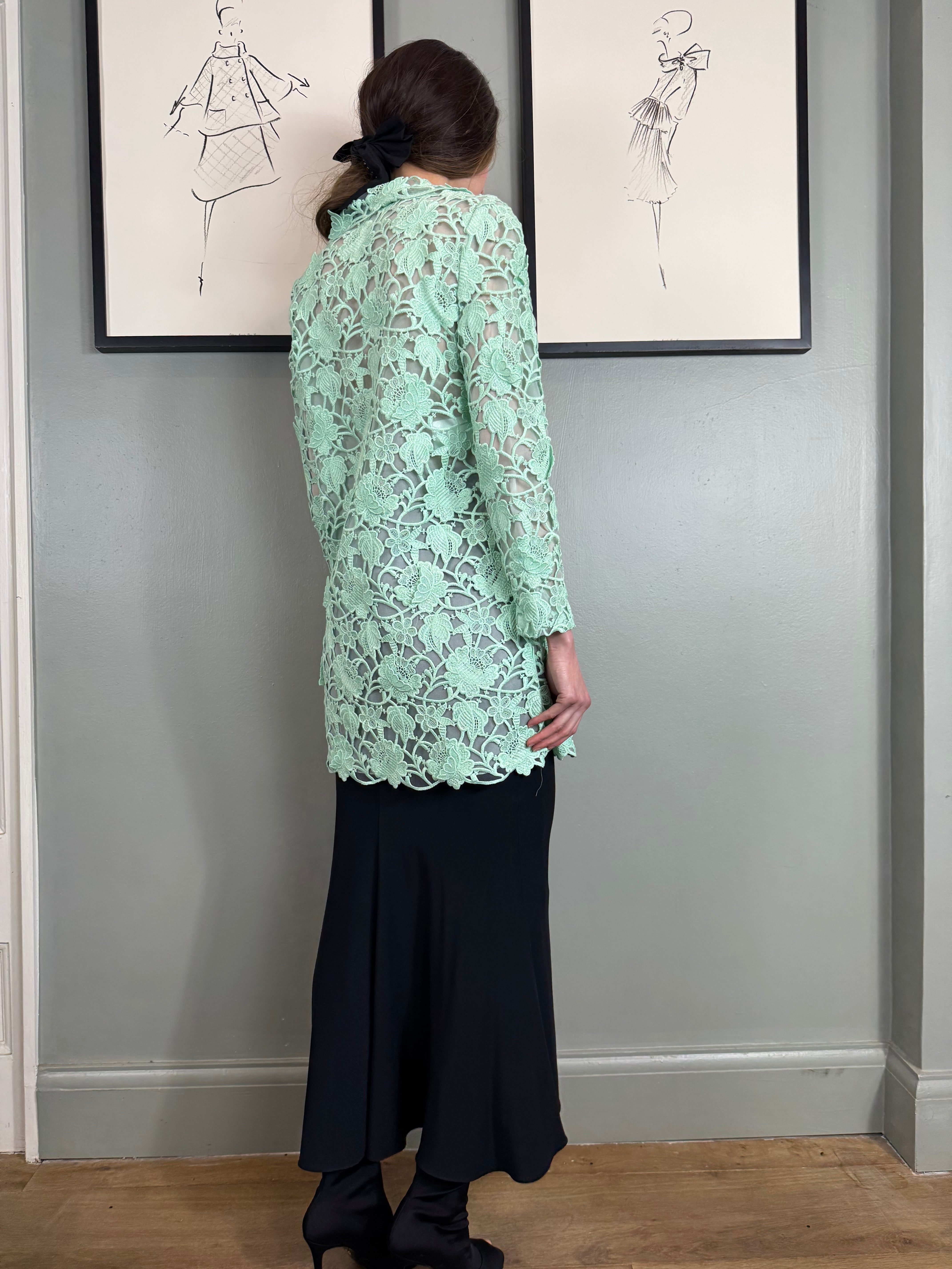 This vibrant Giambattista Valli aqua lace jacket features long sleeves, a strong lapel, and a silk black bow fastened under the bust. The intricate cutouts and bold color make this jacket a statement piece, perfect for any fashion-forward individual. Here paired with a McQueen high waisted bias cut skirt.