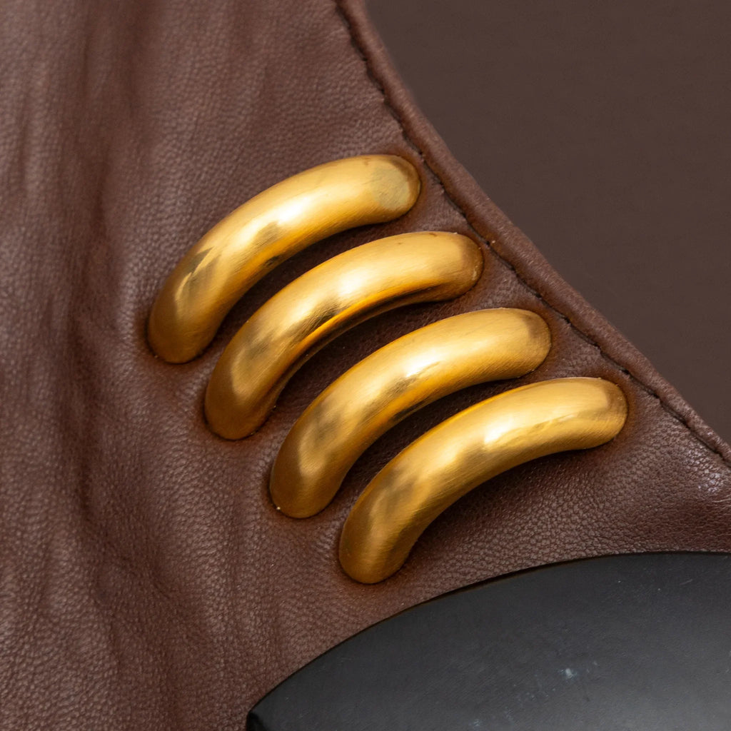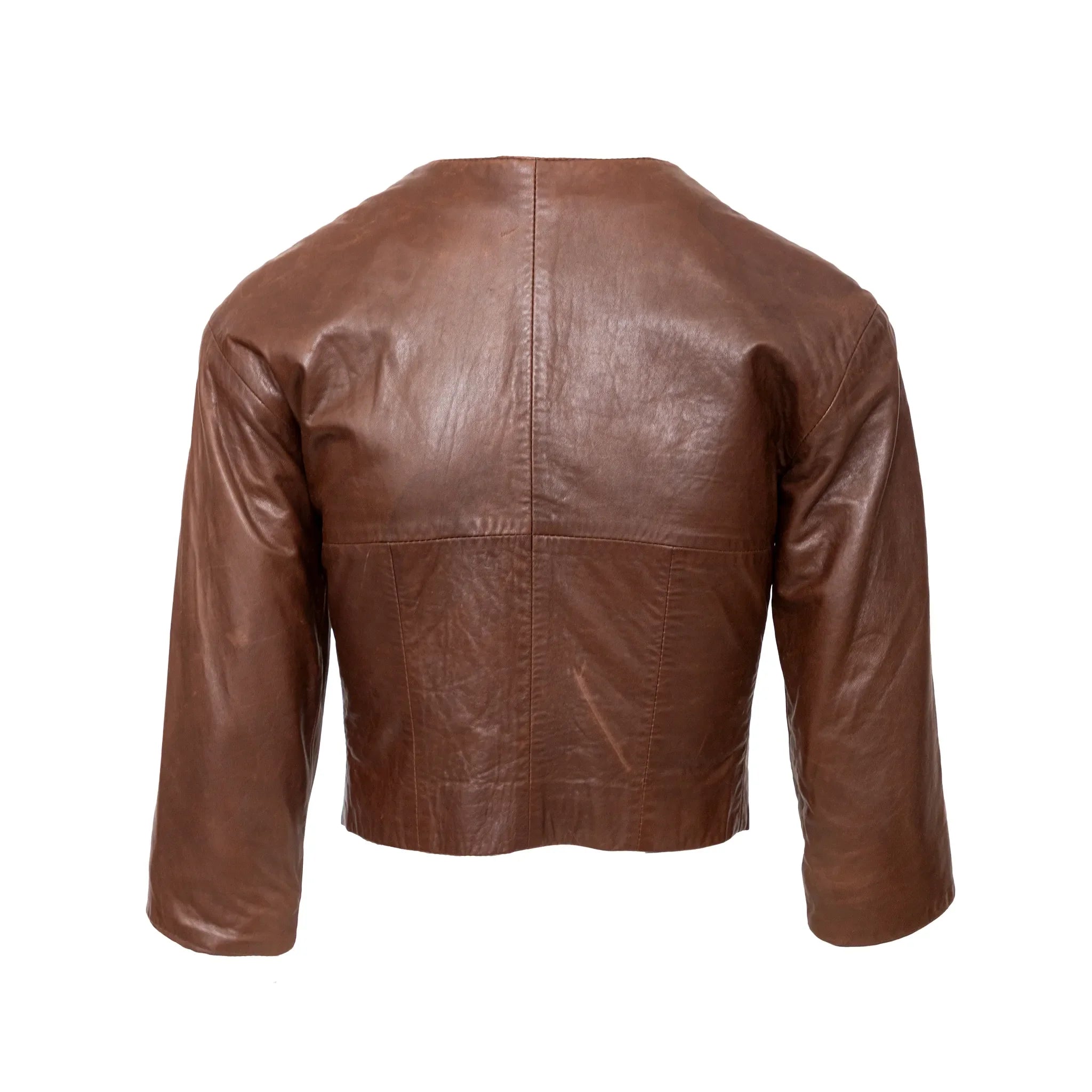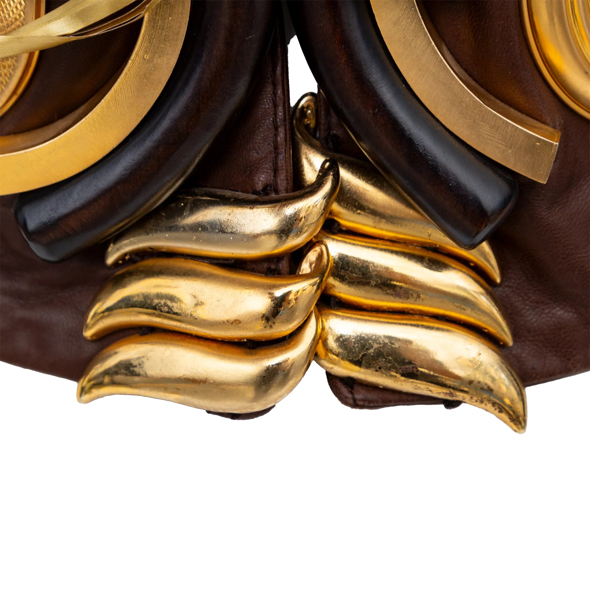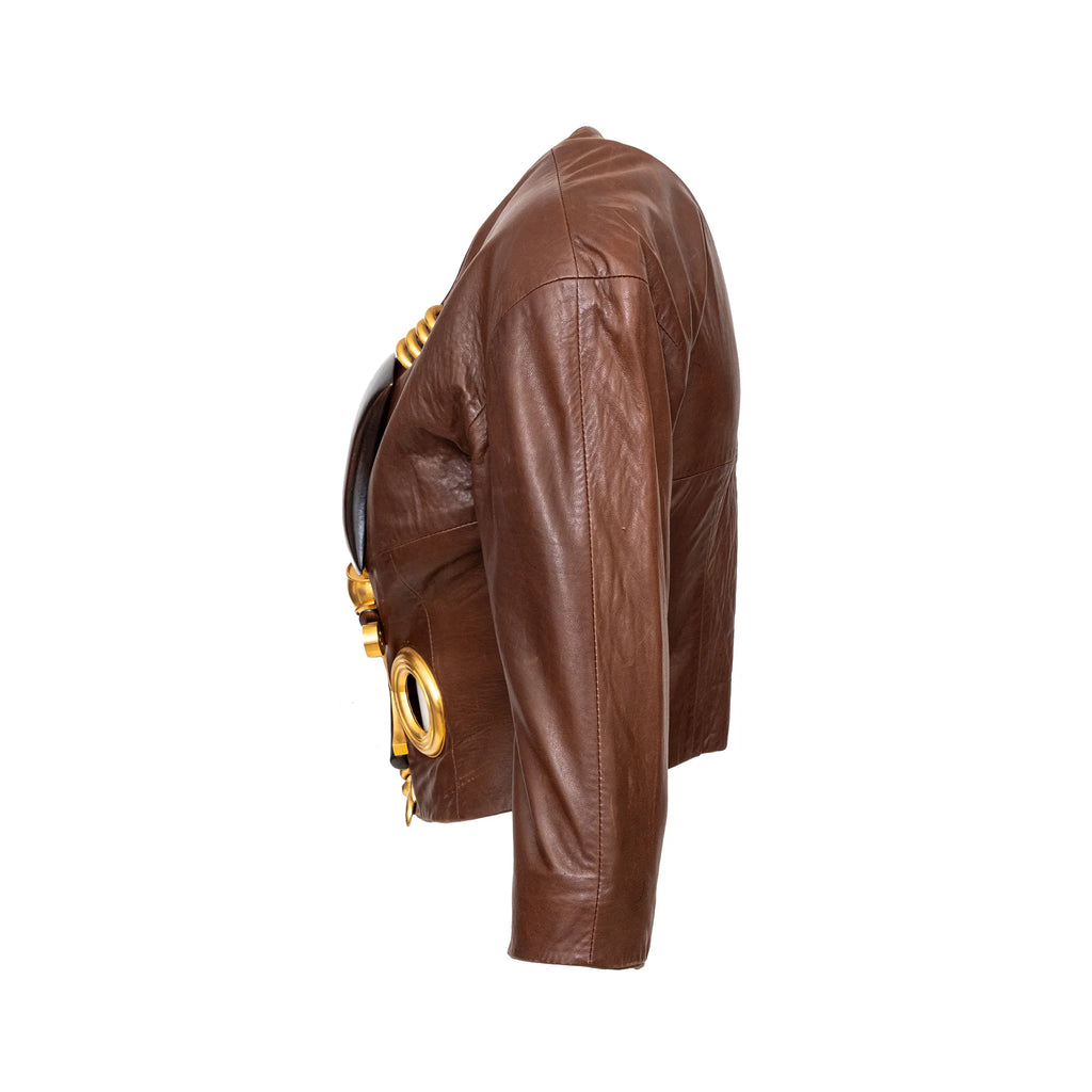 Brown soft leather jacket by Gianfranco Ferré with striking African-inspired design, featuring bold wooden and gold-tone sculptural accents, open front, and cropped quarter sleeves.
