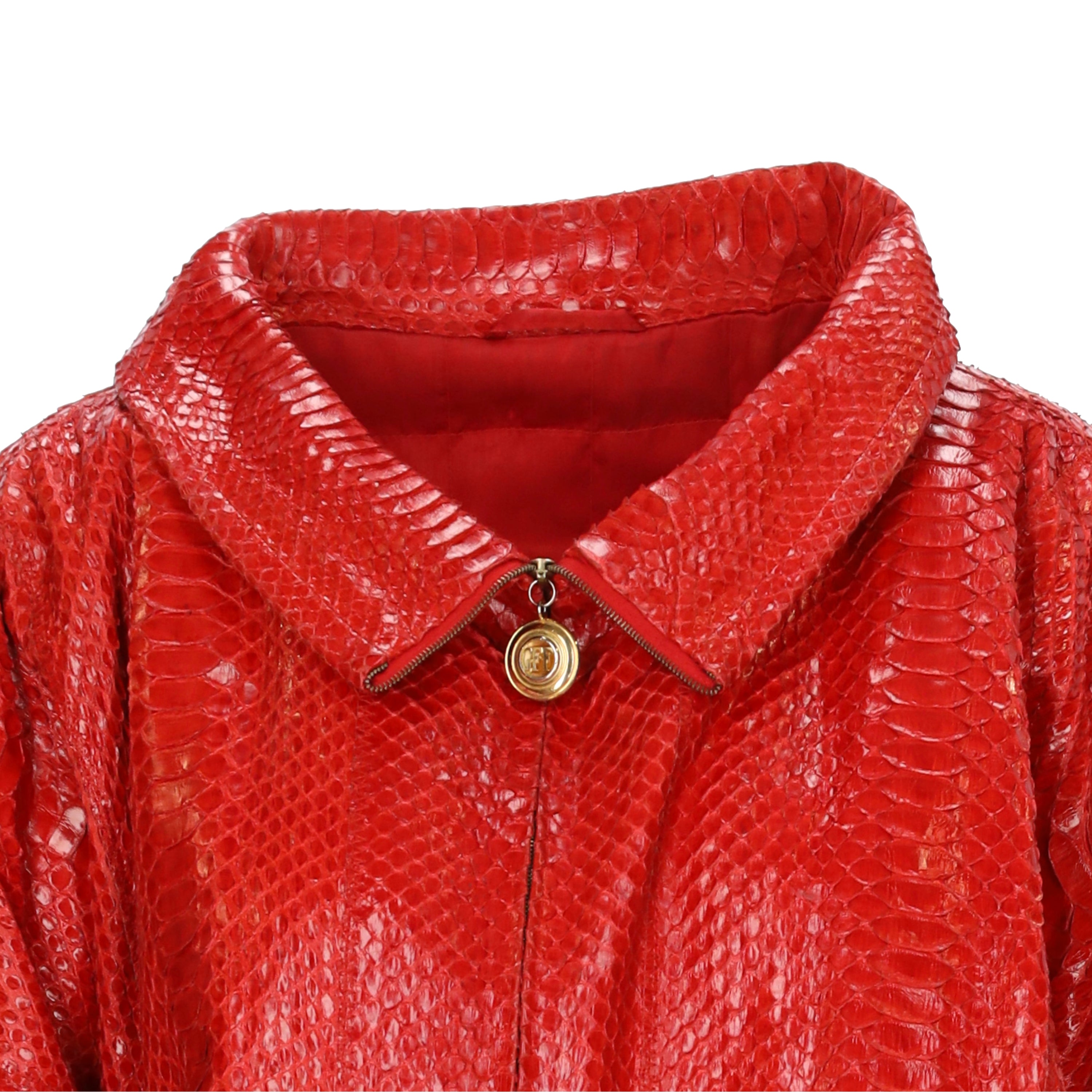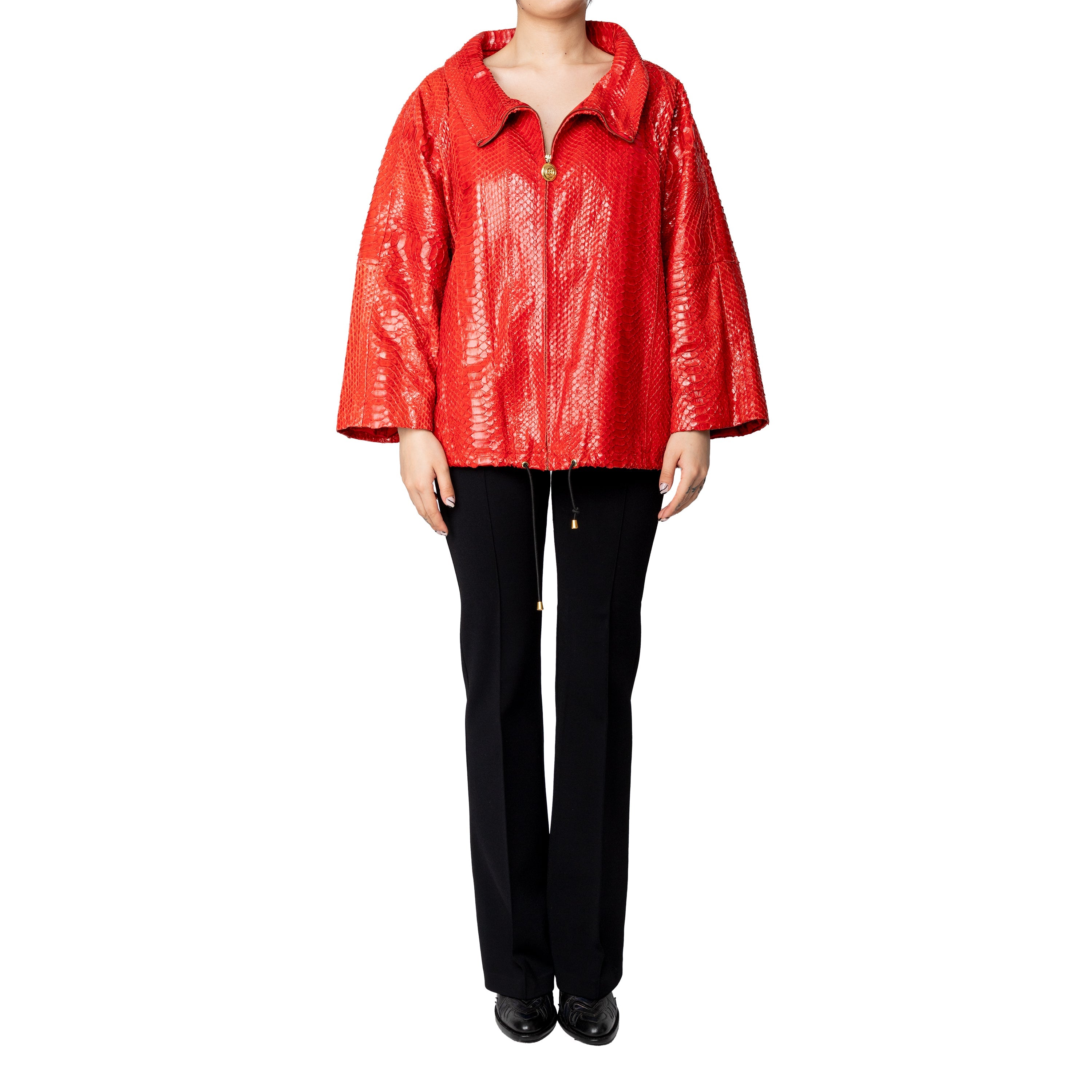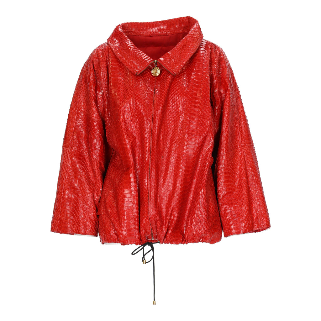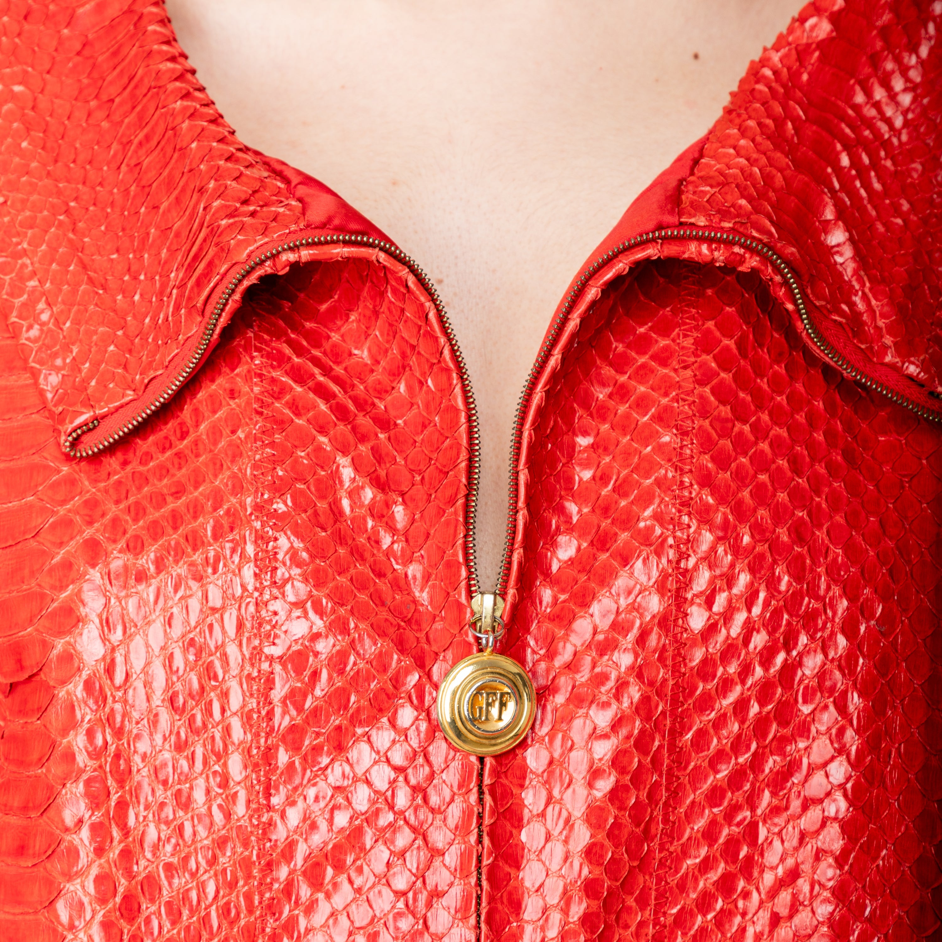 This Gianfranco Ferré python leather jacket is a true collector's item. Crafted in an exquisite red python leather featuring a relaxed fit with a drop shoulder. The front zipper is embellished with a GFF logo engraved button in gold tone and an adjustable drawstring hem. There are two side pockets and a smooth silk lining for added comfort.