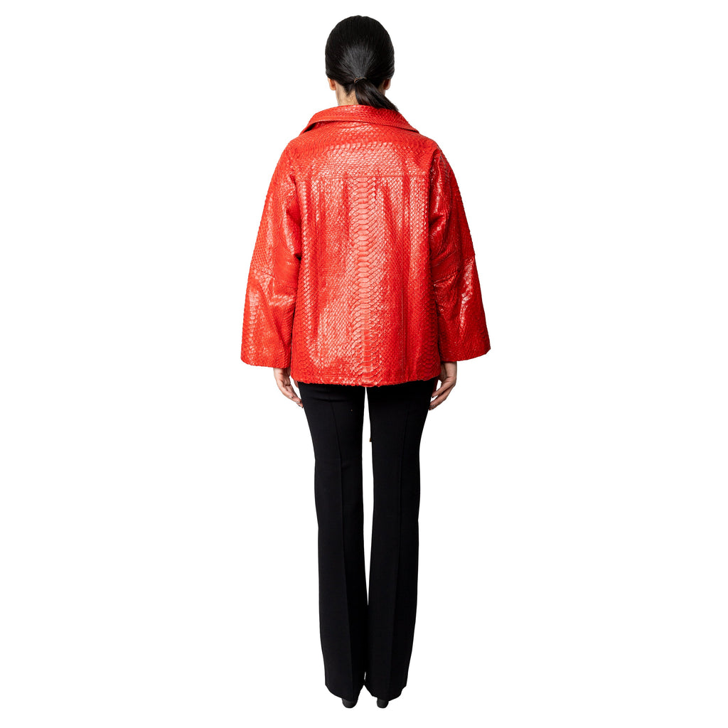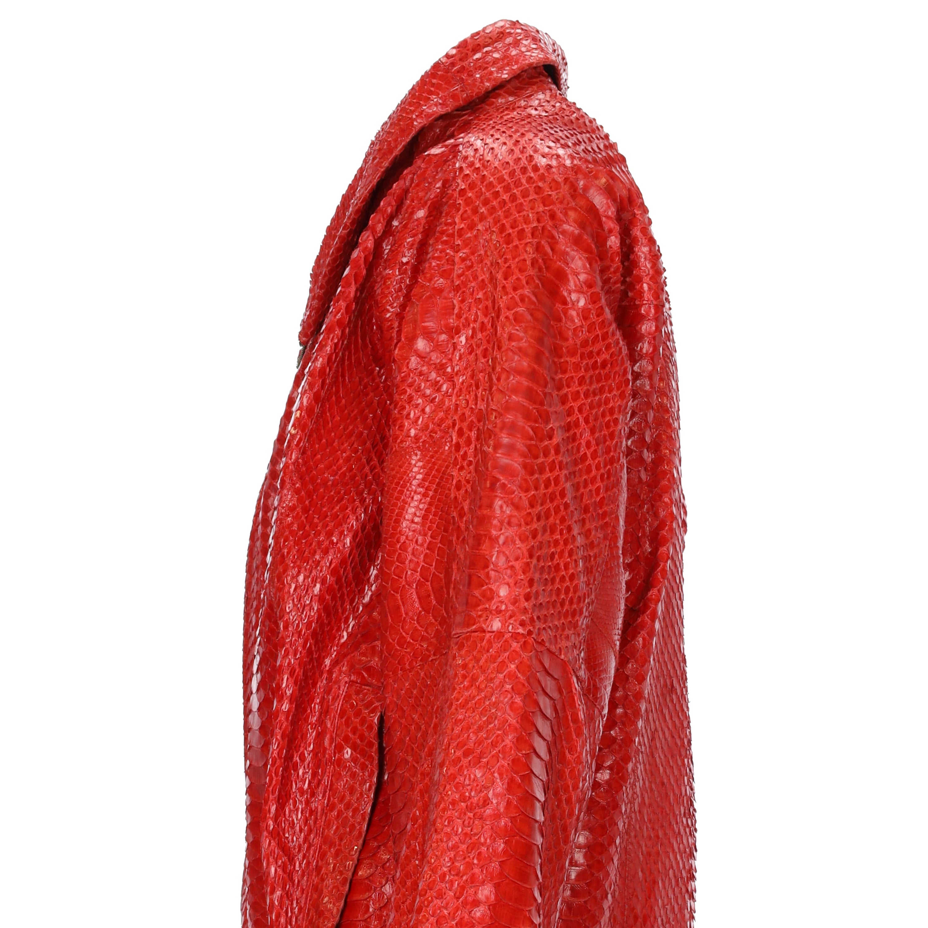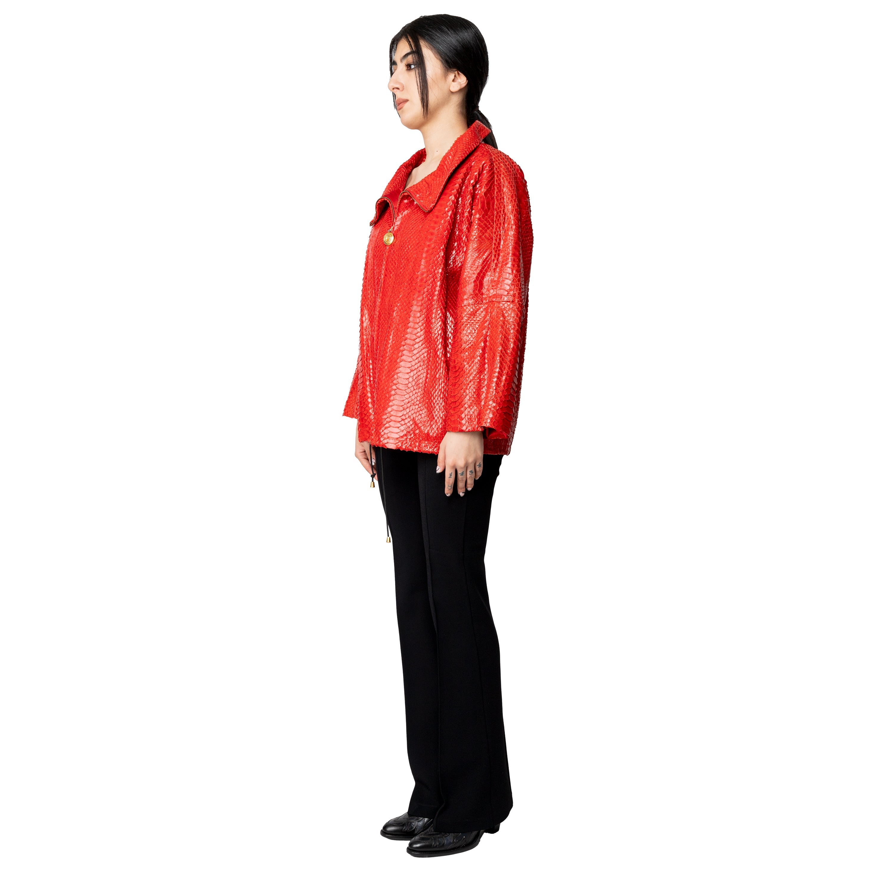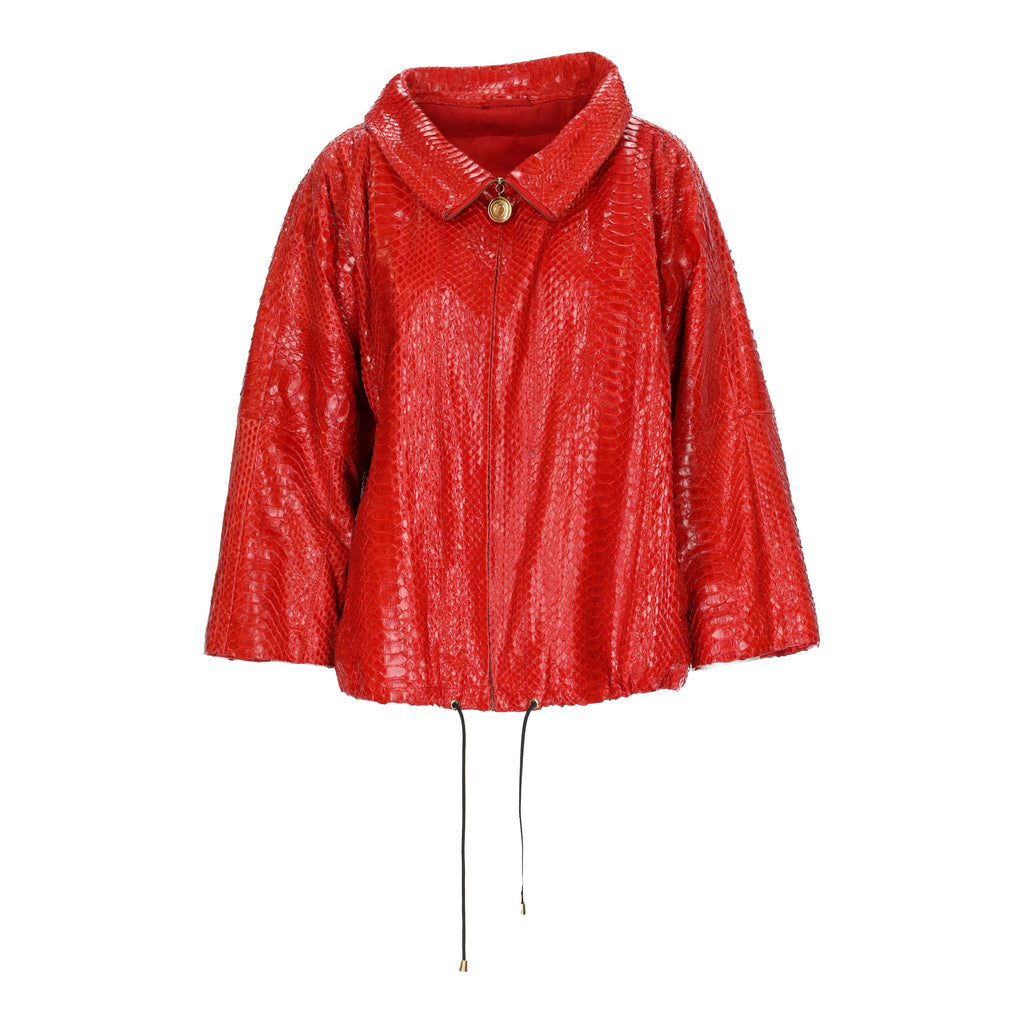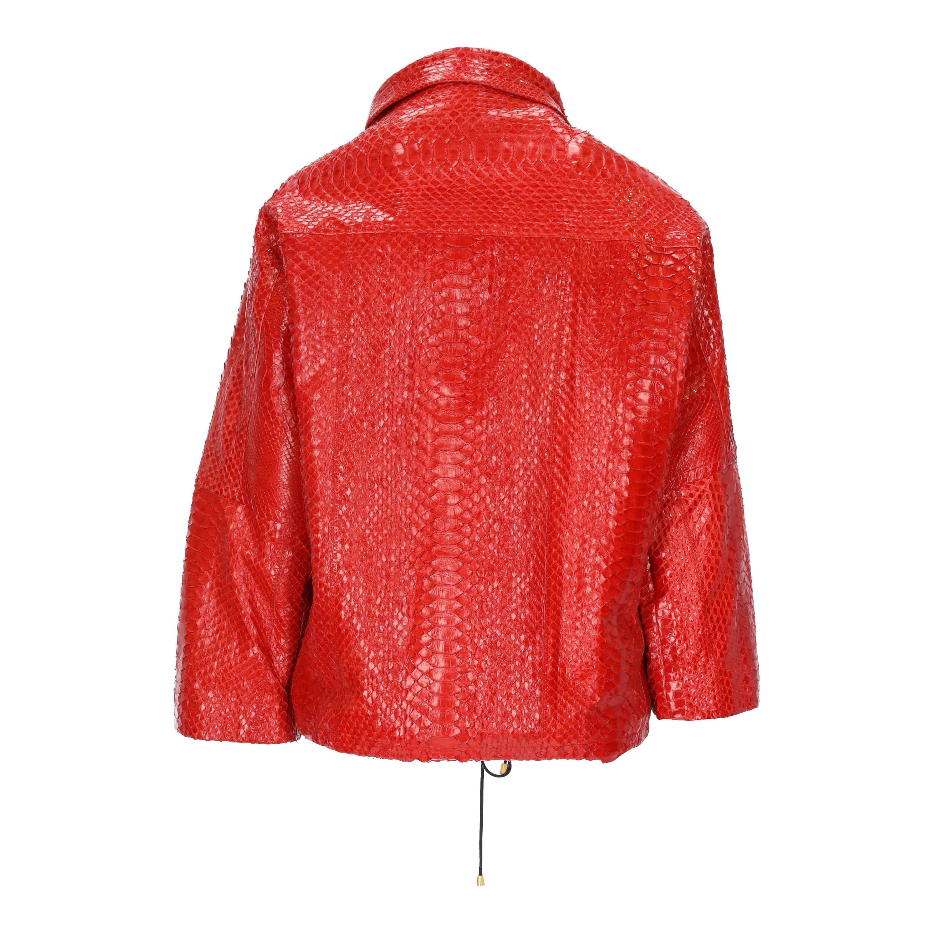 This Gianfranco Ferré python leather jacket is a true collector's item. Crafted in an exquisite red python leather featuring a relaxed fit with a drop shoulder. The front zipper is embellished with a GFF logo engraved button in gold tone and an adjustable drawstring hem. There are two side pockets and a smooth silk lining for added comfort.