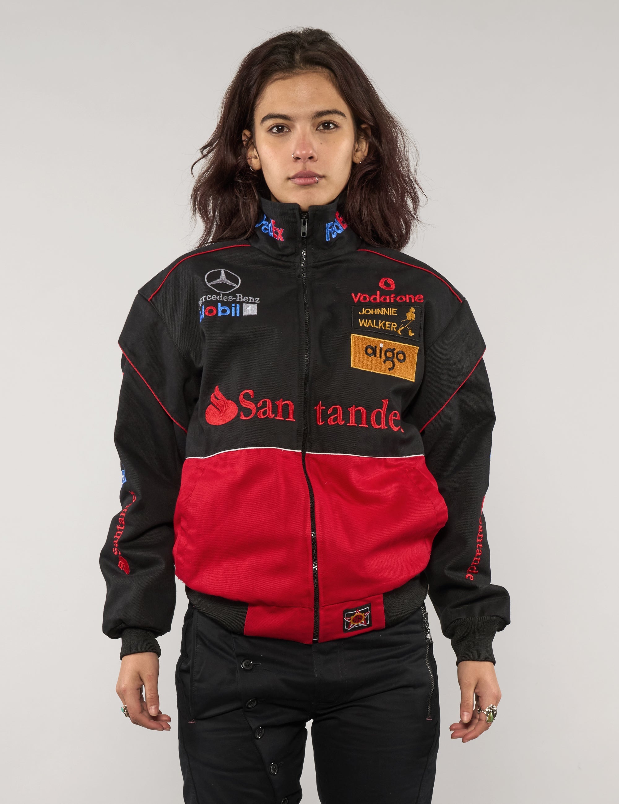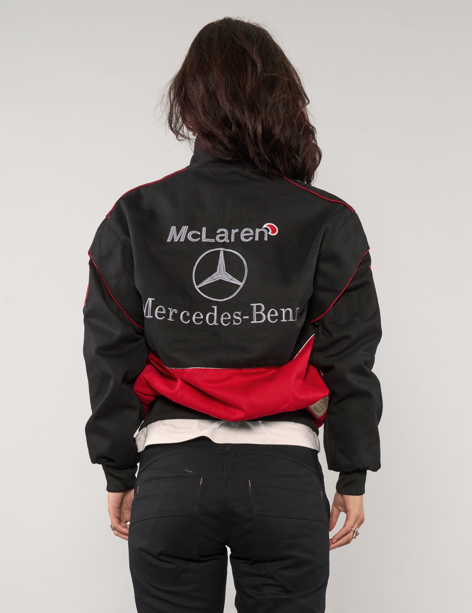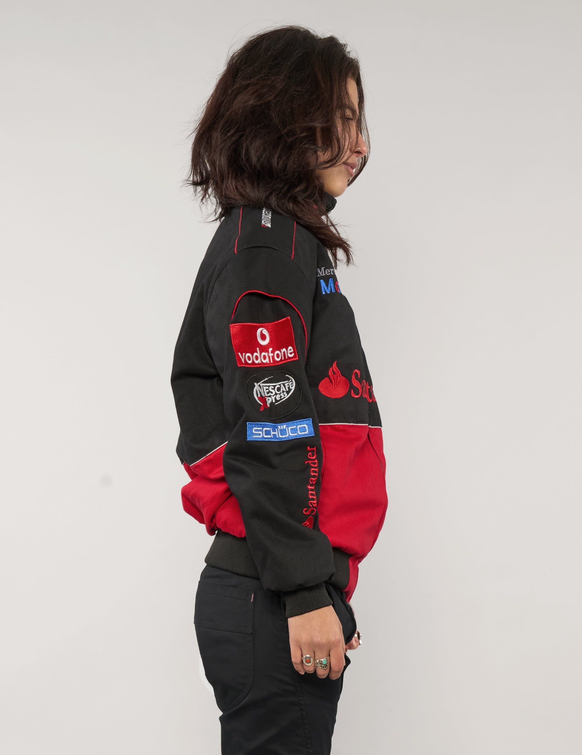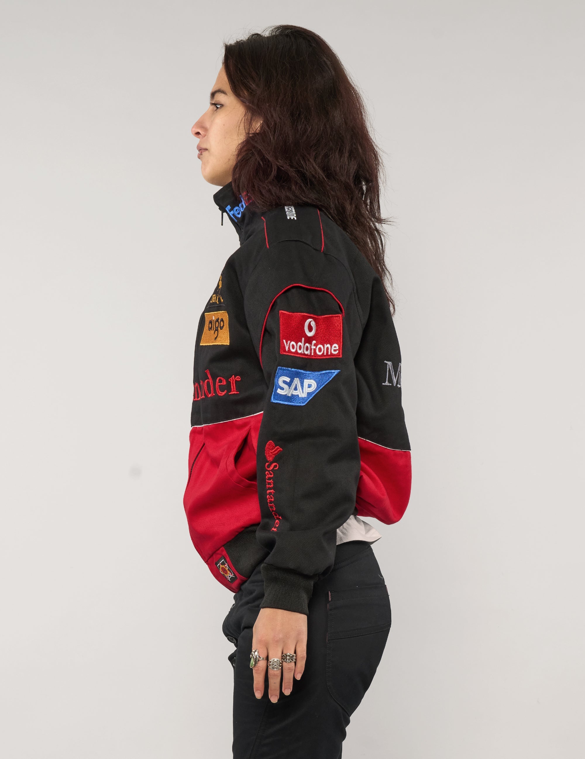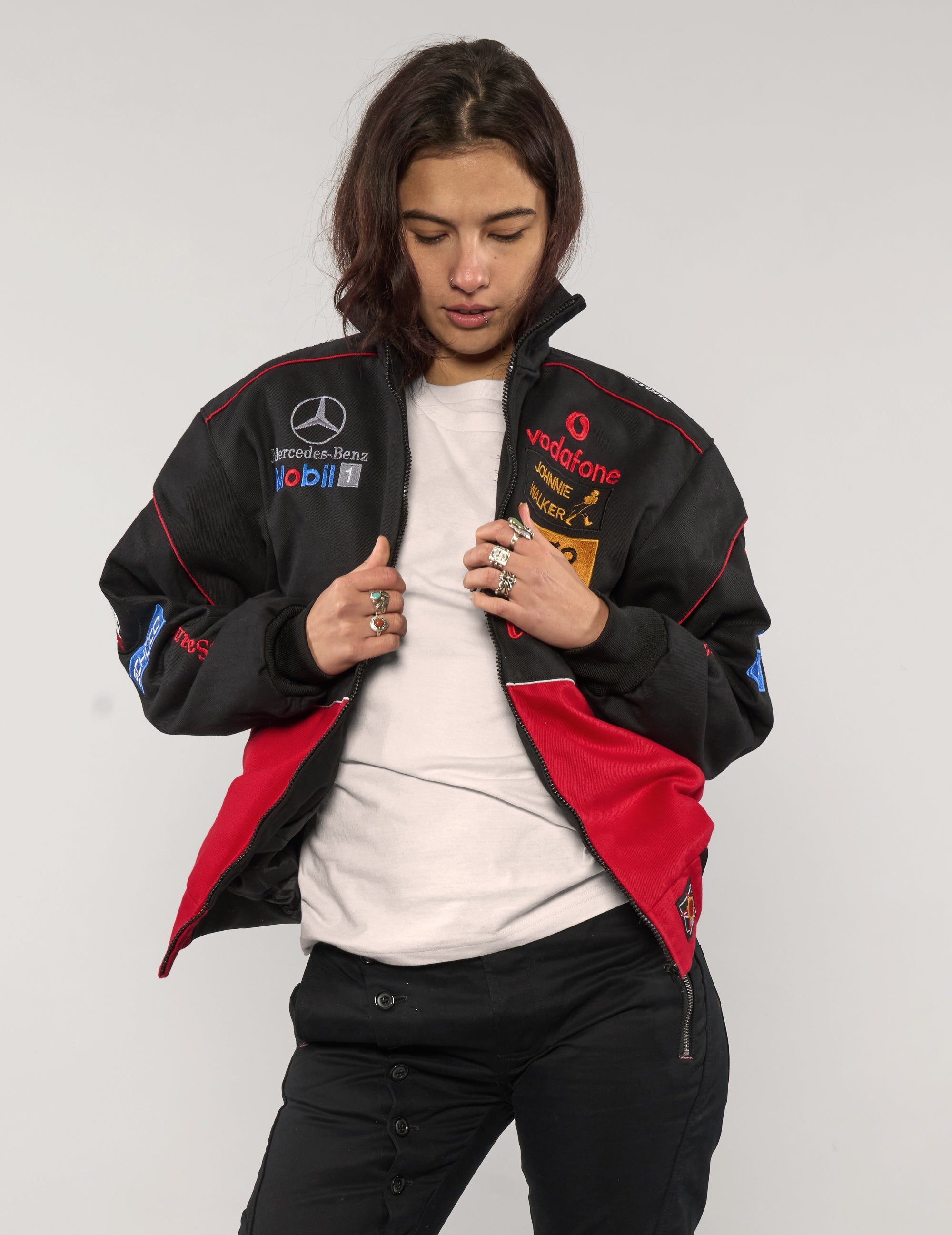 Deadstock, Mclaren / Mercedes Racing Jacket, cut in a boxy, insulated silhouette. This piece features bold contrast panels, a high zip neck, and original racing-style patches throughout. The padded structure and ribbed cuffs give it a protective, utilitarian feel, while the colour blocking brings pure trackside attitude. Loud, unapologetic, this one’s all speed and no restraint.
