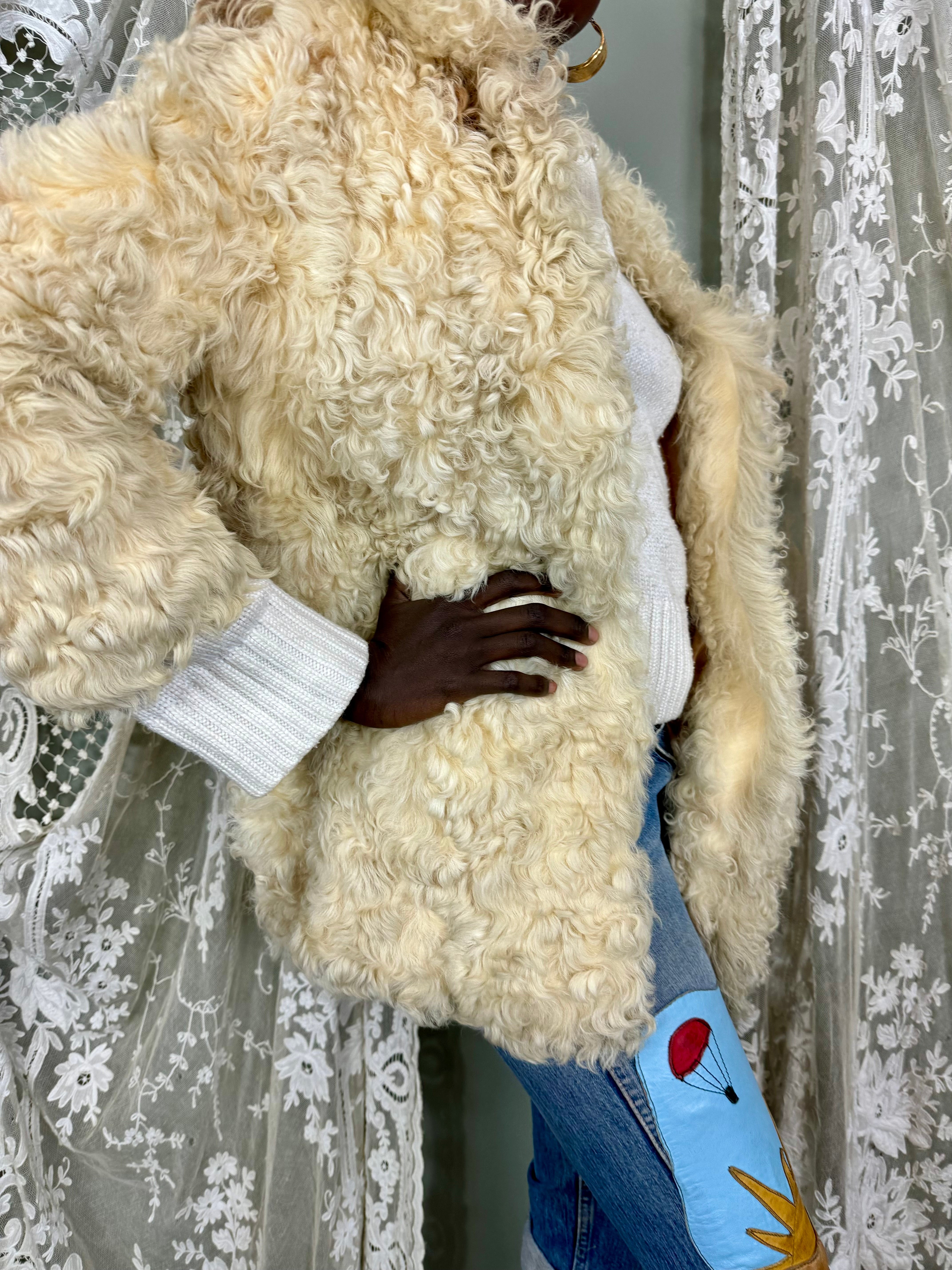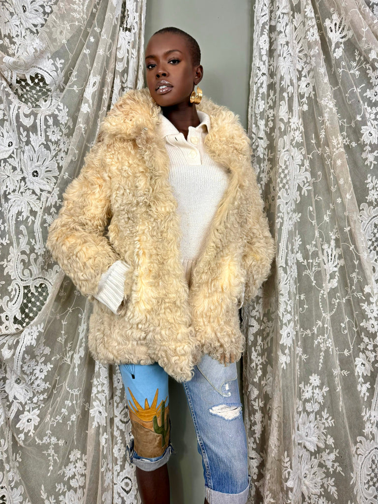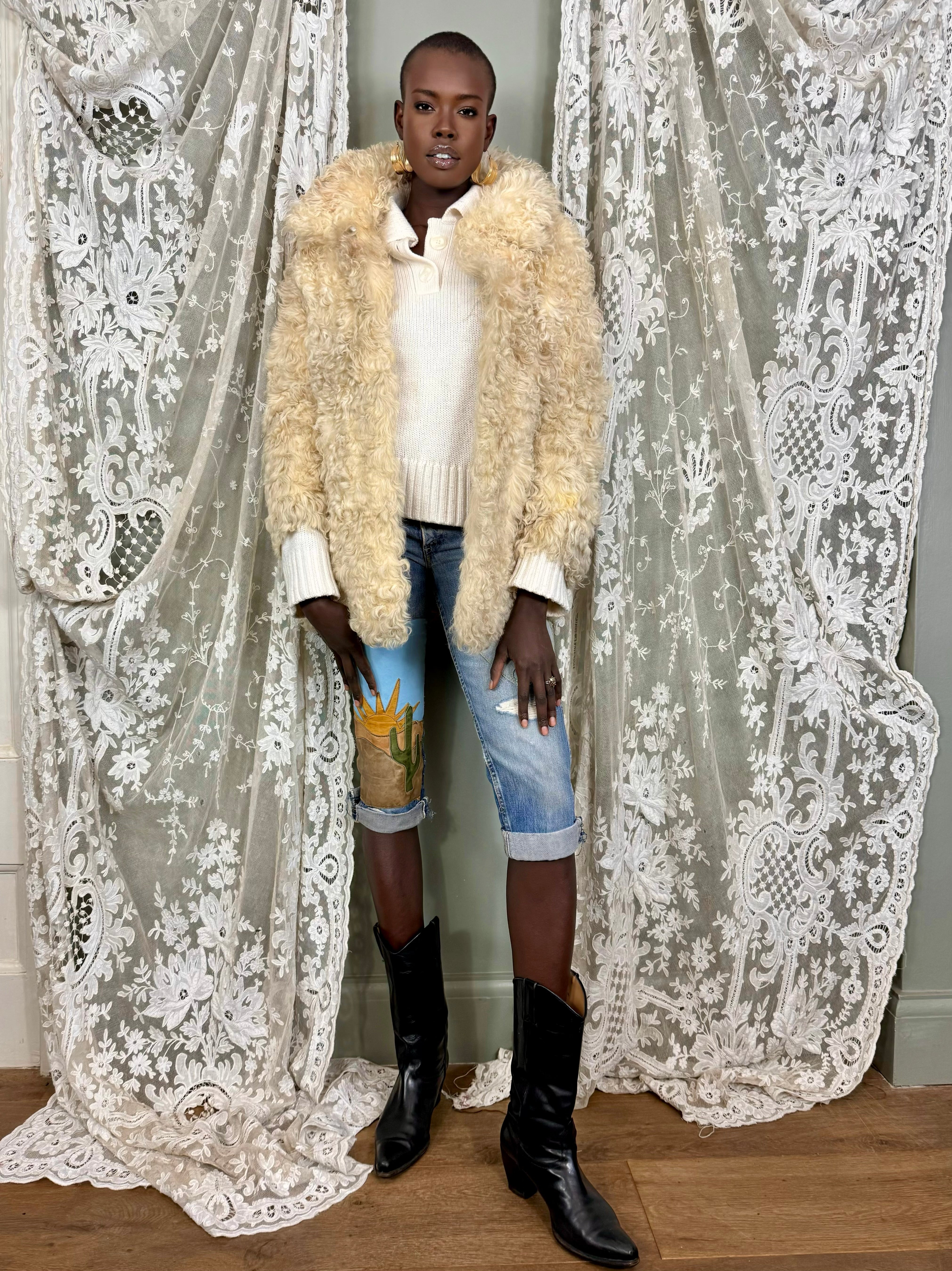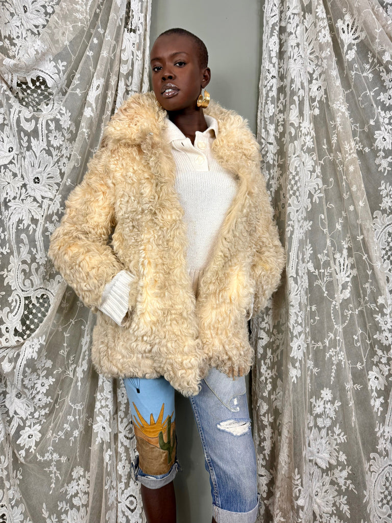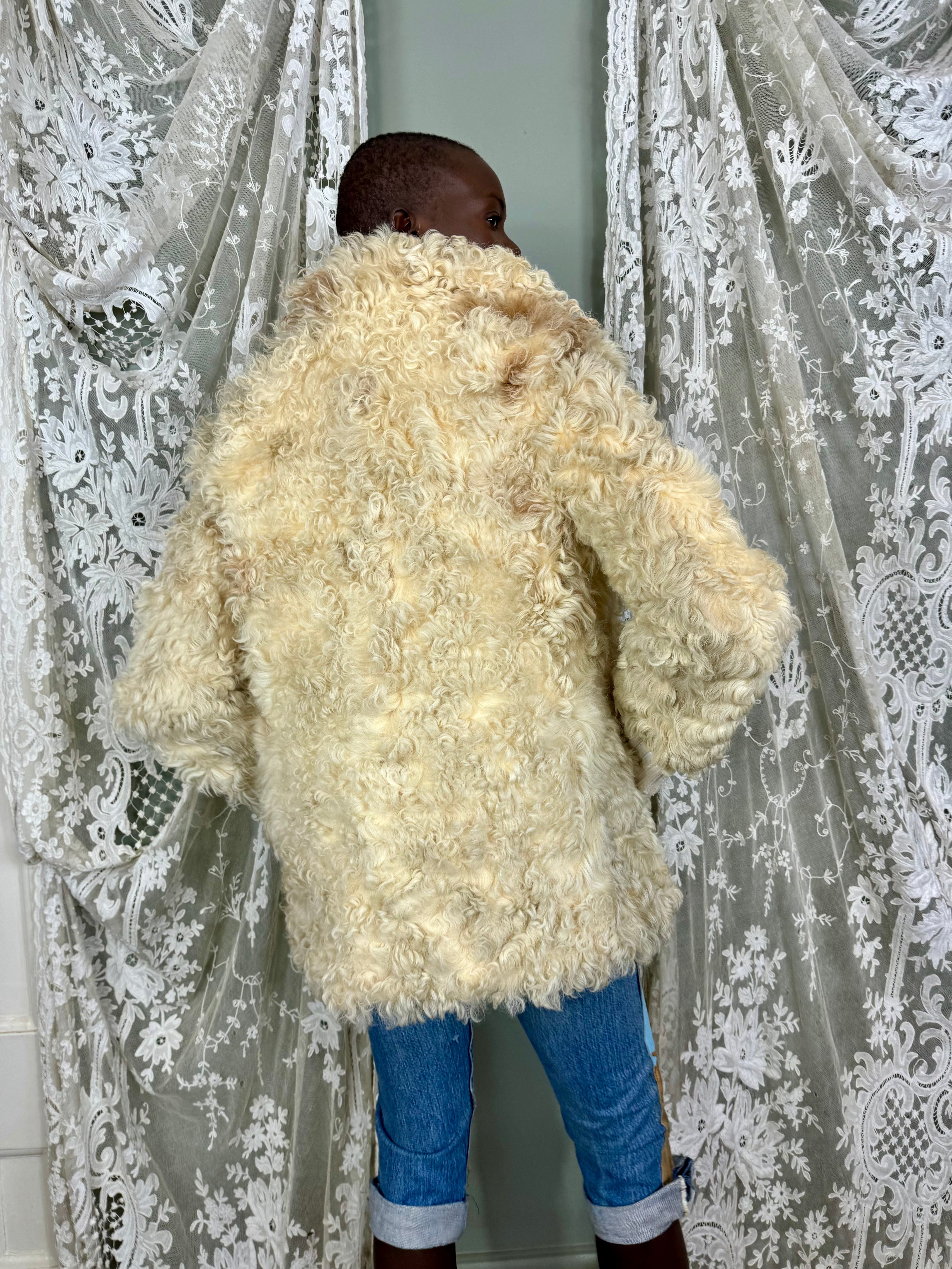 This cream 70s original sheepskin jacket boasts a gorgeous aesthetic with its collar, long sleeves, and straight fit. Made from authentic sheepskin, it provides warmth and comfort during chilly weather.Has side pockets and the fully lined interior adds an extra touch of luxury. Elevate your wardrobe with this vintage piece.