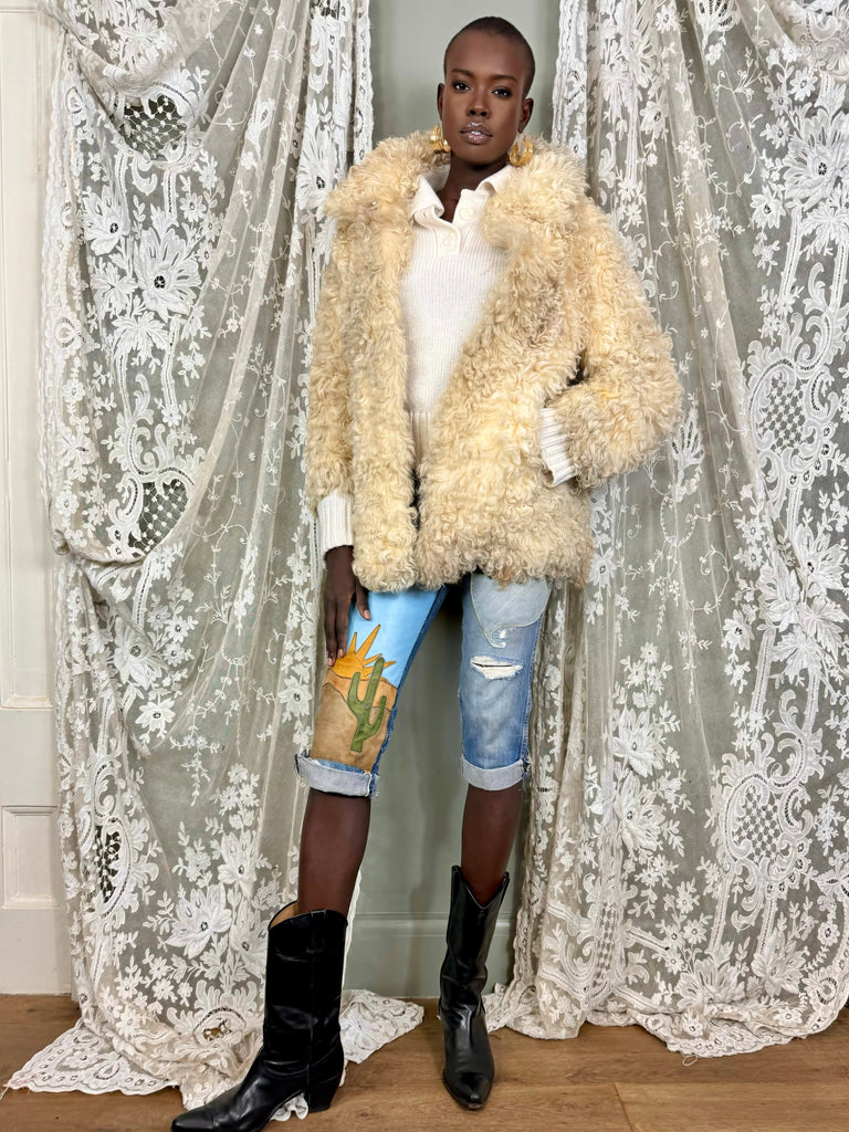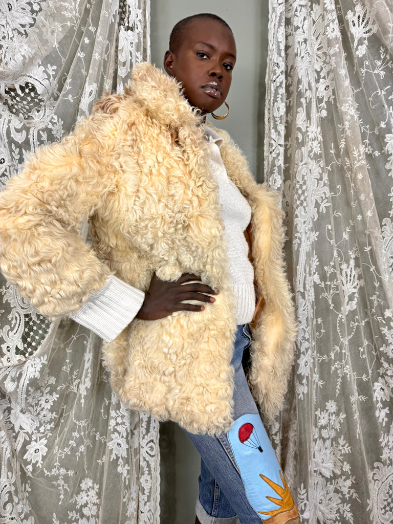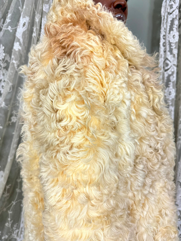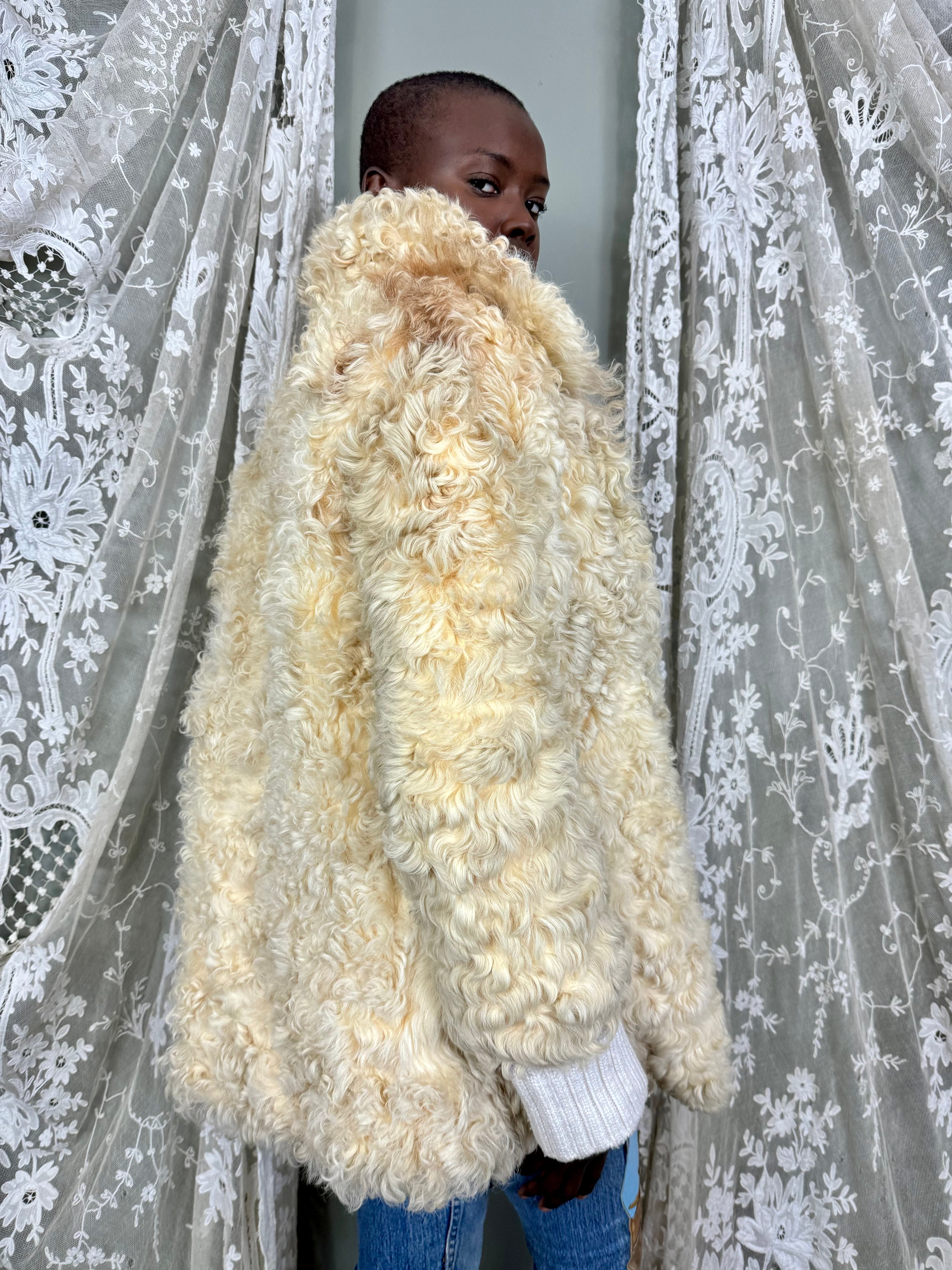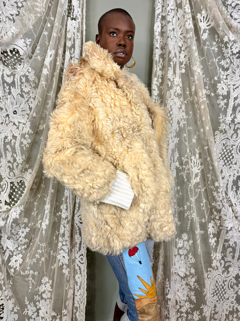 This cream 70s original sheepskin jacket boasts a gorgeous aesthetic with its collar, long sleeves, and straight fit. Made from authentic sheepskin, it provides warmth and comfort during chilly weather.Has side pockets and the fully lined interior adds an extra touch of luxury. Elevate your wardrobe with this vintage piece.