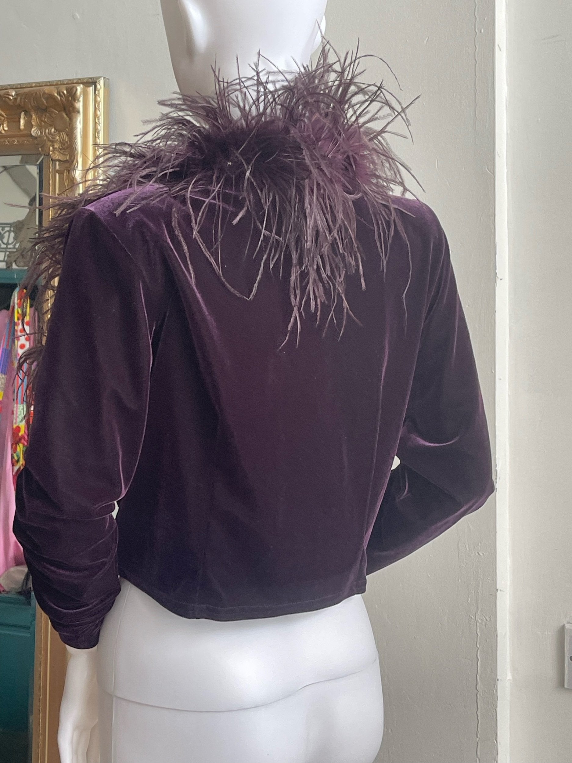 Velvet jacket will fit up to size 16 super stretchy model UK8 here will be a lot fitted on UK size 16 in a plum colour with thick Maribou feather good condition.