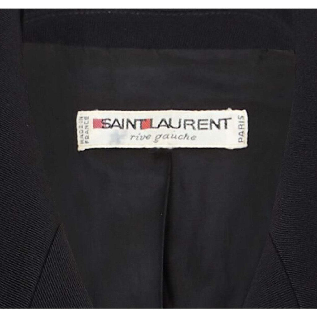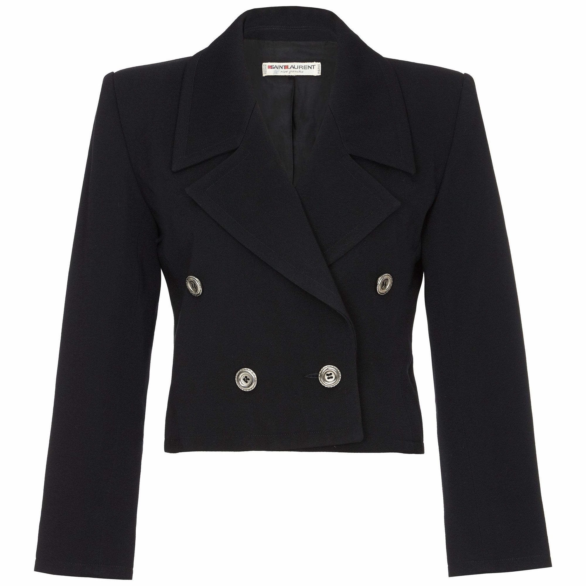 This striking Yves Saint Laurent 1990s black double breasted short cropped jacket is of superb quality and in excellent condition. The slick tailoring and stylish crop of the cut make this wonderfully diverse jacket truly desirable. The wide set peak lapel forms a plunging V at the neckline and alluring open fold at the bust. The jacket fastens at the front right with a double button stand hosting 4 x silver tone buttons. The buttons at the top of the stand are spaced further apart than those below, and positioned just below each breast. The long sleeves brush the back of the hands and are embellished with a smart run of 3 x matching silver buttons on each cuff. The fine wool fabric is sharp and crisp with no visible signs of wear and the jacket is fully lined in black silk. This wonderfully chic jacket presents beautifully as both a formal and informal piece of attire. Would best suit US size 8, UK size 12.