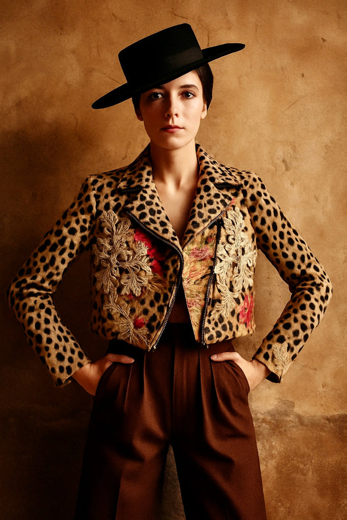 Fulcrum, leopard print long sleeve biker jacket with origin lace and embroidery