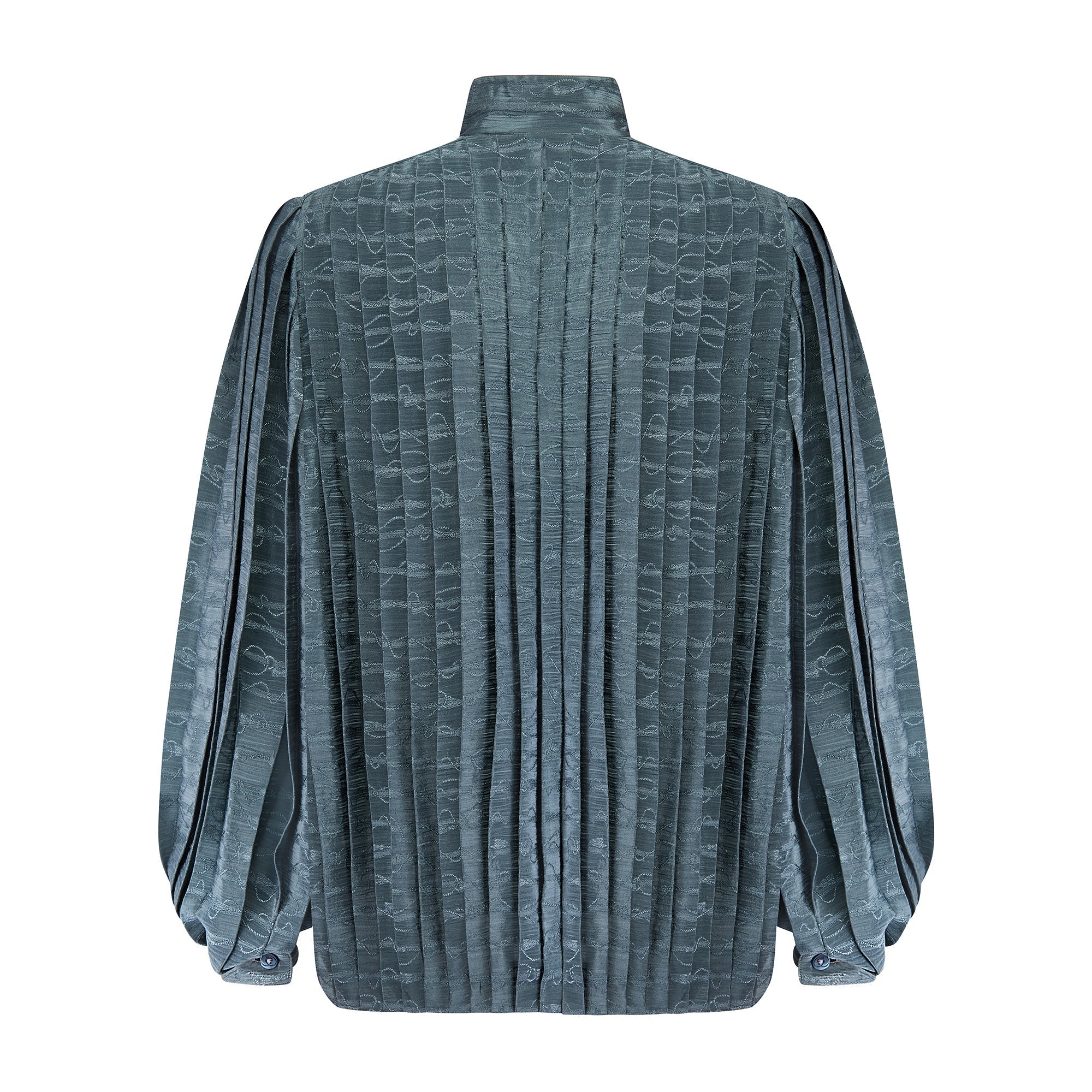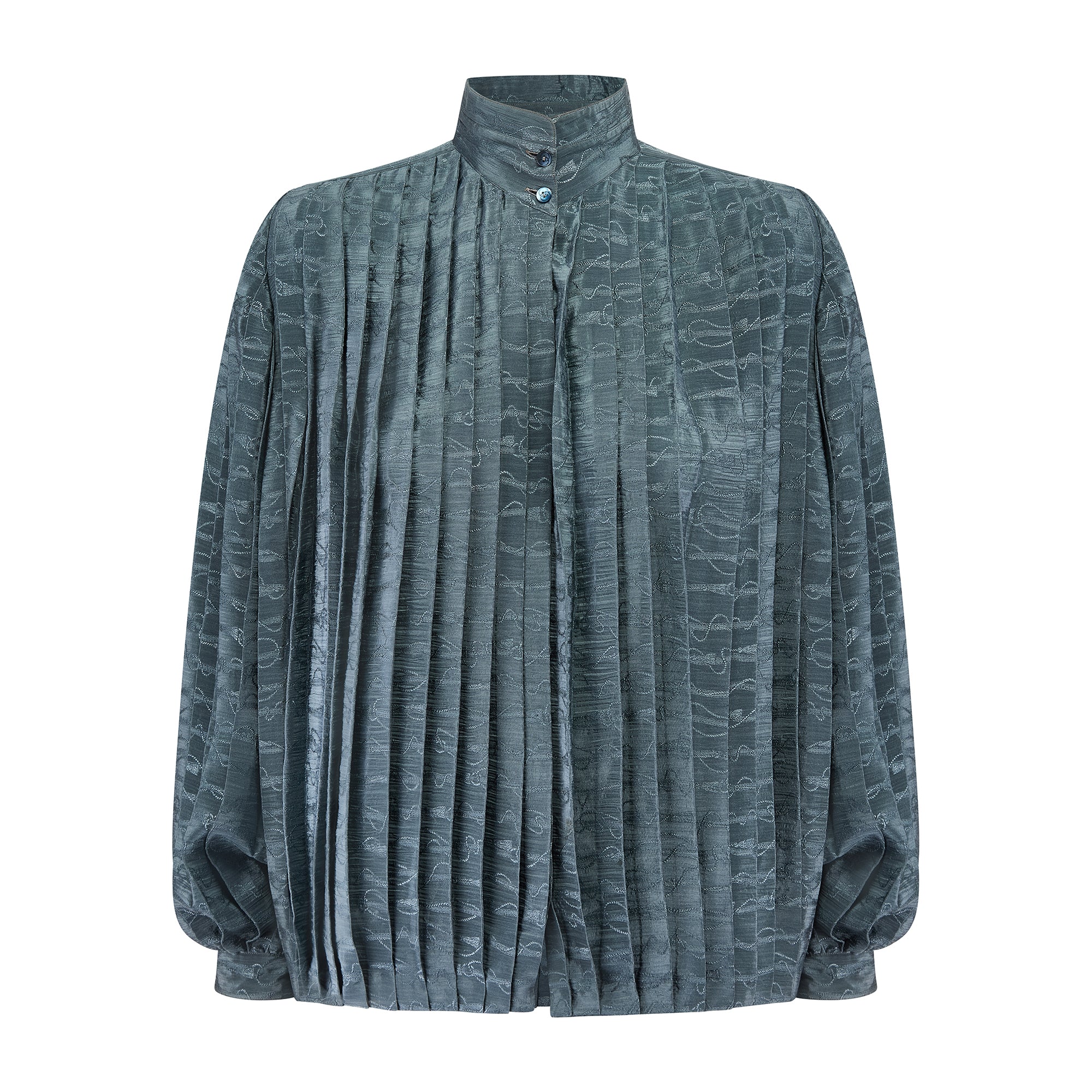 This exceptional 1980s Gucci teal silk shirt is from the Gucci family’s heyday of running the Italian fashion super brand. Tailored from jacquard silk, it is woven with a pattern of horse bits and lead rope - harking back to Guccio Gucci’s fascination with equestrian-wear in the brand’s early days. Today, the horse bit is synonymous with the label. This theatrical shirt is generously tailored to a blouson, voluminous fit and is box pleated all-over. It has a high Mandarin collar with two mother-of-pearl buttons engraved with the Gucci double-G logo. There are matching buttons down the front, hidden under the placket. The cuffs of the bell-sleeves are secured with a single, engraved pearlescent button. The original label dates this piece to the very late 1970s and early 1980s and reads “G. Gucci”, alongside the original Gucci crest - a wonderful addition to the wardrobe of collectors of early Gucci. The shirt is unlined.
