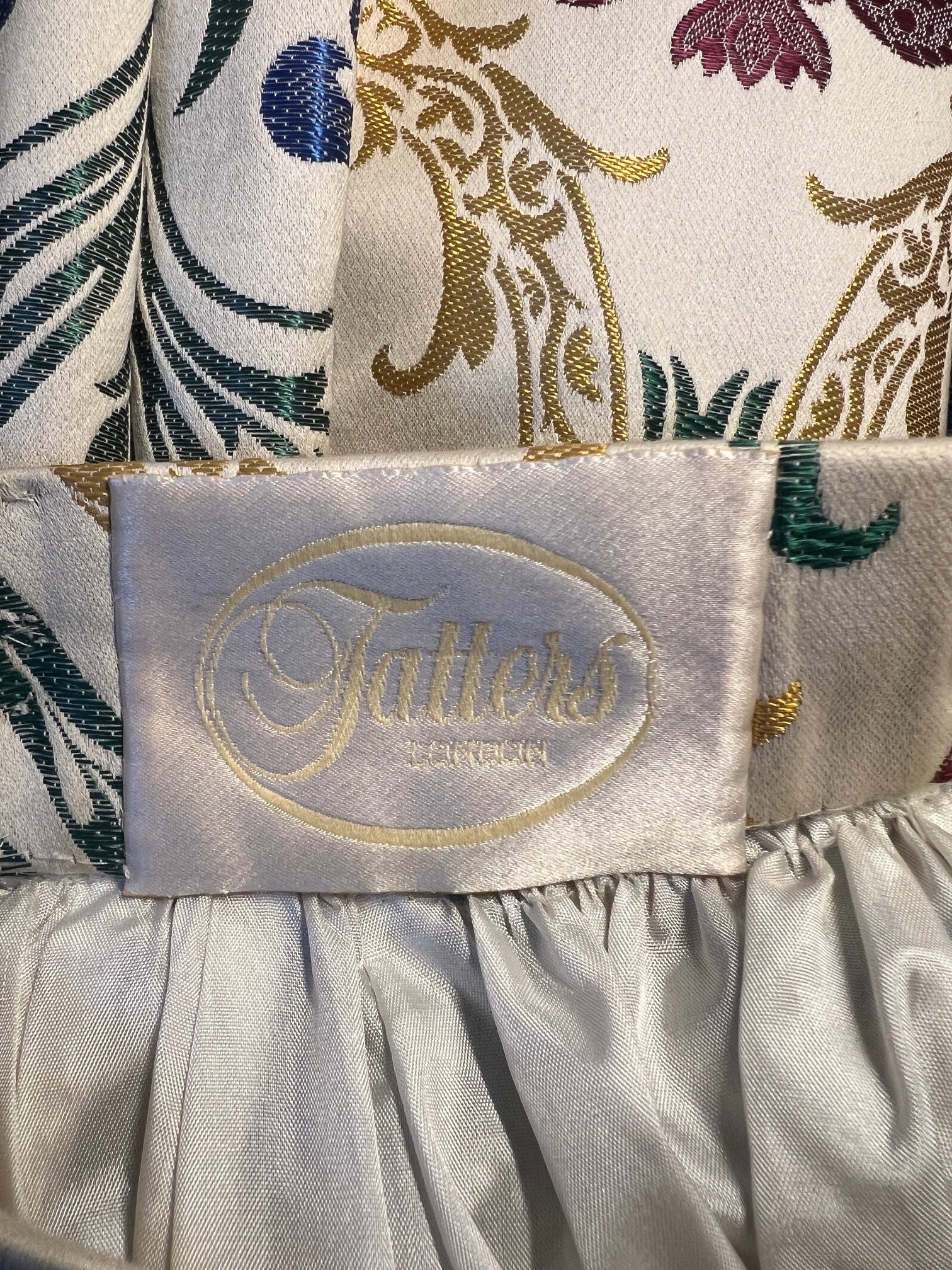 A weighty, intricately-constructed skirt with the outer layer composed of a stiff silk jacquard patterned with an opulent heraldic print in sapphire blue, emerald green, golden yellow and ruby red. The pattern is detailed with crowns highlighted with metallic gold thread that catches the light. It has a thick waistband which gives way to wide pleats which fall softly down the length of the voluminous skirt to the ankles. Four layers of tulle ensure this skirt holds its very full shape. Under the layers of tulle, it is fully lined with cream satin to ensure a comfortable wear. The original label reads “Tatters London” in gold font on cream cloth. It fastens at the back with three large hook-and-eye clasps in the waistband and a hidden zip down the skirt.