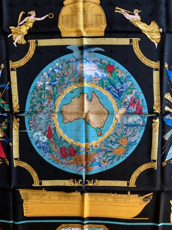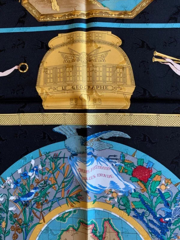 1992 Hermès Black “Geographe” by Sandra Laroche Silk Jacquard Scarf