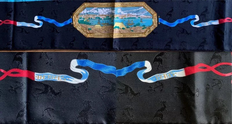 This rare original issue "Le Geographe" vintage Hermès silk jacquard scarf was designed by Sandra Laroche, an Australian artist. The scarf was only issued in 1992 and pays tribute to the 19th-century French exploration of Australia. On rare occasions, Hermès would print a special design on jacquard, a raised woven, not printed, pattern which adds a luxurious feel. In this case, the jacquard pattern reveals anchors and kangaroos. This scarf in a black colourway is in excellent vintage condition with no issues. With a Hermes scarf box.