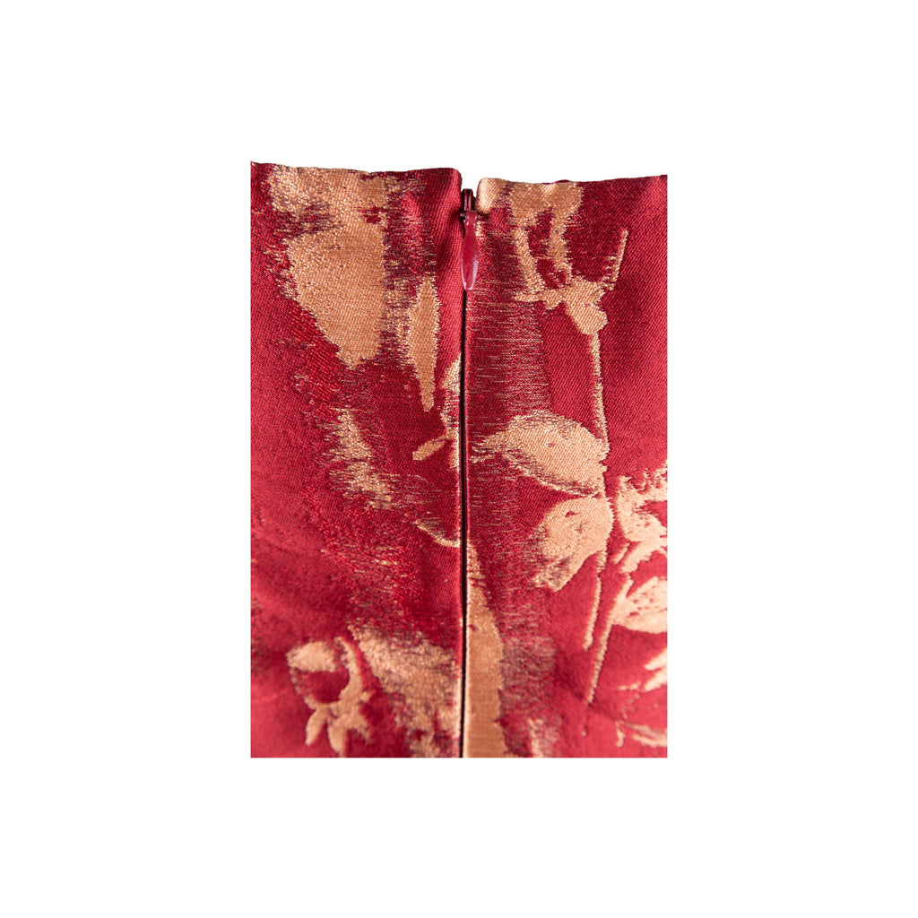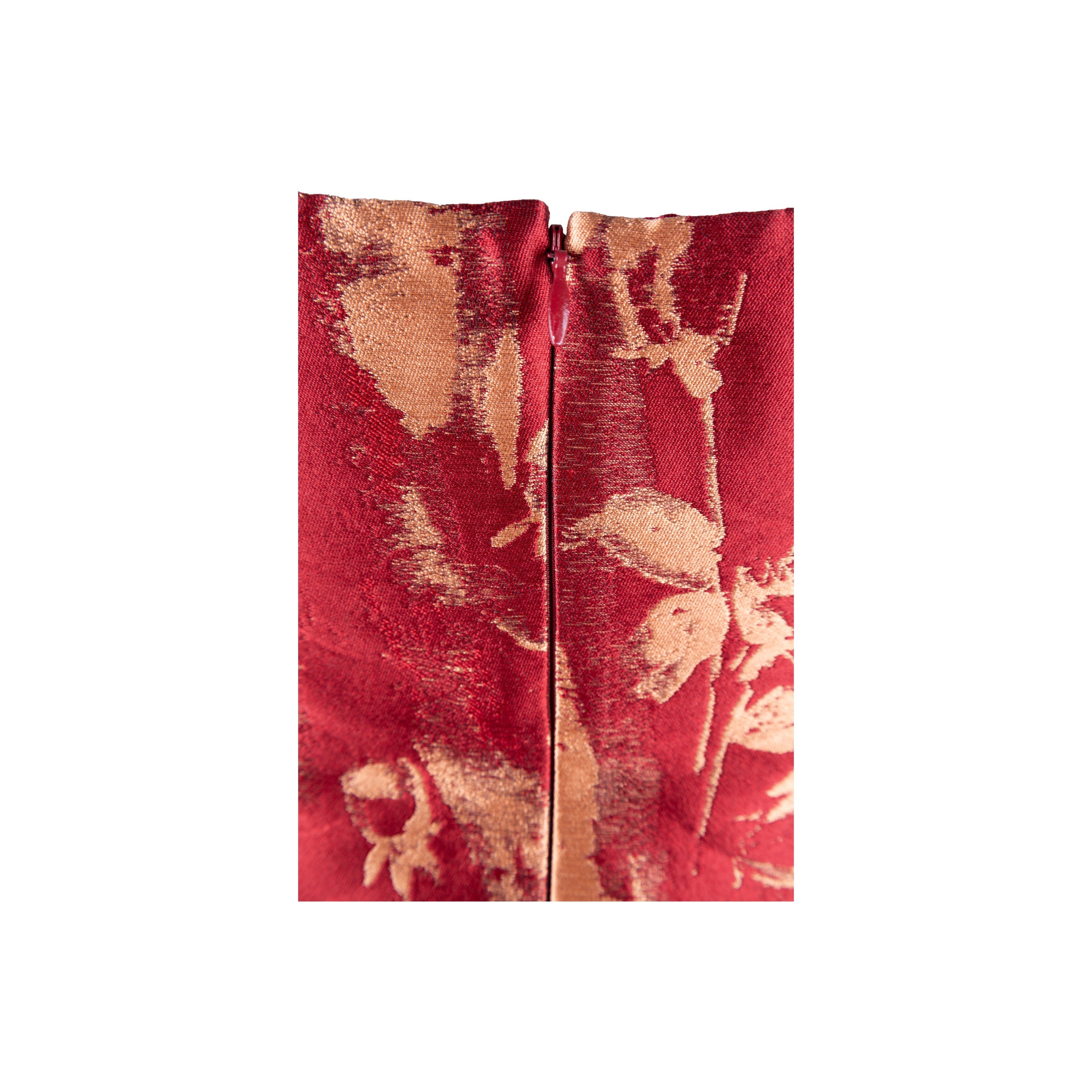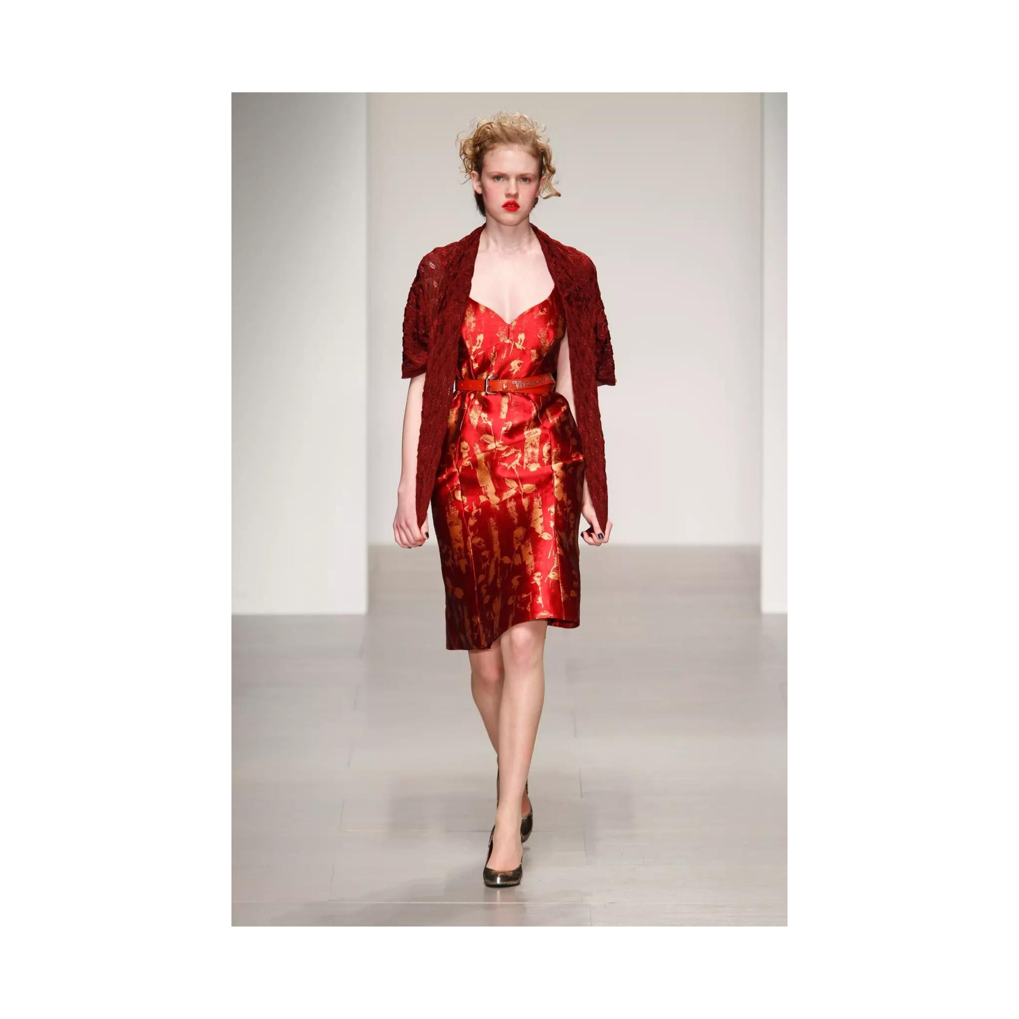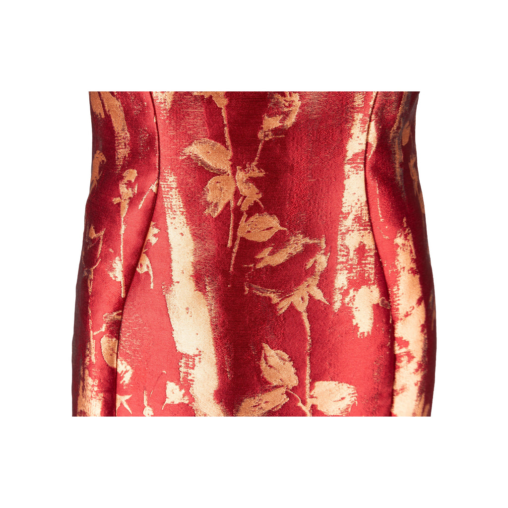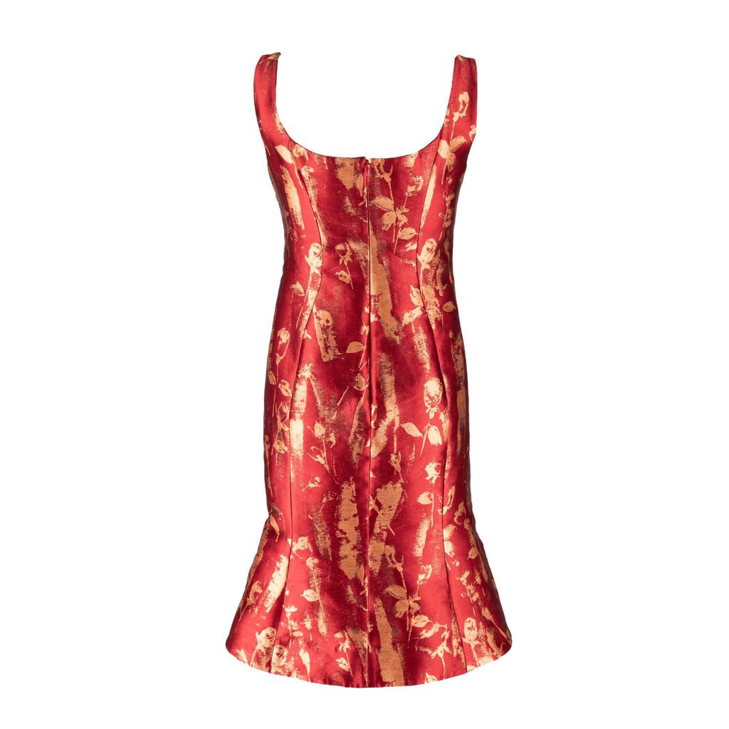 The Vivienne Westwood Red Label Jacquard Silk Dress is from the Fall/Winter 2014 Runway and is perfect for any special events. Crafted with a luxurious silk in red with abstract floral pattern in golden, this sleeveless dress features a V-neck, concealed zip closure, and pleats that create a flattering A-line silhouette.