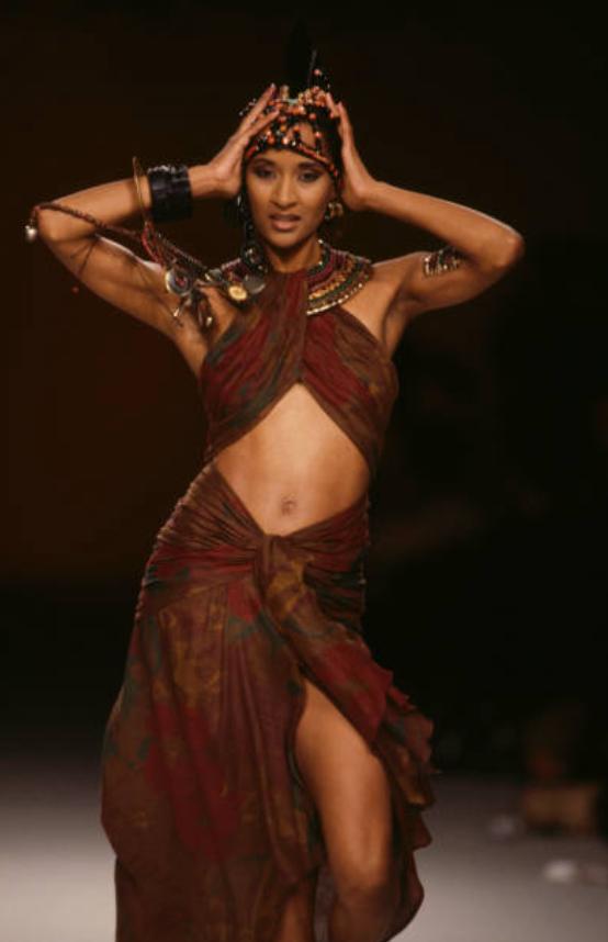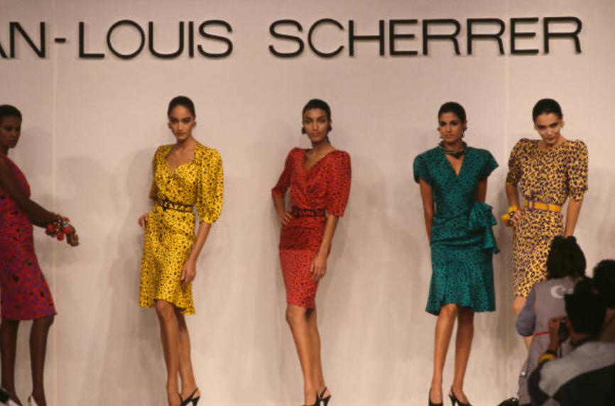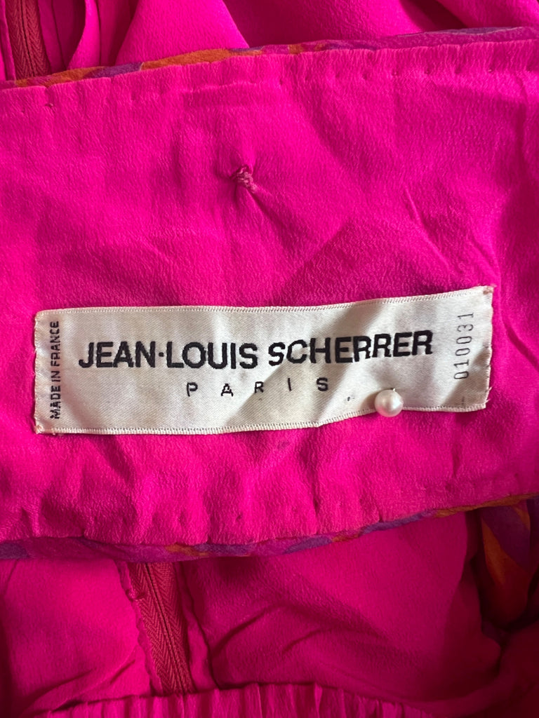 French couturier Jean Louis Scherrer trained at the House of Dior until the late 1950s. In 1962, he opened his eponymous couture house going on to dress some of the wealthiest women in the world in his elegant eveningwear. We believe this dress was designed in the 1980s, before the designer left his eponymous fashion house in 1992. After extensive research, we have found a very similar runway design which references the draped silhouette and a similar fuchsia leopard print in the Spring ready-to-wear 1987 collection (pictured above). Very similar leopard print fabrics were also used by Yves Saint Laurent for his haute couture collection in 1987. Master couturiers would often mix design elements to create bespoke pieces for the most prestigious haute couture clients. This dress was recently worn by actor Amelia Gething for a private event and she wore it backwards to amazing effect!