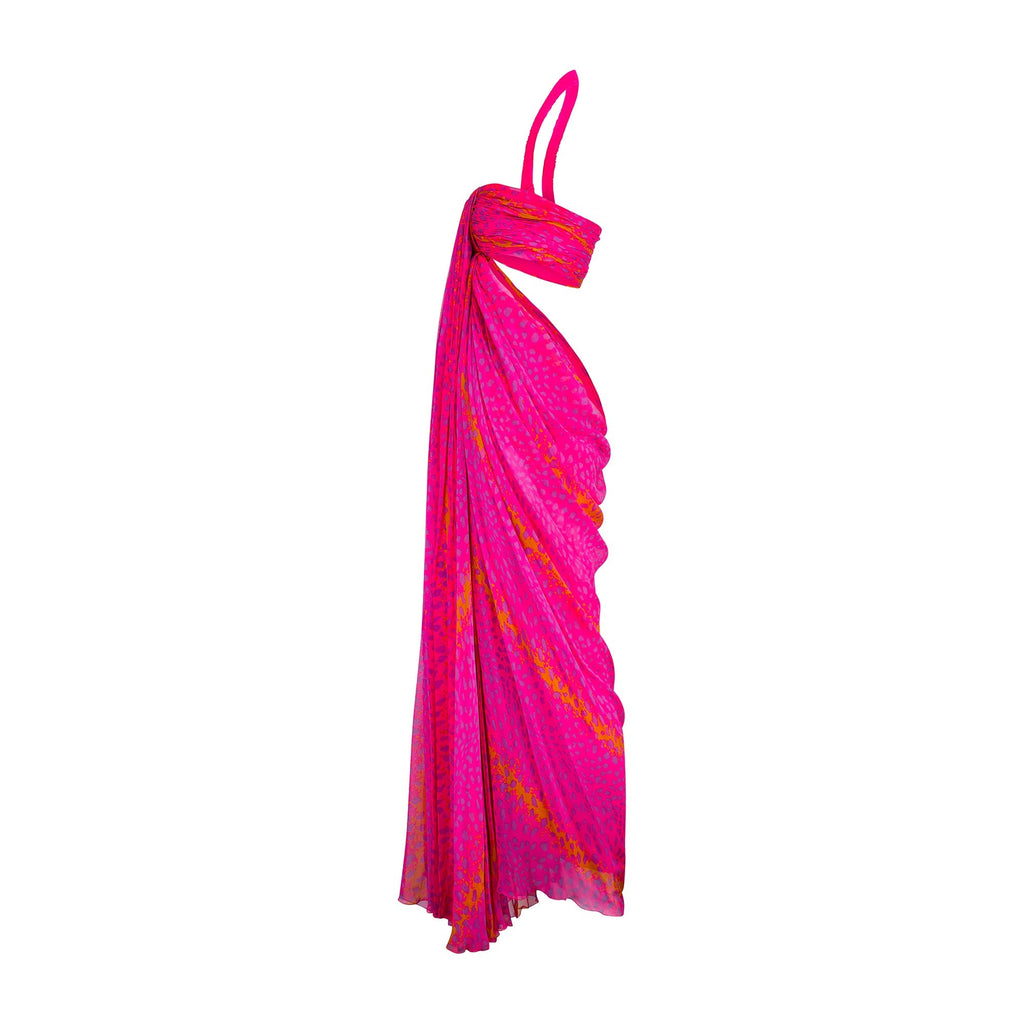 The dress is tailored from incredible fuchsia, almost neon hued leopard print silk chiffon - still as vibrant as the day it was made 30 years ago. The skirt is draped in a tulip style which gathers around the sides of the hips like layers of petals. There is a bandeau crop-top which attaches to the skirt on one side. Above this, a long shawl of leopard silk attaches to the top of the bandeau with a row of snap closures - this can be removed, worn around the shoulders or cascading down the dress. The dress is fully lined with fuchsia silk. The bust is boned and detailed with an internal modesty strap wrapped in fuchsia silk. The top of the skirt is also boned, securing the draped fabric around the hips and waist. The dress fastens with a hidden tonal zip and hook-and-eye clasp inside the panel that joins the bust and skirt.
