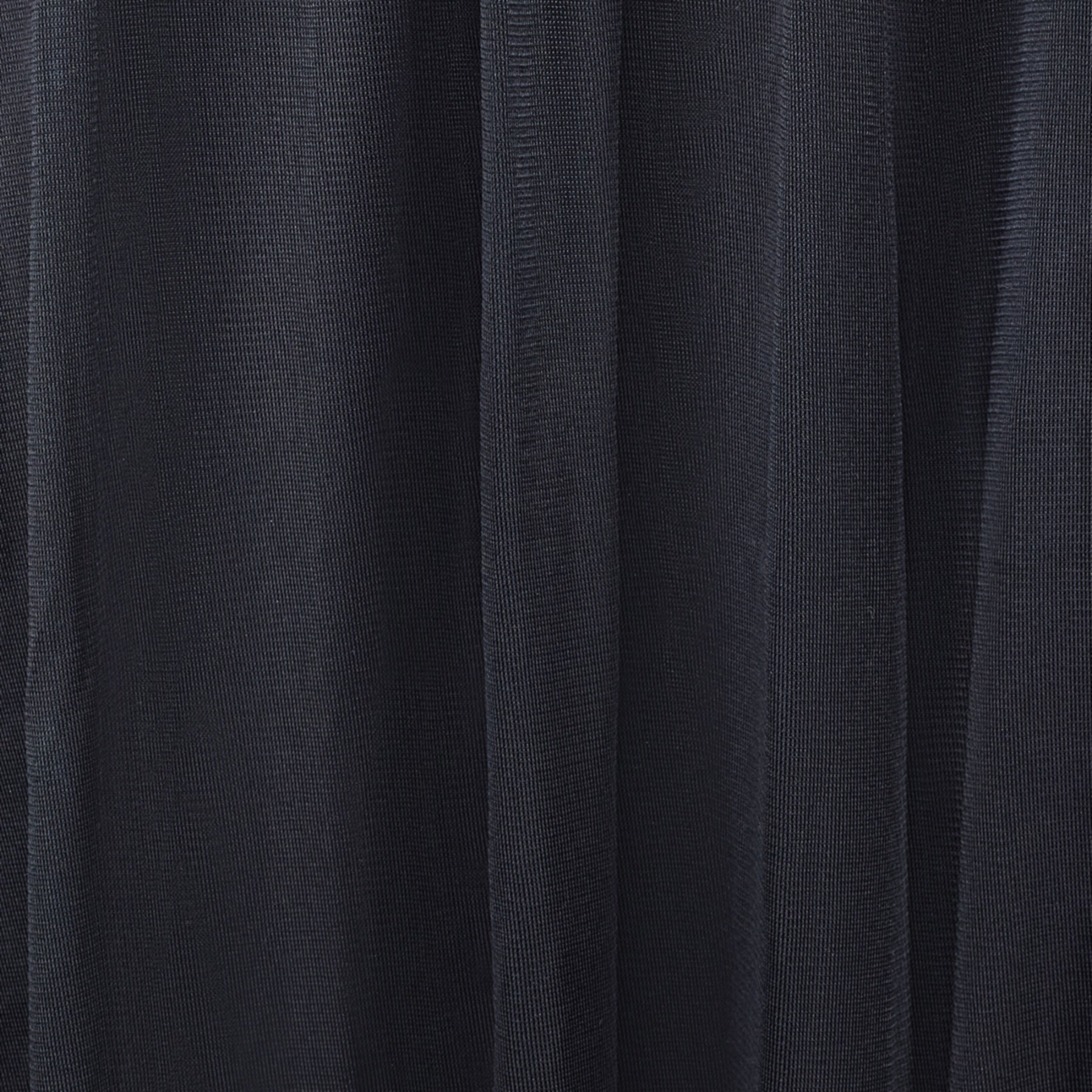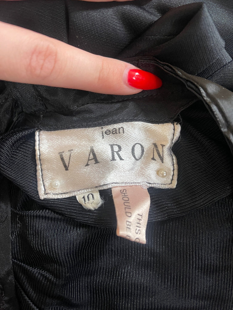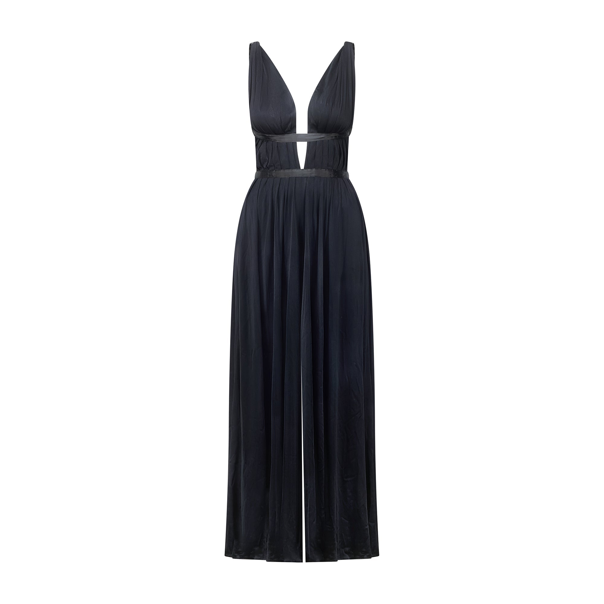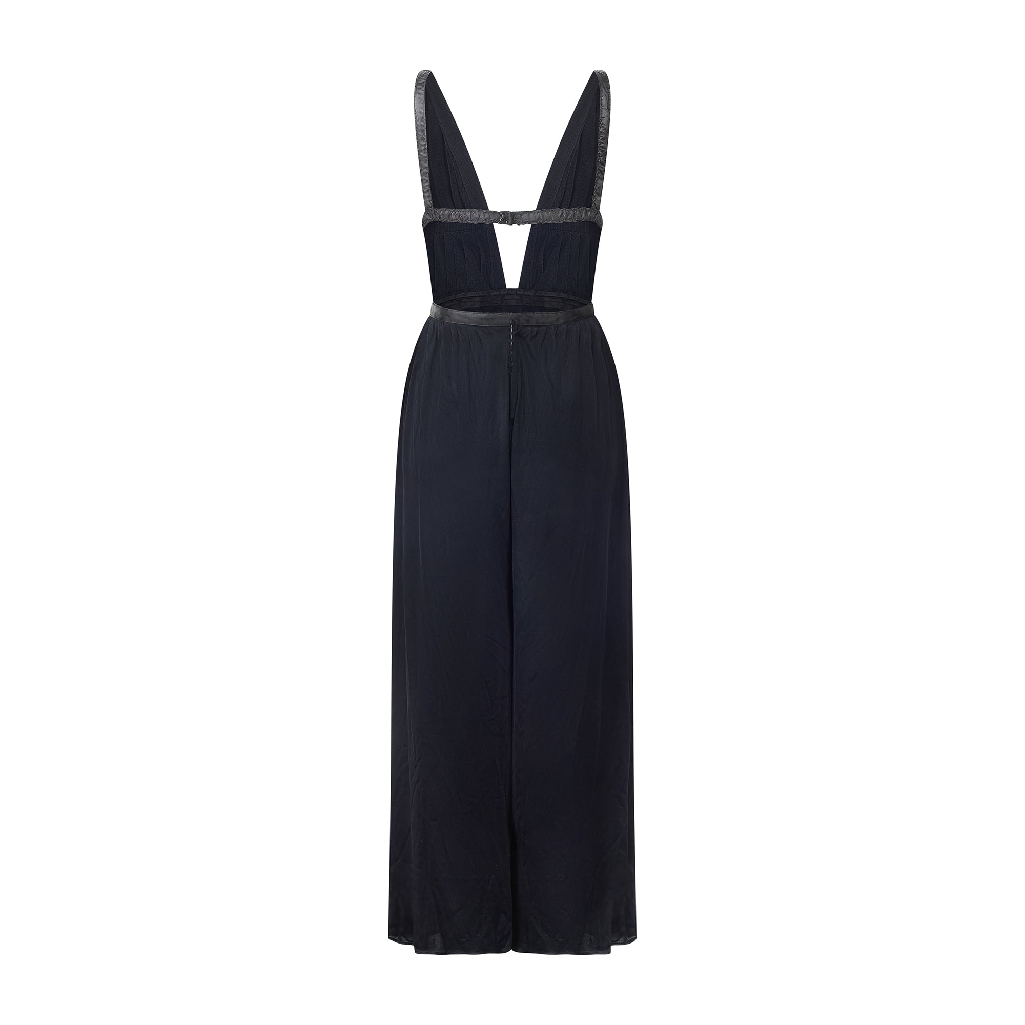 A very striking Jean Varon black jumpsuit which dates to the early 1970s but has a surprisingly contemporary design. It is crafted from a fluid, shiny black jersey with a hint of stretch and falls to the ankle. Generously cut, the wide-leg trousers swirl around the wearer and are pleated where they hit the waistband. The top has a low-cut silhouette with cut-out detailing; pleated panels of fabric cover the chest, crossed by bands of black satin. Across the open back, the bands of black satin become a bra-like formation of straps. They are lined with elastic and so are ruched and give a flexible fit. The straps fasten at the back with two hook-and-eye clasps and a snap closure. The jumpsuit also closes at the back of the waist with two hook-and-eye clasps and a hidden tonal black zip. It is unlined.