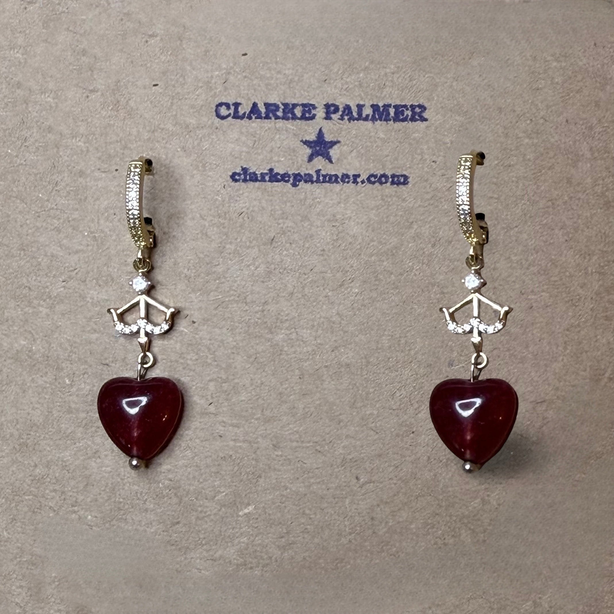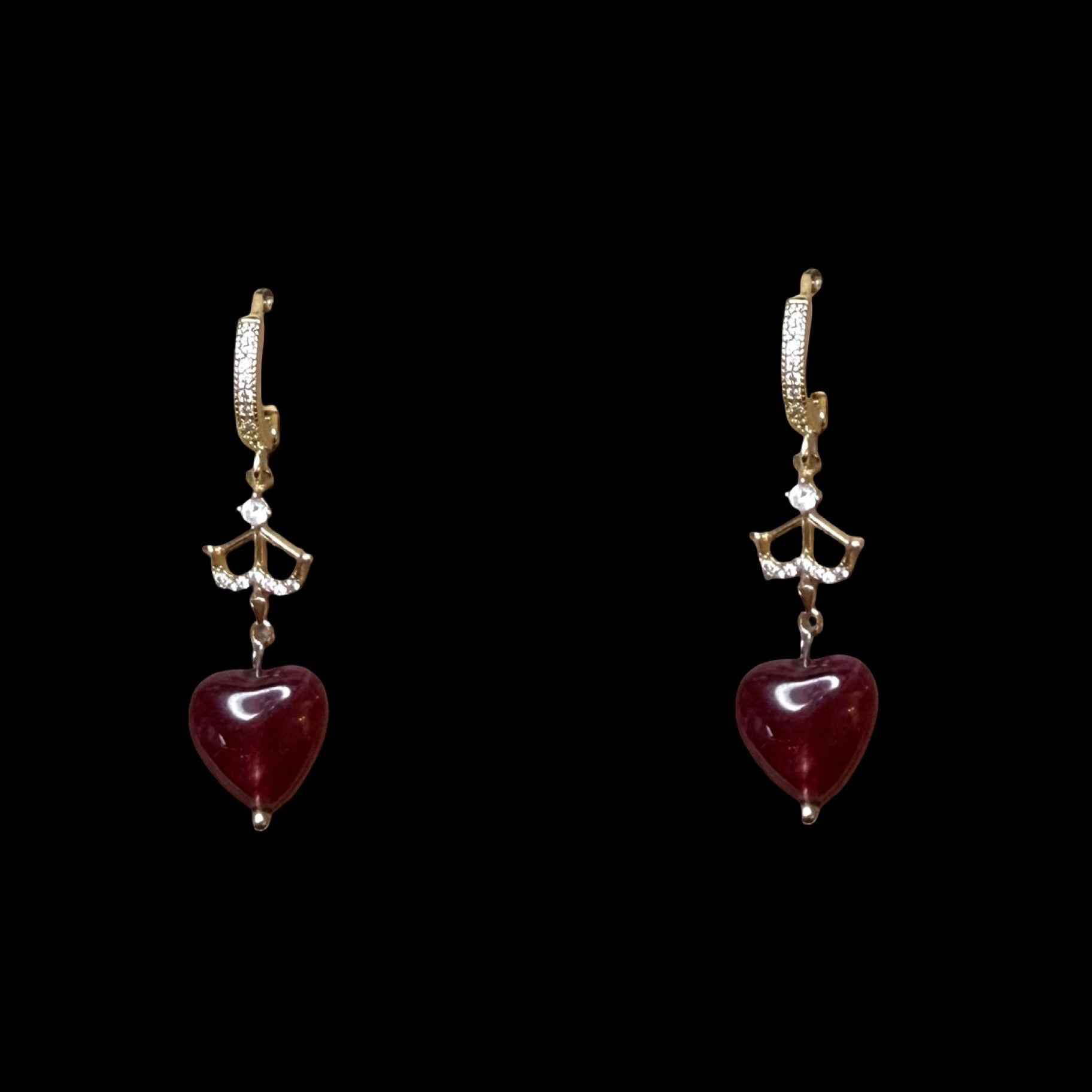 These gorgeous earrings are handmade from large smooth deep red Chalcedony Hearts hanging from 22 kt gold vermeil CZ bow & arrow charms. They make a perfect gift to your dearest friends and loved ones or for yourself.
