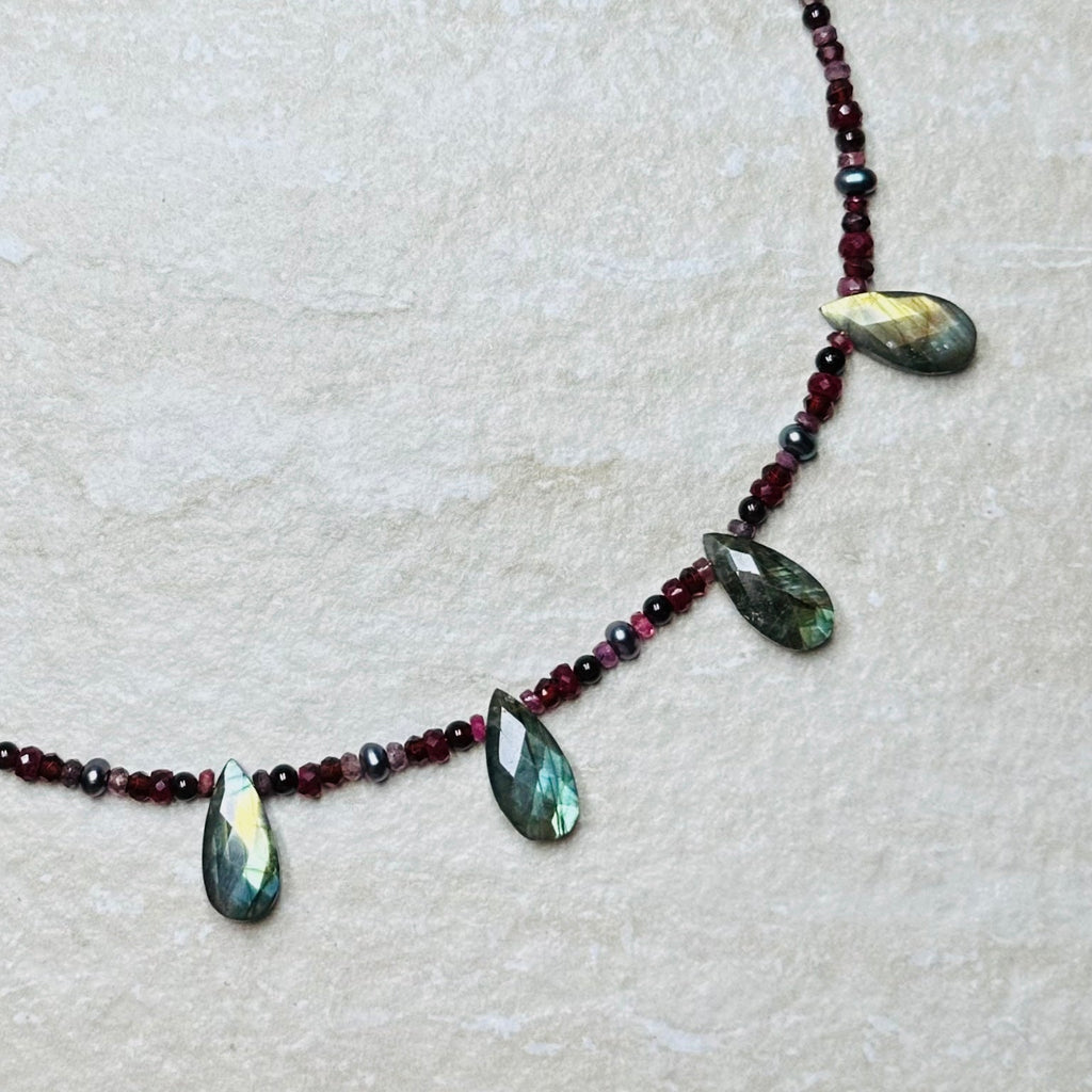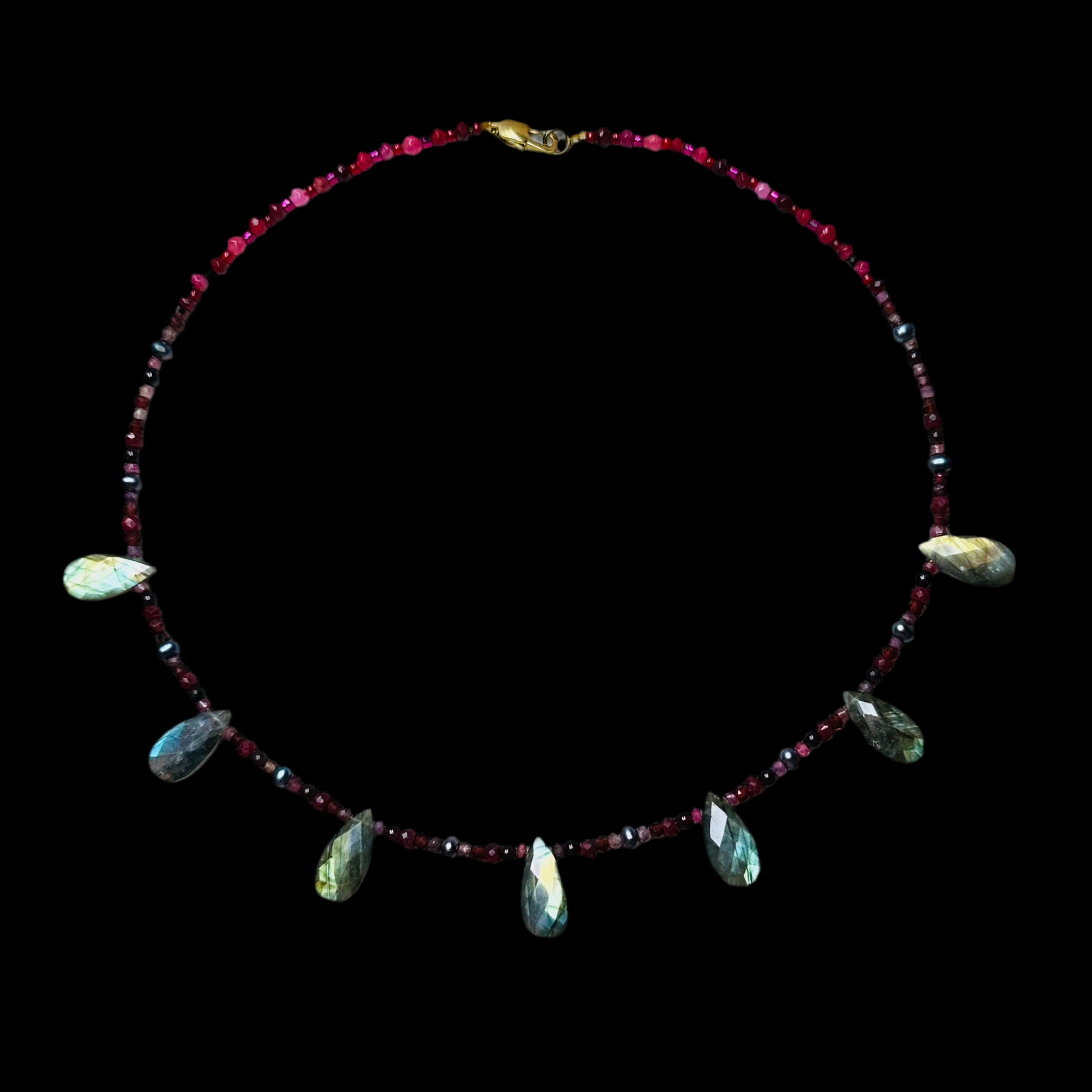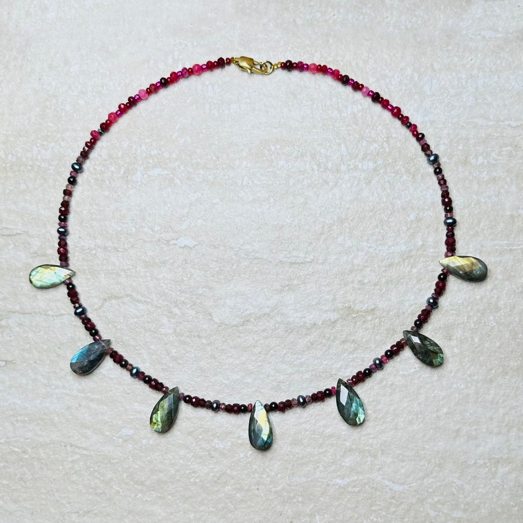 This stunning necklace is handmade from ruby, tourmaline and garnet rondelles with black pearls and centred by hand cut faceted labradorite briolettes.