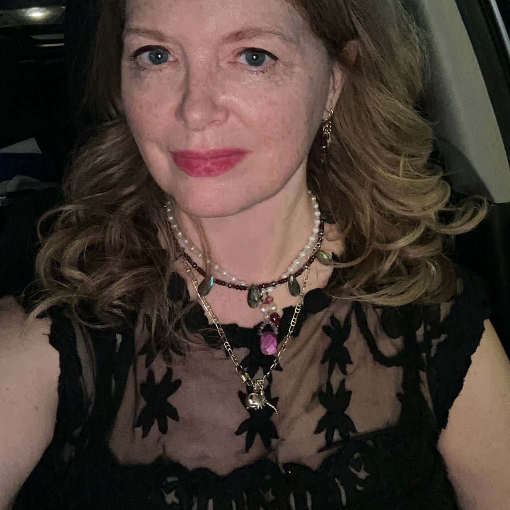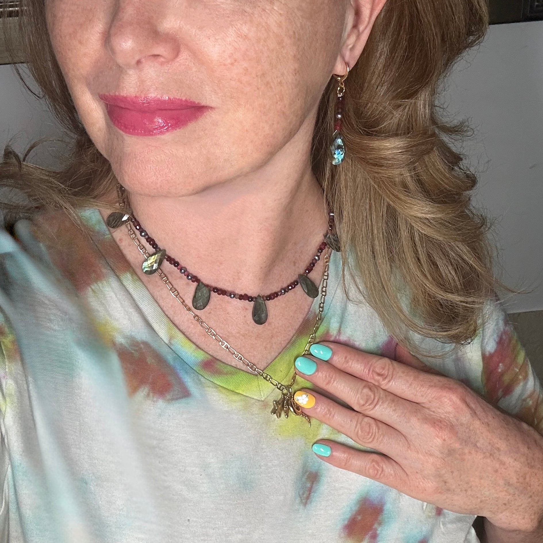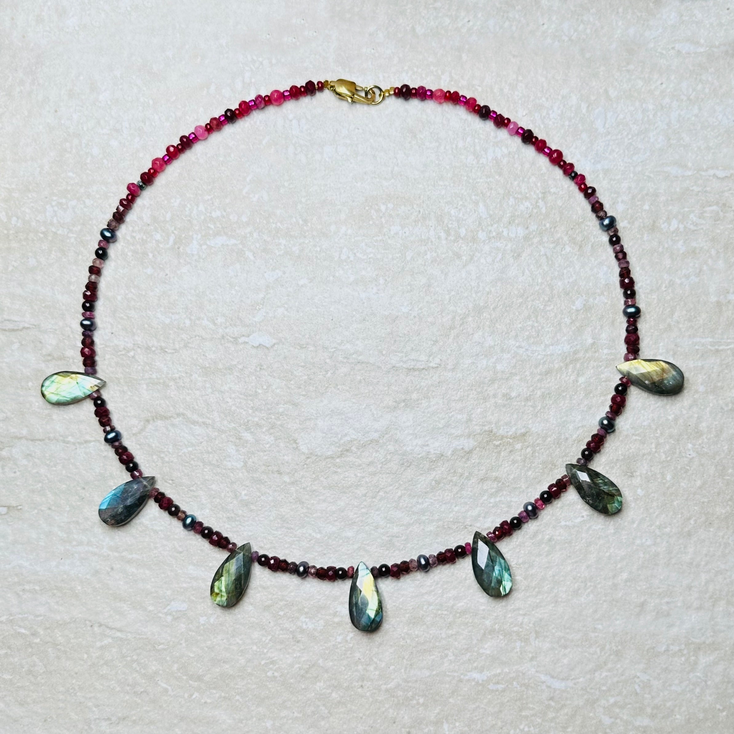 This stunning necklace is handmade from ruby, tourmaline and garnet rondelles with black pearls and centred by hand cut faceted labradorite briolettes.