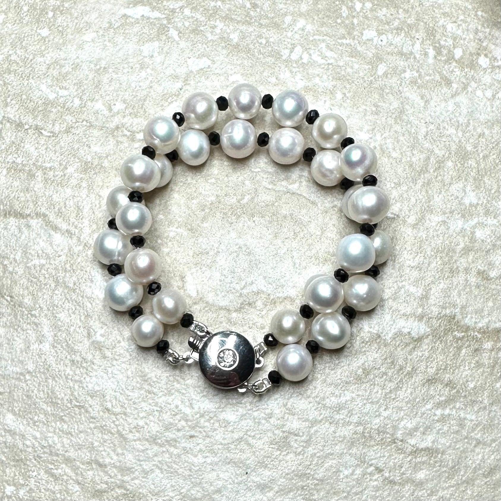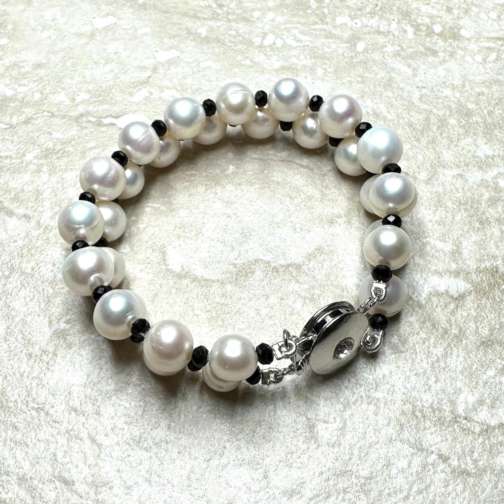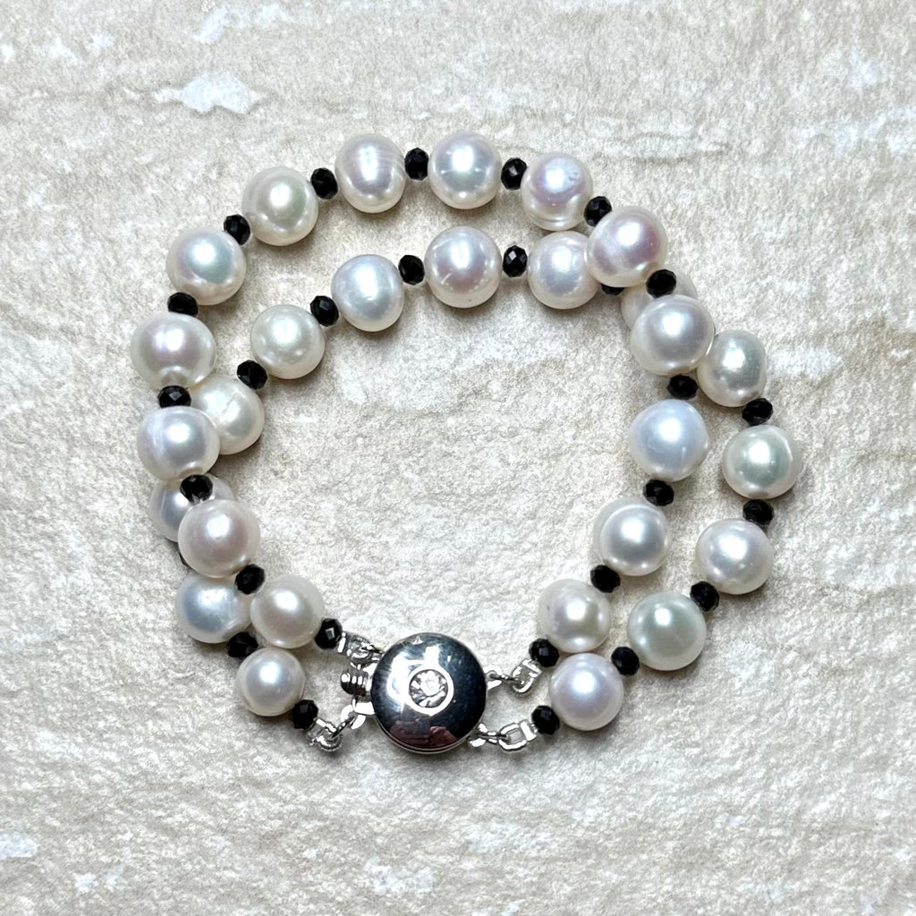 This stunning bracelet features beautiful large (8-9mm) ivory round pearls with 4mm faceted spinel rondelles. Choose single or double strand, your preferred length and clasp in either silver or 24kt gold vermeil in the options.