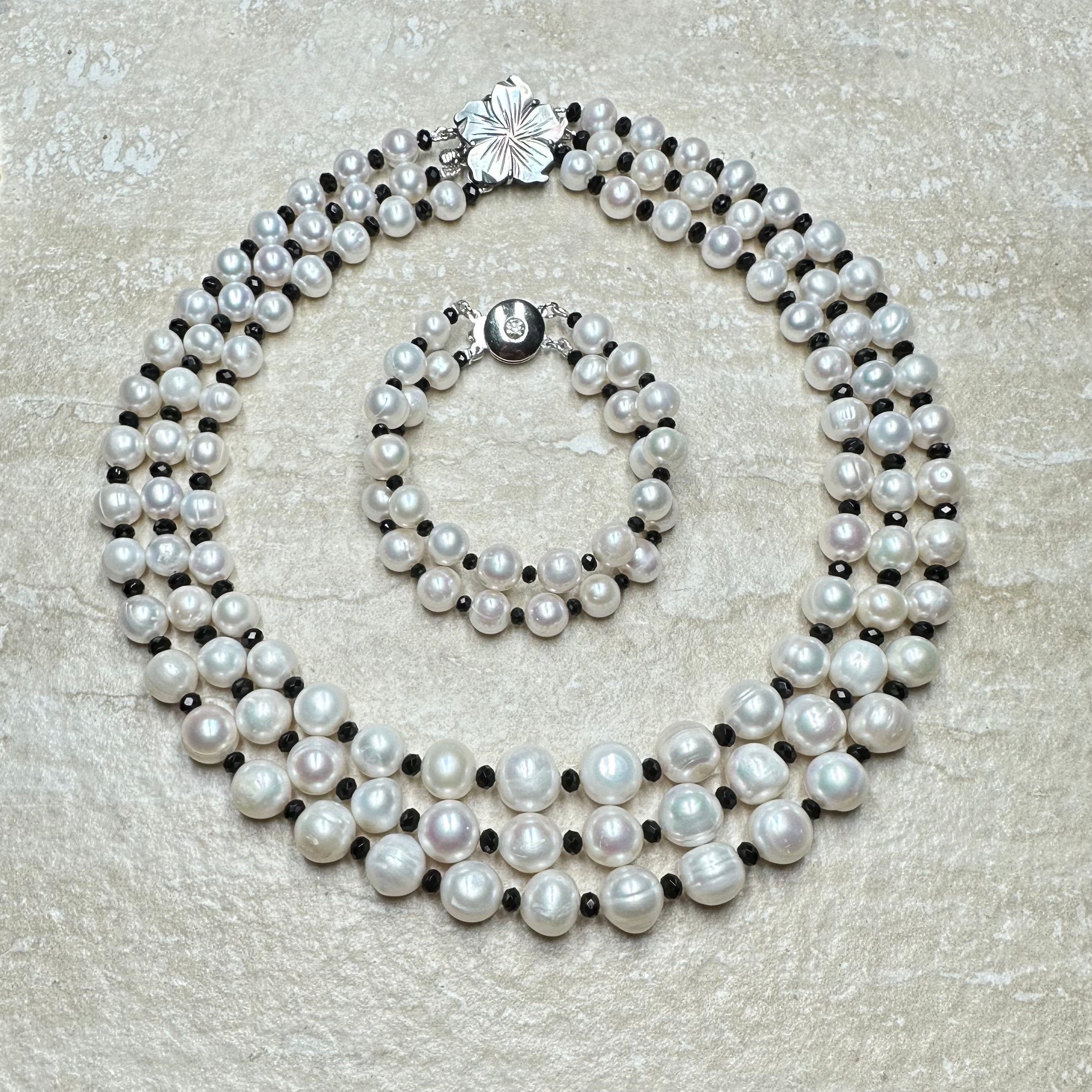 Matches our Marie Antoinenette black spinel and pearl necklace and also our double and triple strand large pearl and spinel chokers!