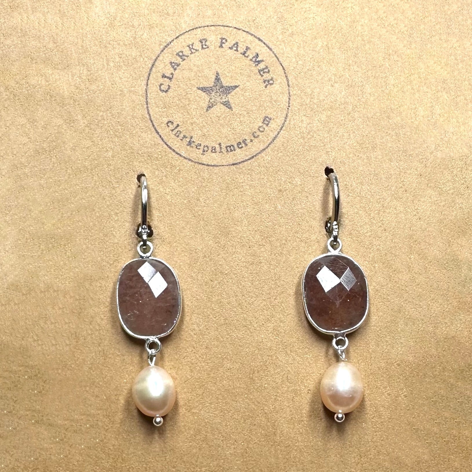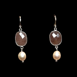 These beautiful drop earrings feature hand cut faceted strawberry quartz ovals set in silver with black pink  pearl. On silver plated huggie hoops.