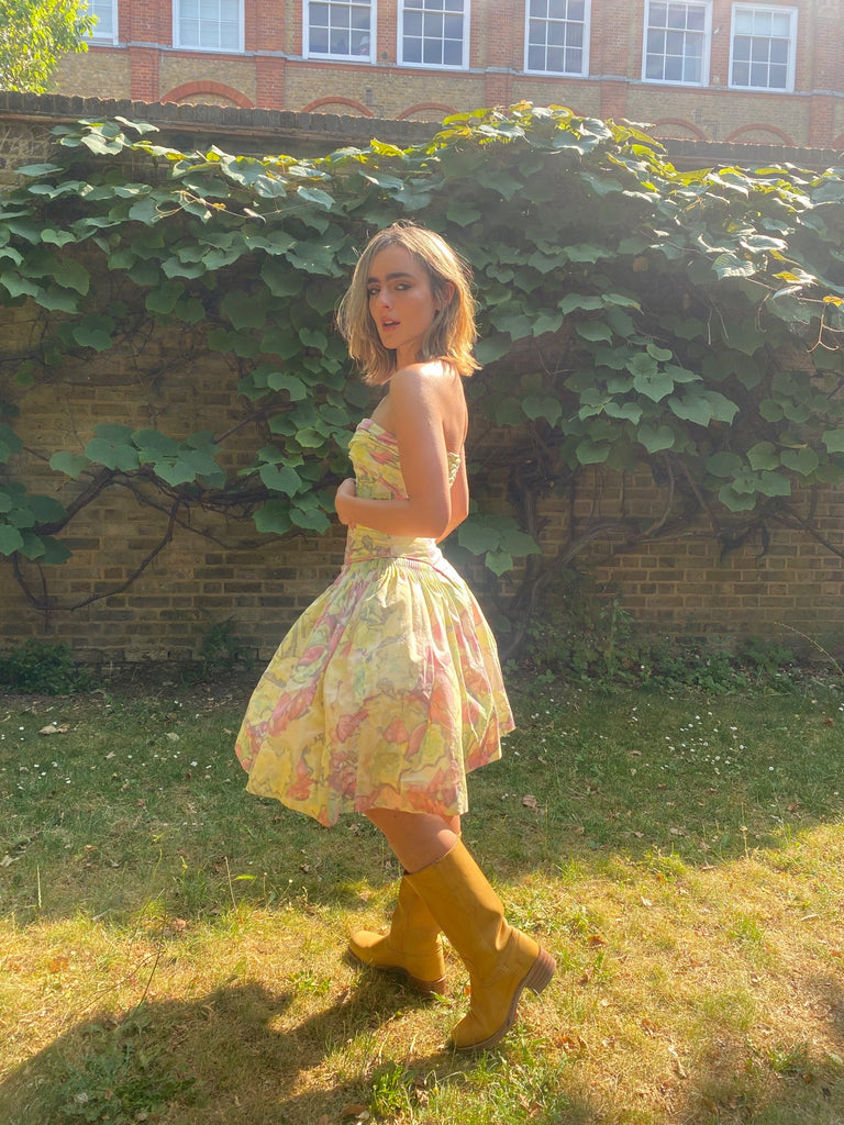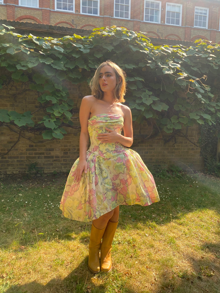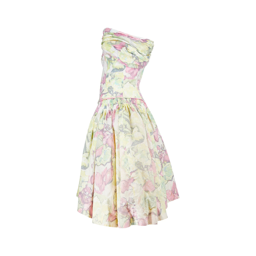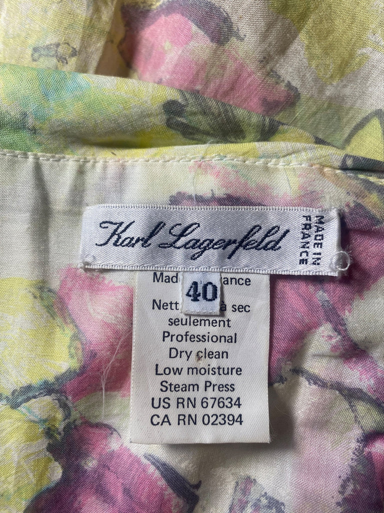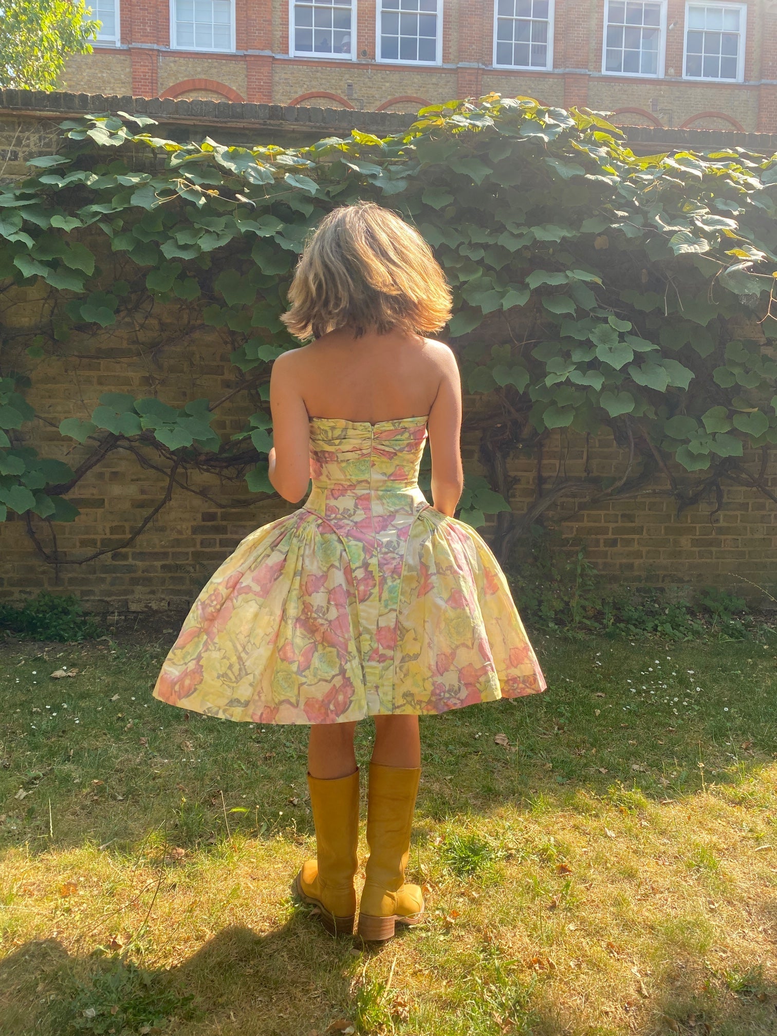 Known as the Marie Antionette dress, this outstanding design walked the runway as part of Karl Lagerfeld's memorable Spring/Summer 1988 collection. A true statement piece, this dress features a corseted bodice with internal boning, and ruching around the top section to add definition. The waist is beautifully fitted all the way through to the top of the hip, where the skirt section is attached and finished with thick rolled cotton piping. The skirt is heavily padded at each hip using intricate layers of fine white mesh, to mimic the exaggerated silhouettes of 18th century court dresses, like those worn by Marie Antionette. The fabric of the dress is a soft, structured cotton with an abstract, almost painterly floral pattern in shades of lemon yellow, pale grey, pale green and dusty pink. The inside of the skirt is lined in a fine layer of white mesh, which helps to create a sense of volume, and the dress fastens at the back with a central zip and hook and eye.