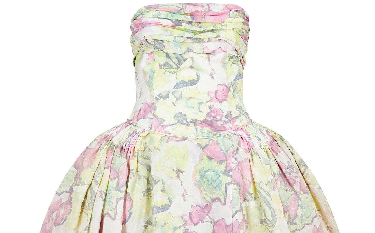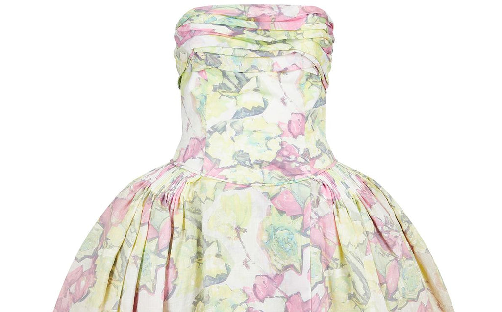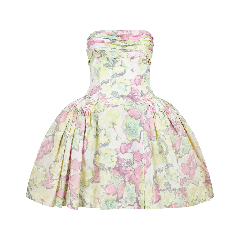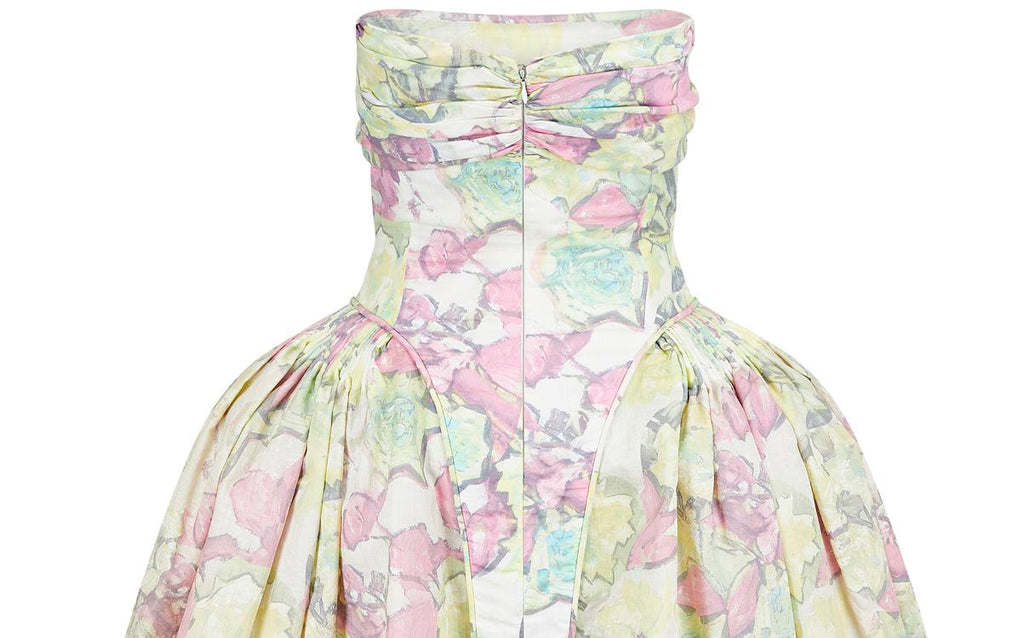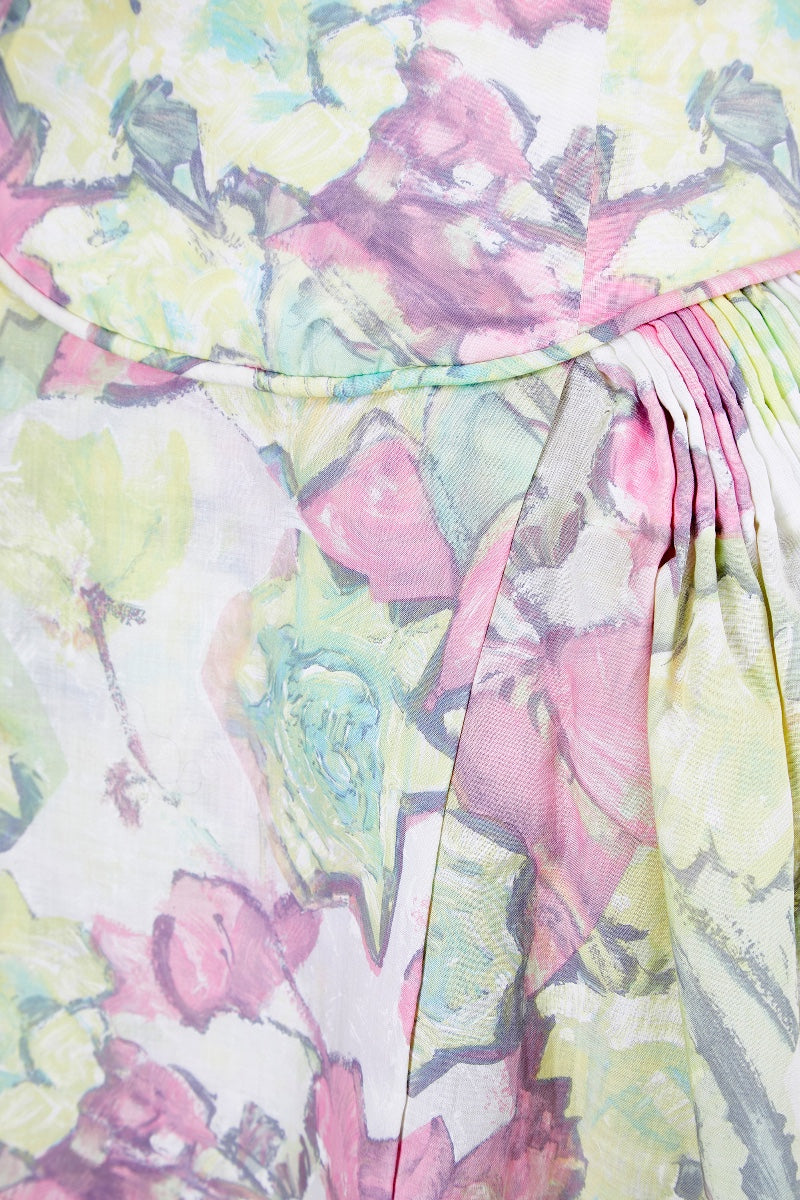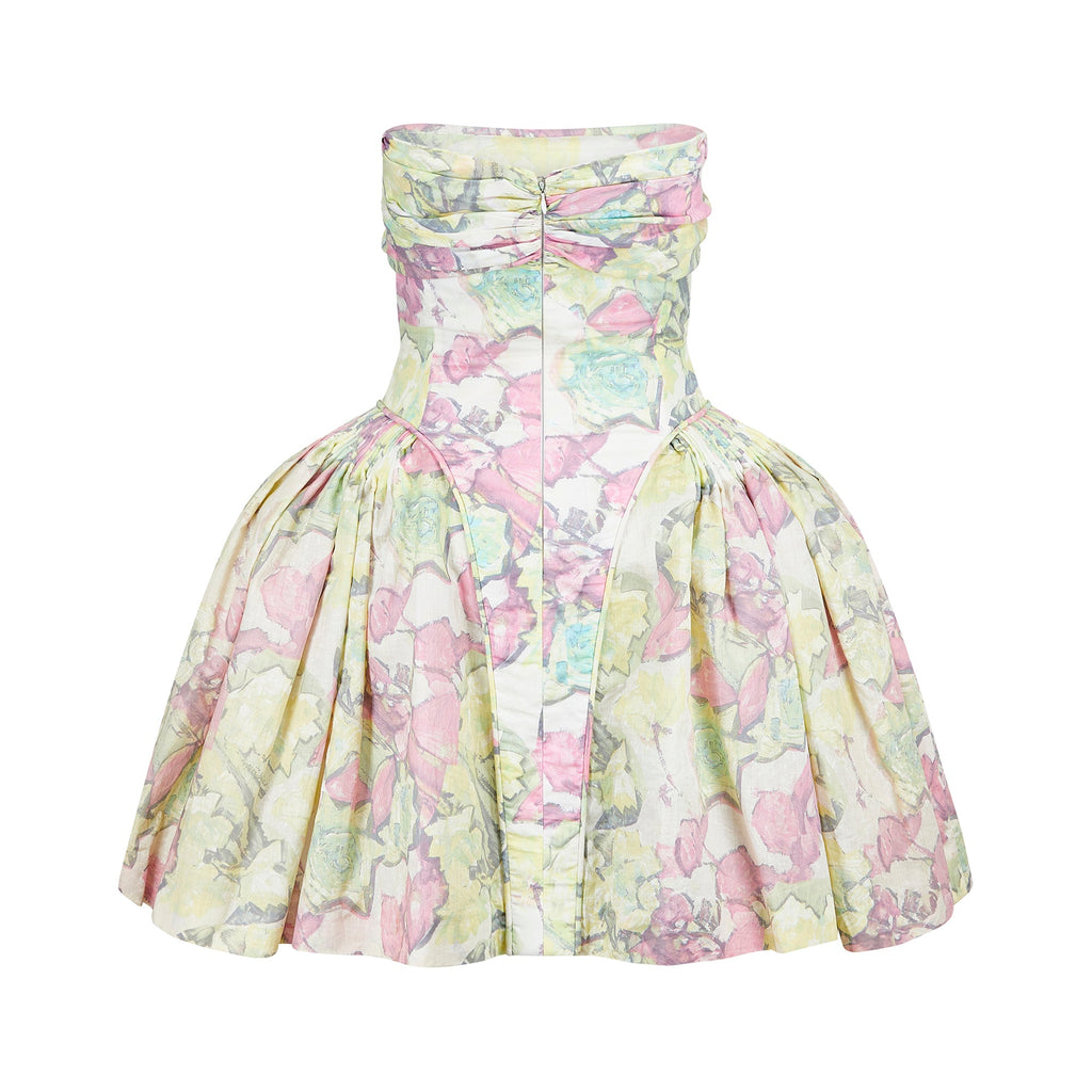 Known as the Marie Antionette dress, this outstanding design walked the runway as part of Karl Lagerfeld's memorable Spring/Summer 1988 collection. A true statement piece, this dress features a corseted bodice with internal boning, and ruching around the top section to add definition. The waist is beautifully fitted all the way through to the top of the hip, where the skirt section is attached and finished with thick rolled cotton piping. The skirt is heavily padded at each hip using intricate layers of fine white mesh, to mimic the exaggerated silhouettes of 18th century court dresses, like those worn by Marie Antionette. The fabric of the dress is a soft, structured cotton with an abstract, almost painterly floral pattern in shades of lemon yellow, pale grey, pale green and dusty pink. The inside of the skirt is lined in a fine layer of white mesh, which helps to create a sense of volume, and the dress fastens at the back with a central zip and hook and eye.