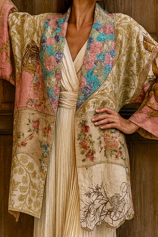 This exquisite John Rocha reworked patchwork kimono features rare 1920s beading and intricate antique embroidery throughout, showcasing exceptional craftsmanship. Designed with a loose fit, it pairs effortlessly with denim or a simple slip dress, offering timeless elegance. This unique piece is a true heirloom, blending vintage artistry with modern style for enduring wear.