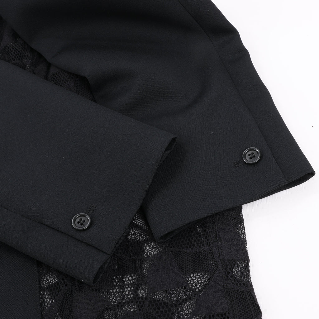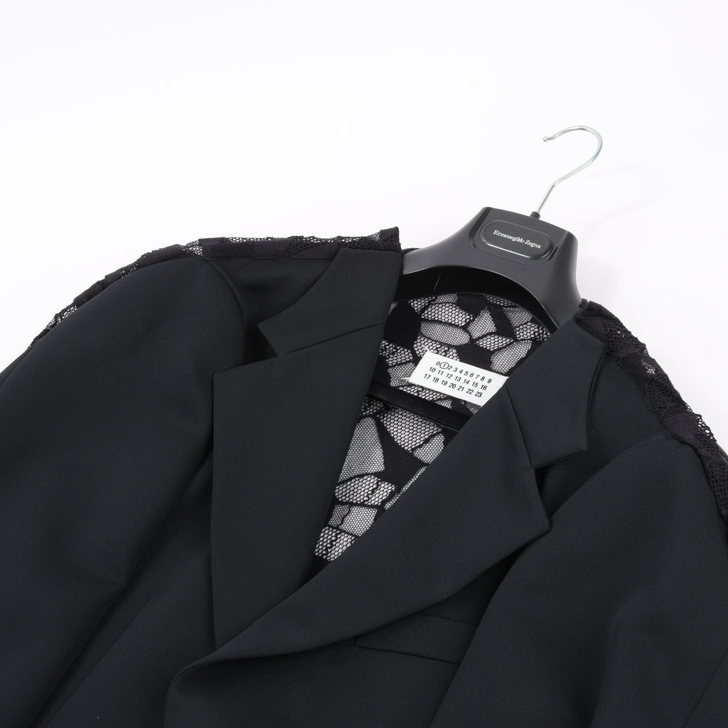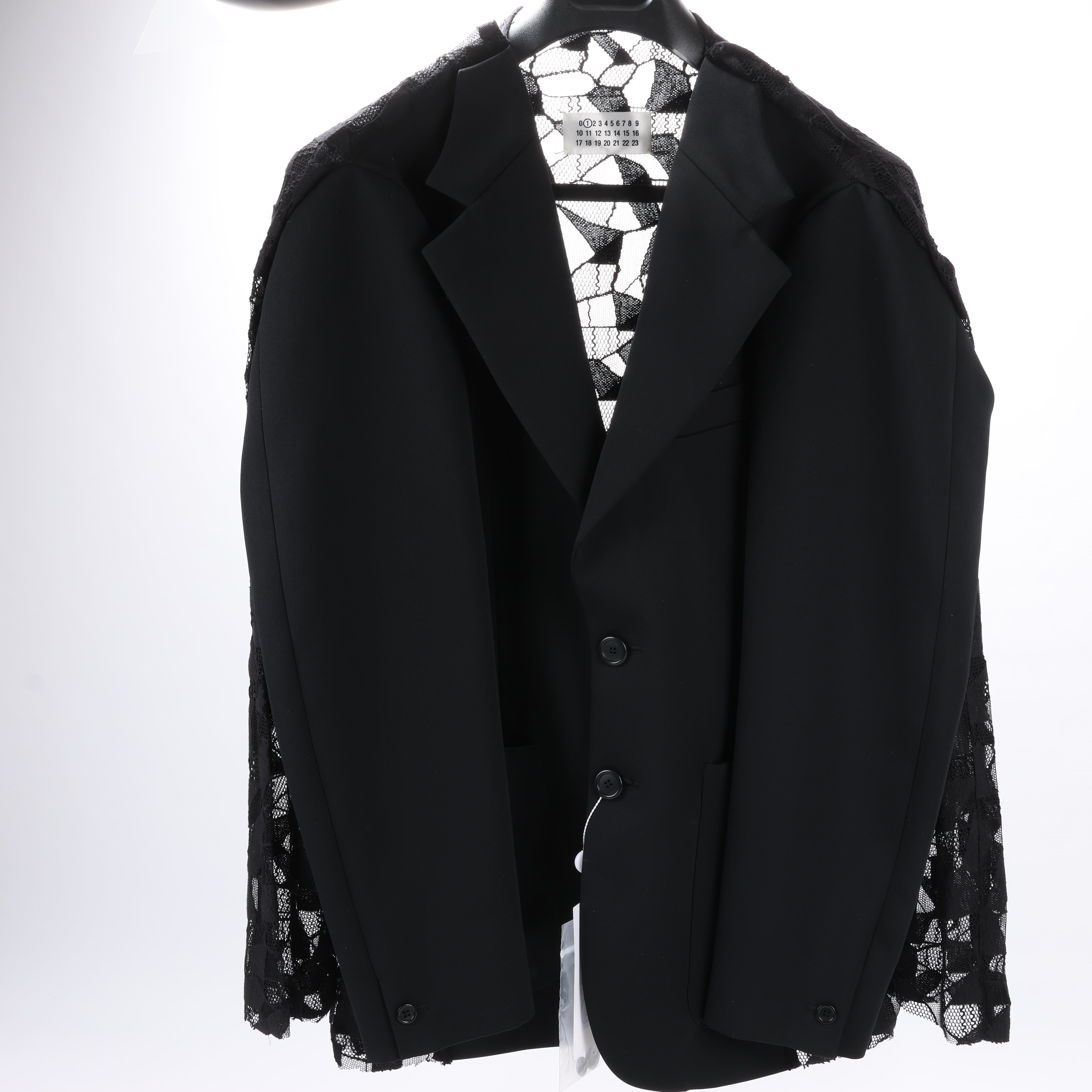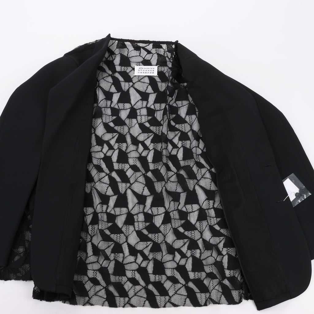 This Maison Margiela blazer in black size 40 features a stunning sheer lace back panel that adds a bold contrast to the classic tailored front. With its structured fit and eye-catching design this blazer blends sophistication and avant-garde style making it an exceptional statement piece for any wardrobe.