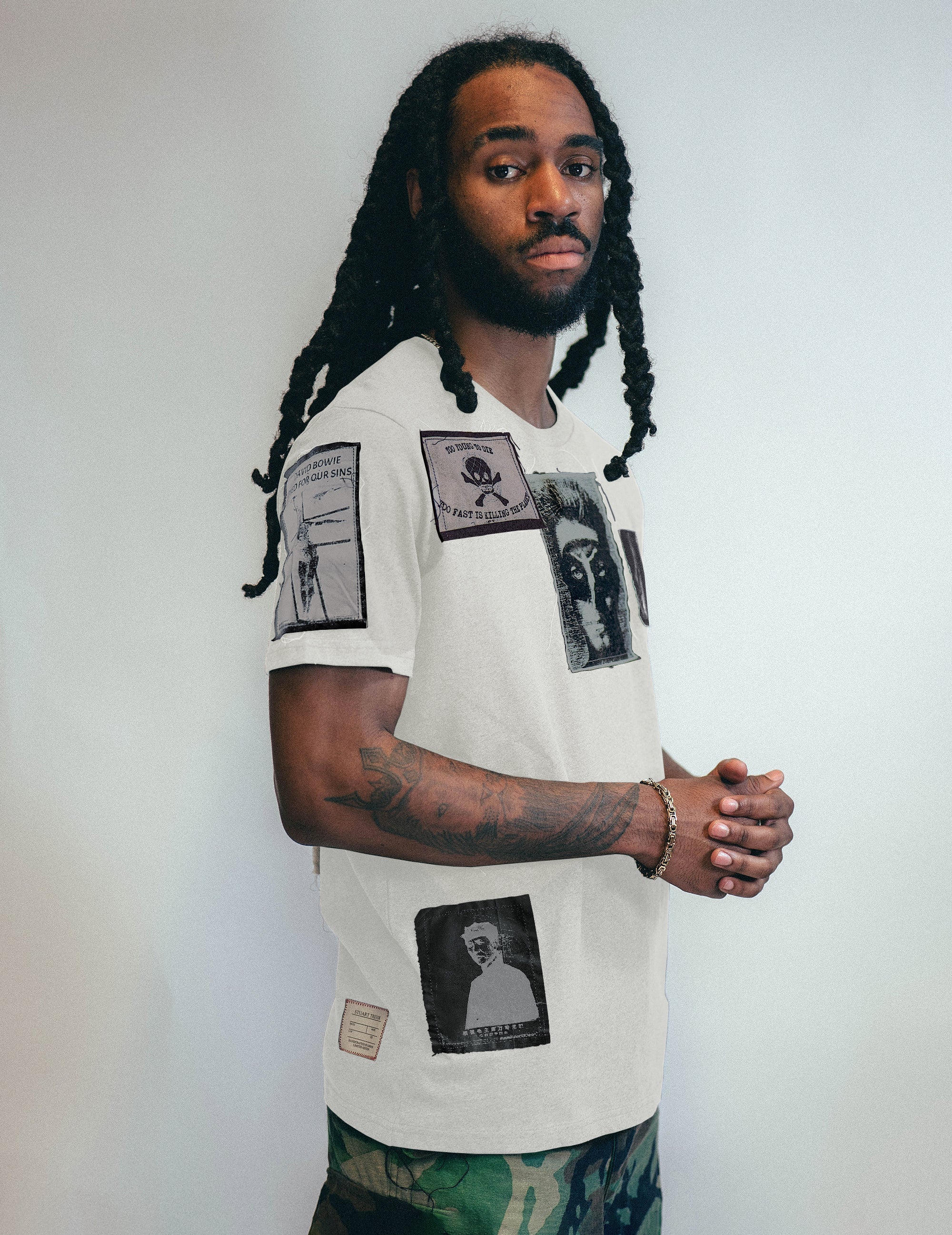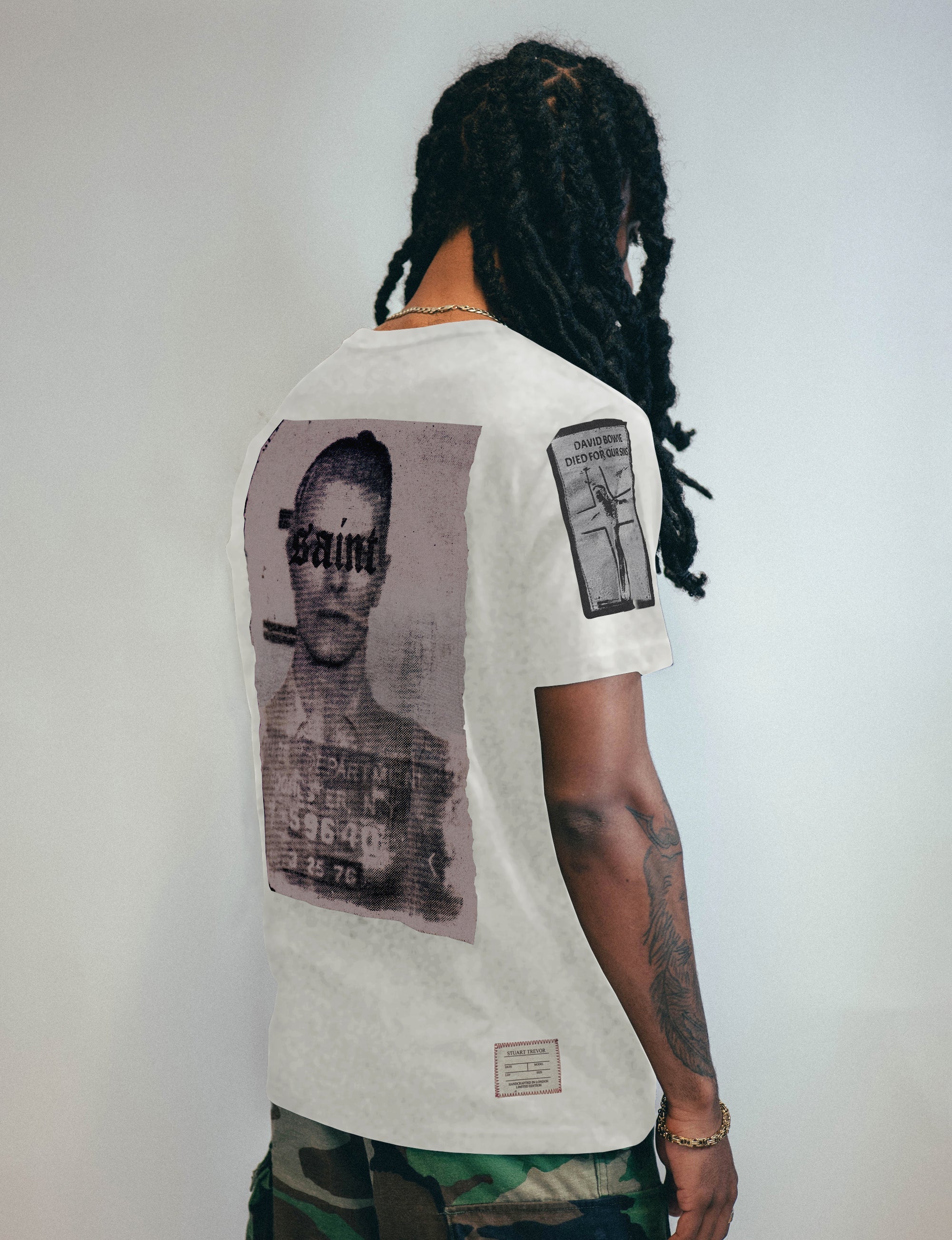 Women's ecru t-shirt, crafted from 50% GOTS certified organic cotton and 50% recycled organic cotton from factory, cutting waste. Relaxed fit, featuring custom screen printed denim patches with one of our favourite Rock n Roll icon.
