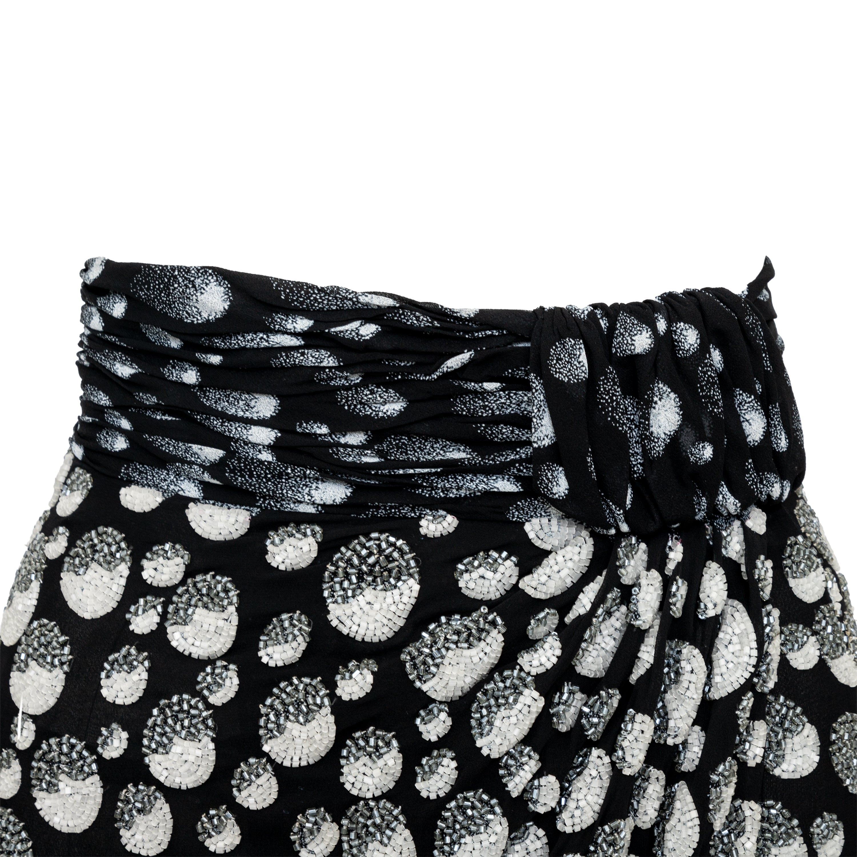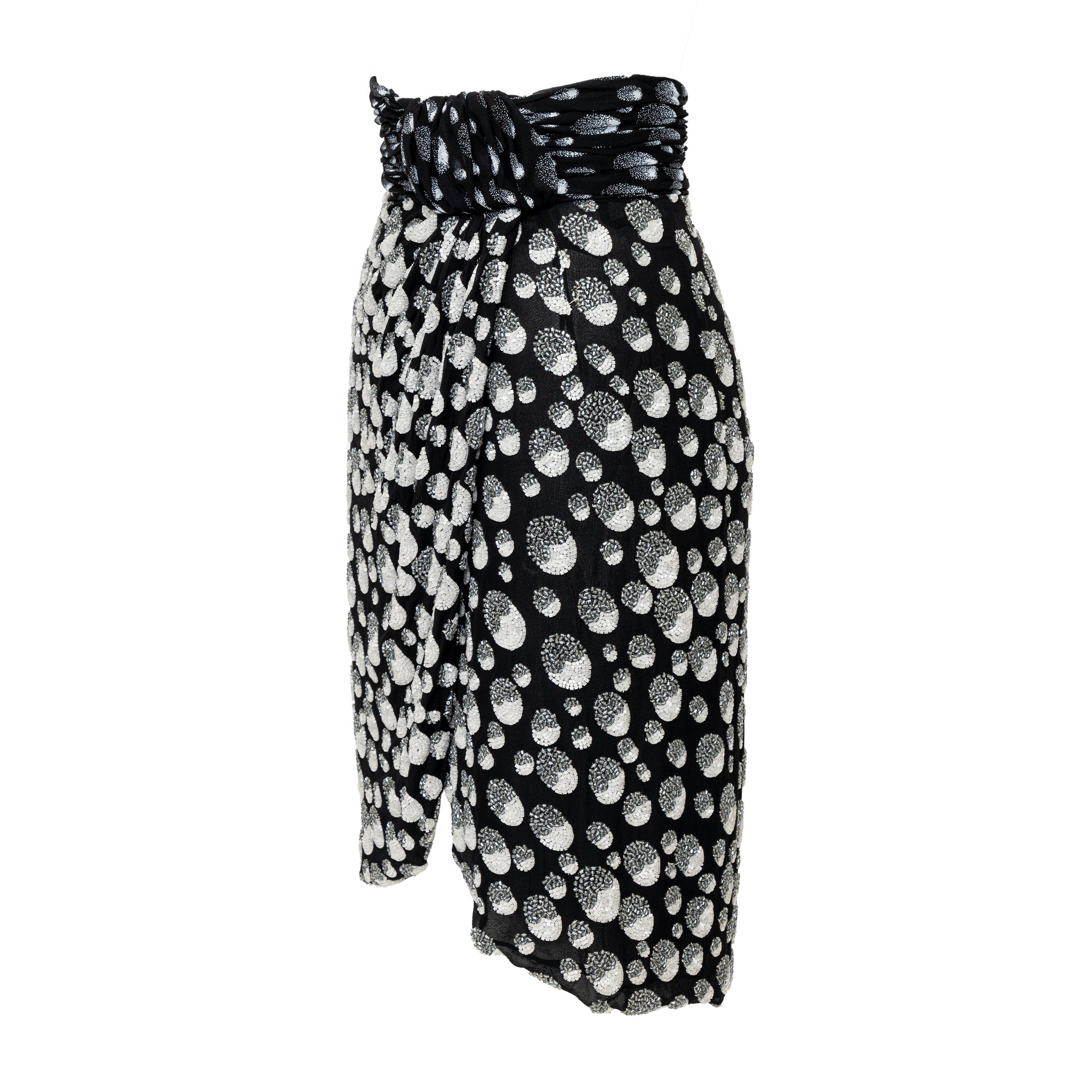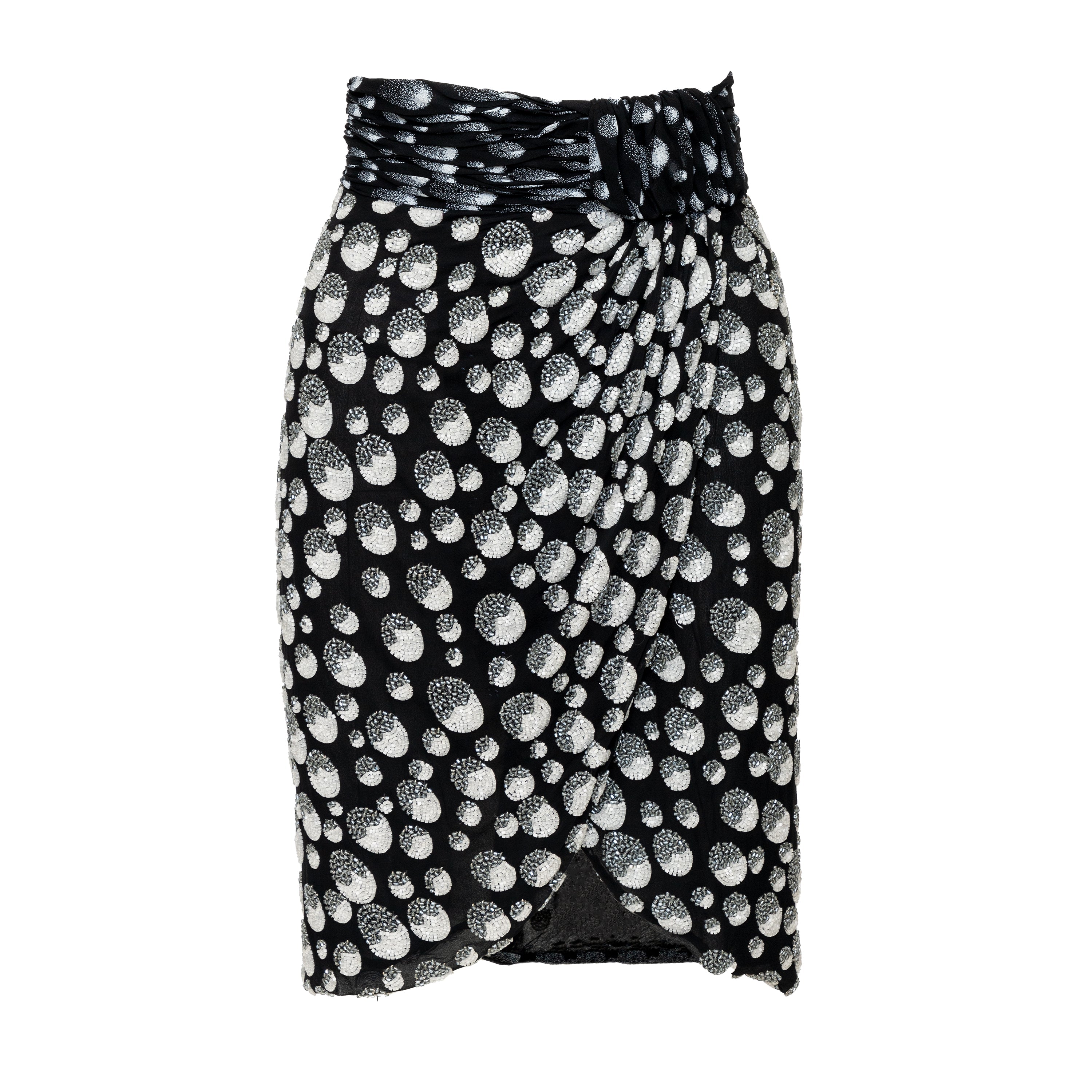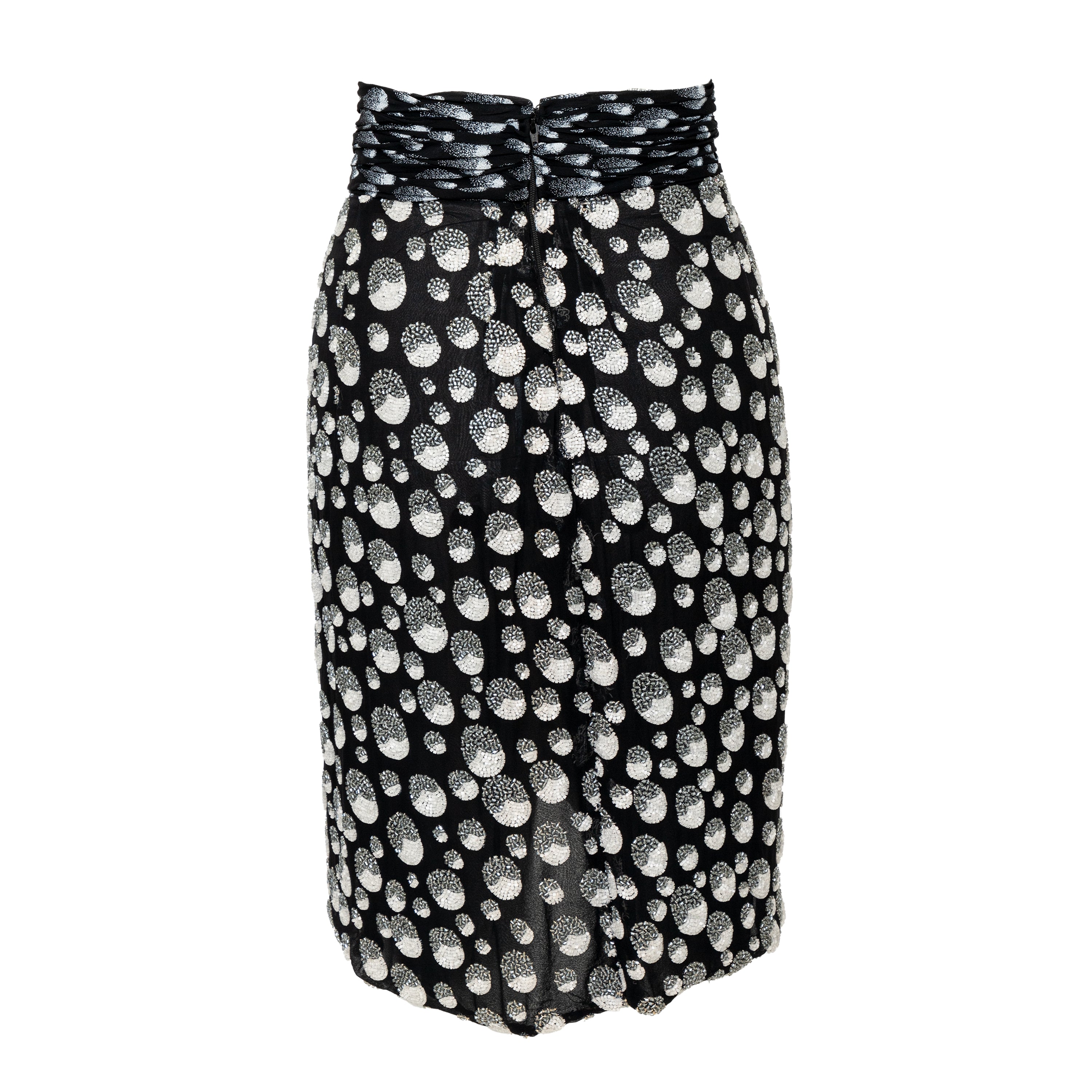 This vintage Mila Schön cocktail skirt from the 90s is a fashion staple with its unique white and grey circle pattern heavily beaded. The wrap with knot design on the front adds a touch of unique flair, while the full lining and mid-length make it perfect for any special occasion.