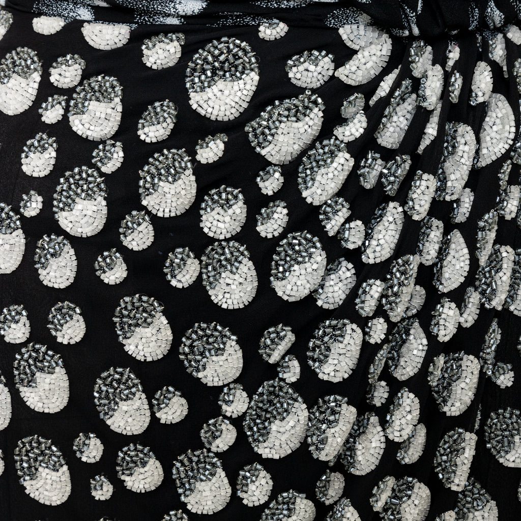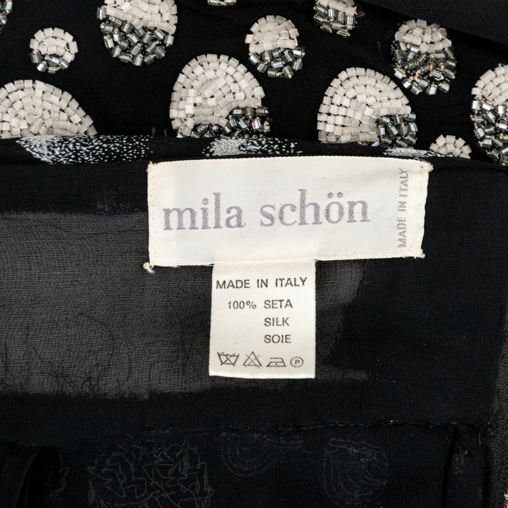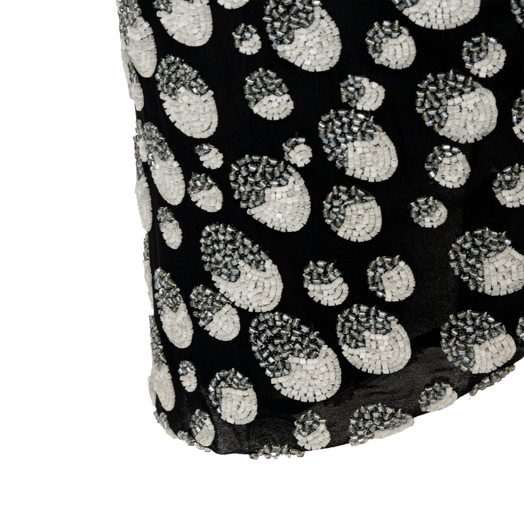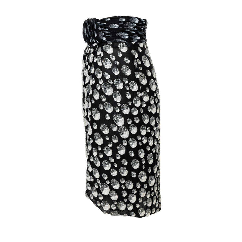 This vintage Mila Schön cocktail skirt from the 90s is a fashion staple with its unique white and grey circle pattern heavily beaded. The wrap with knot design on the front adds a touch of unique flair, while the full lining and mid-length make it perfect for any special occasion.