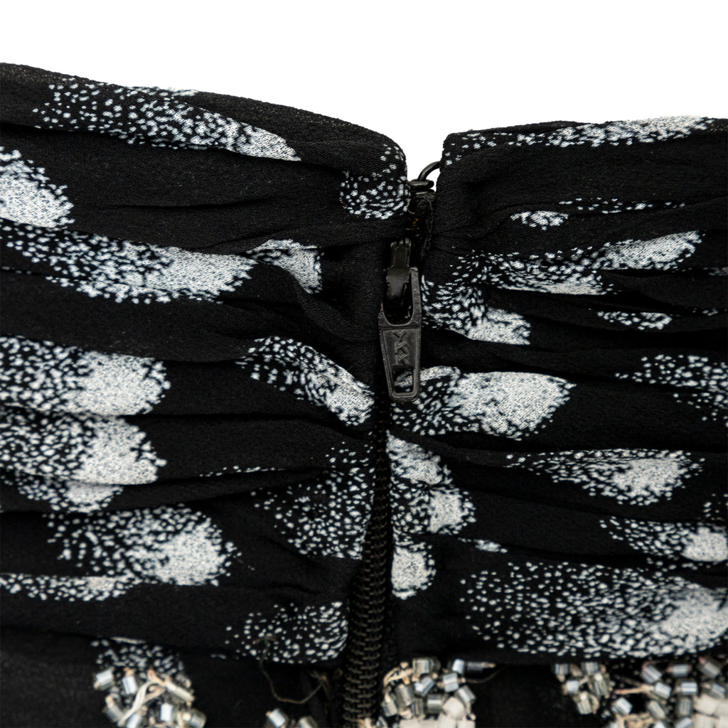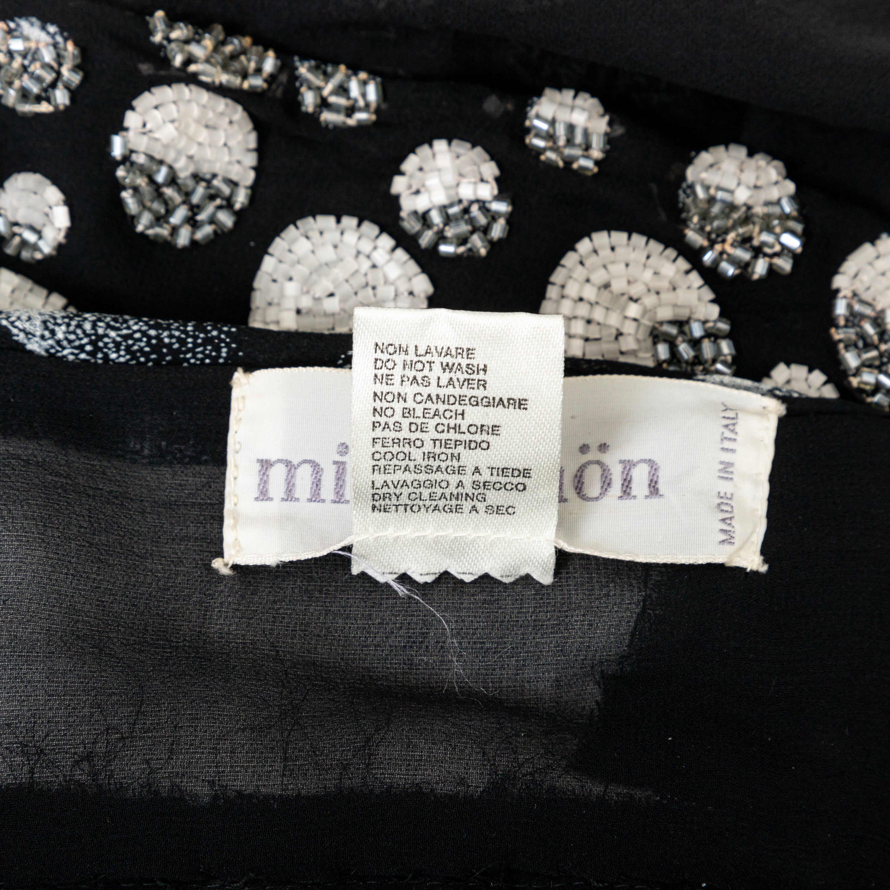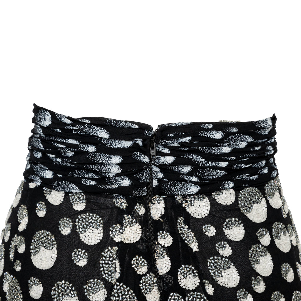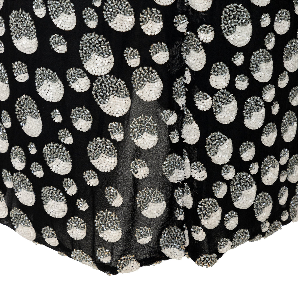 This vintage Mila Schön cocktail skirt from the 90s is a fashion staple with its unique white and grey circle pattern heavily beaded. The wrap with knot design on the front adds a touch of unique flair, while the full lining and mid-length make it perfect for any special occasion.