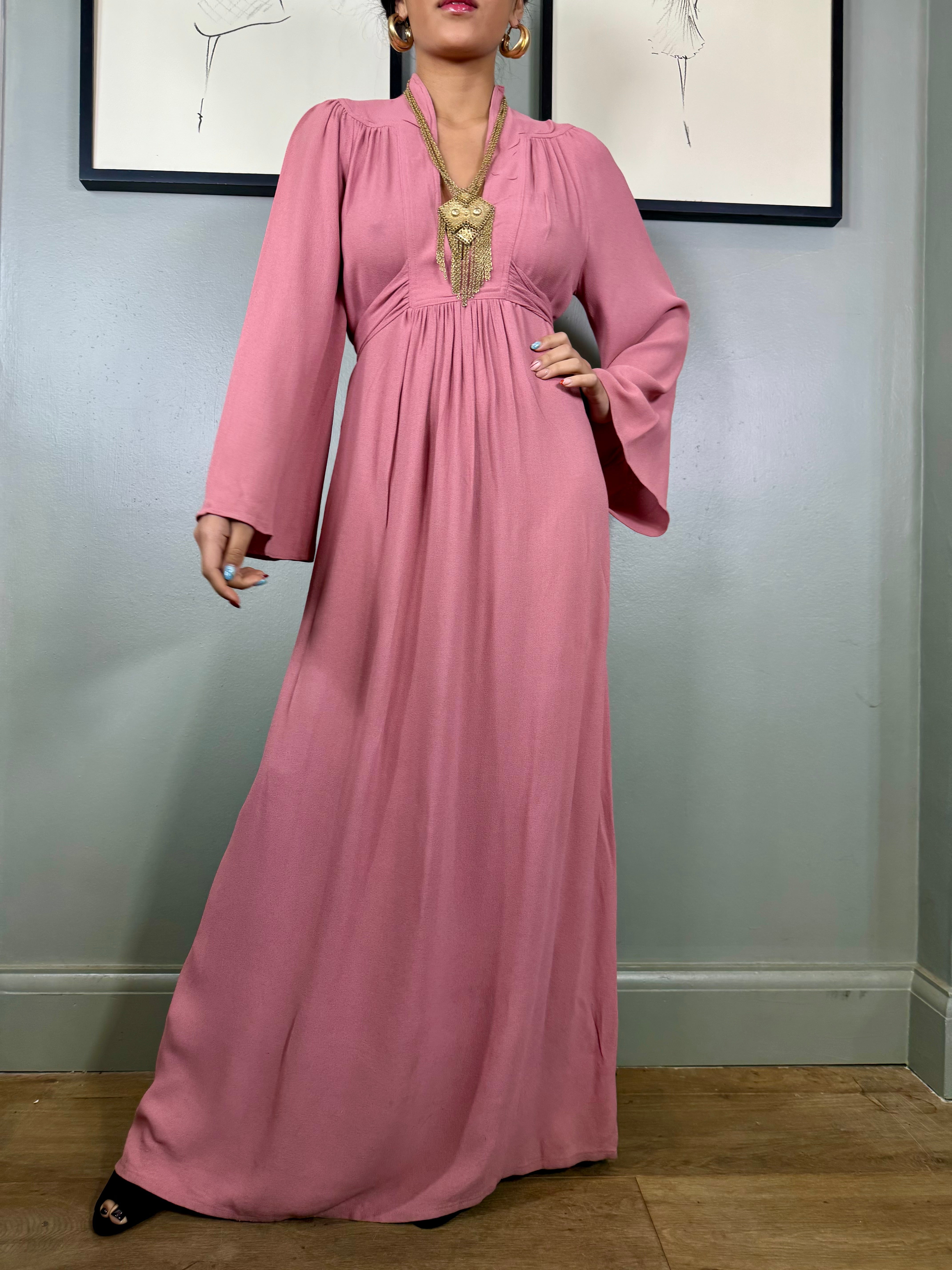 Gorgeous pink Ossie Clark 70s dress in his iconic crepe styles. has long flair sleeves, a front V neckline, an empire line tie that fates on the back. Has a pleated back and fluid A line shape. Hs a faint mark on the back but does not show when pleated and in no way takes away from the wearability of the dress.