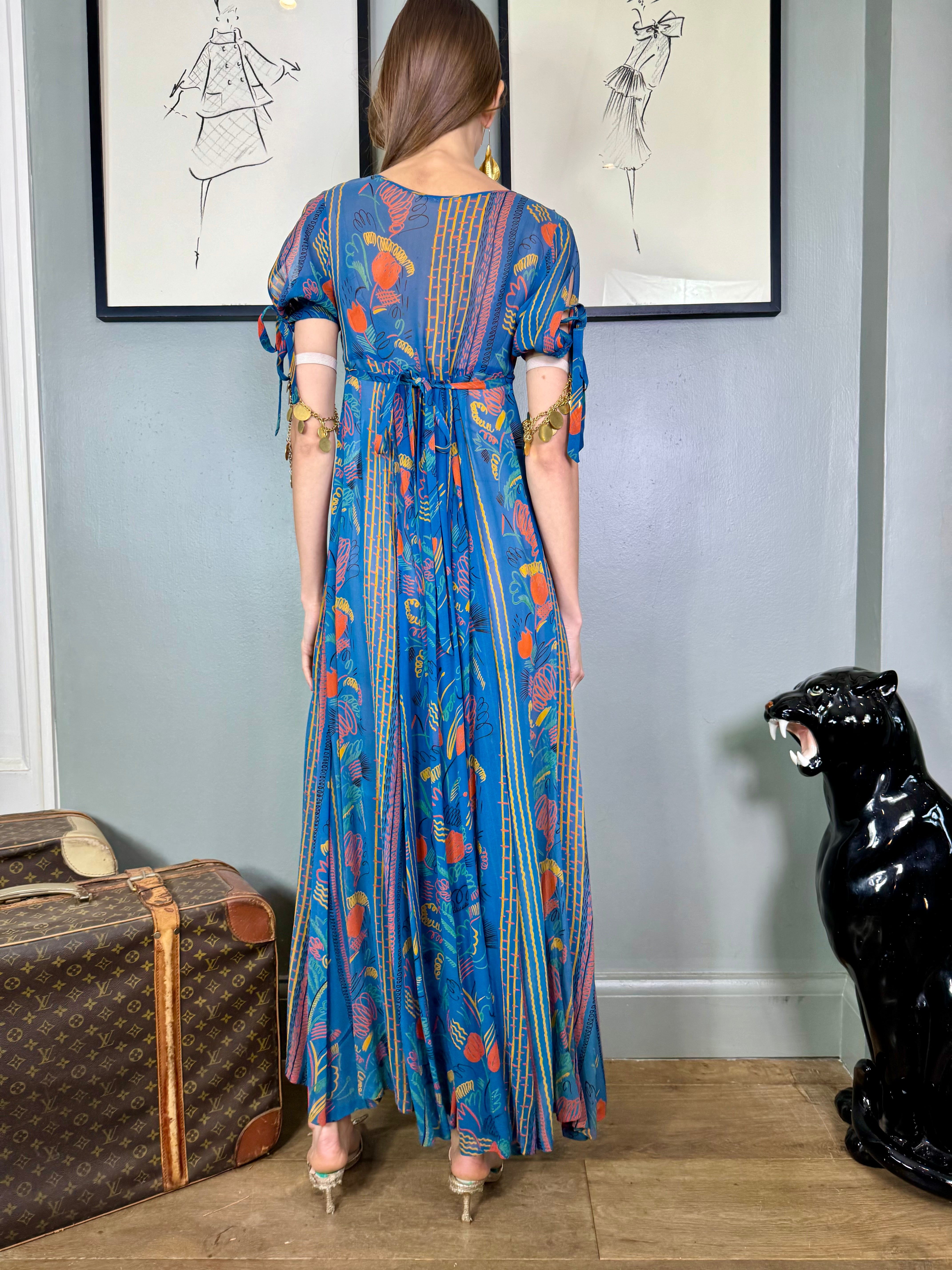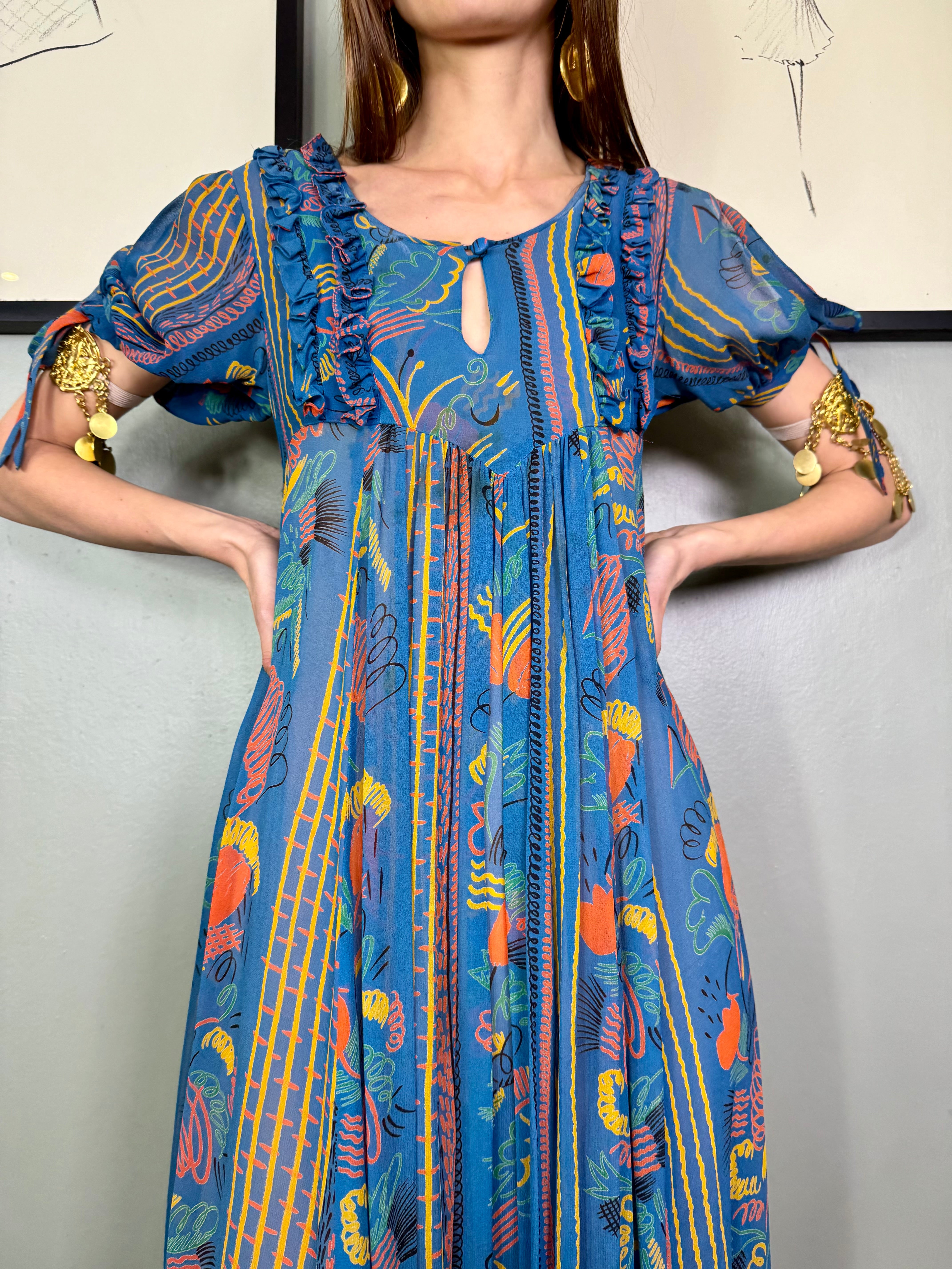 Gorgeous Ossie Clark iconic and collectable print silk dress featuring a signature Celia Birtwell print. The dress has a round neckline with a small button, a small frill around the bust and an empire line fit that ties on the back. The skirt is loose and floaty. Has short sleeves with a keyhole shoulder design and long arm ties.