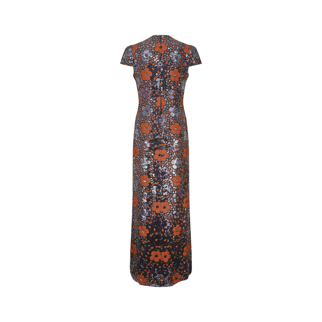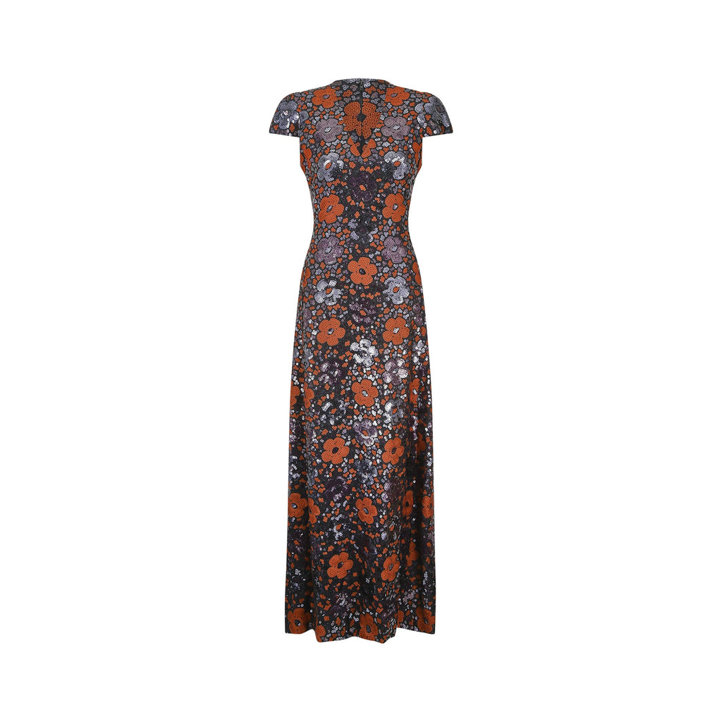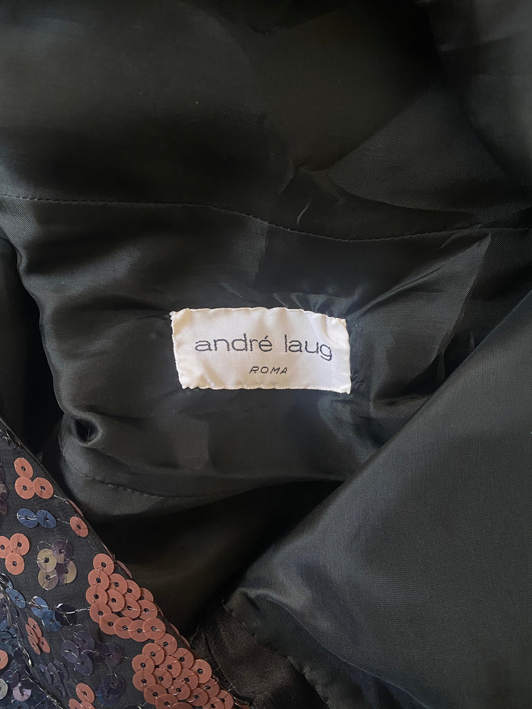 A very elegant 1980s sequin dress from Italian couturier Andre Laug from his haute couture / alta moda line. The dress has beautiful cap sleeves, a V neckline and is a Princess seamed full length sheath design. Embellished all over in a floral sequin pattern with a rather interesting satin bronze tone. This unusual mat colour contrasts the subtle shimmer of the black and purple sequins and the overall look is very pleasing and understated. It has shoulder pads and is beautifully lined. Fastens to the rear with the original zip. This was most likely a runway piece and was purchased with a number of archive pieces. This will fit a size UK 10 or US 6 best and it's in fabulous vintage condition with no issues of any note.