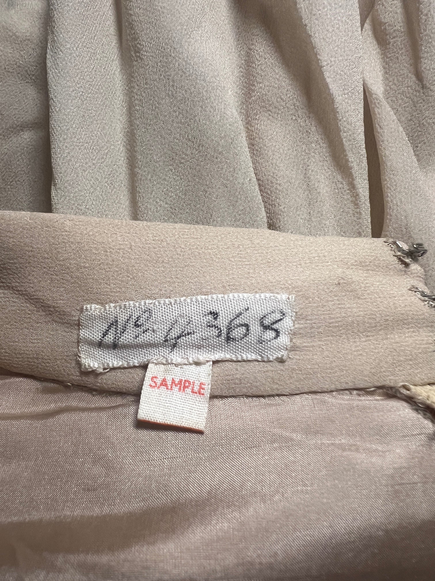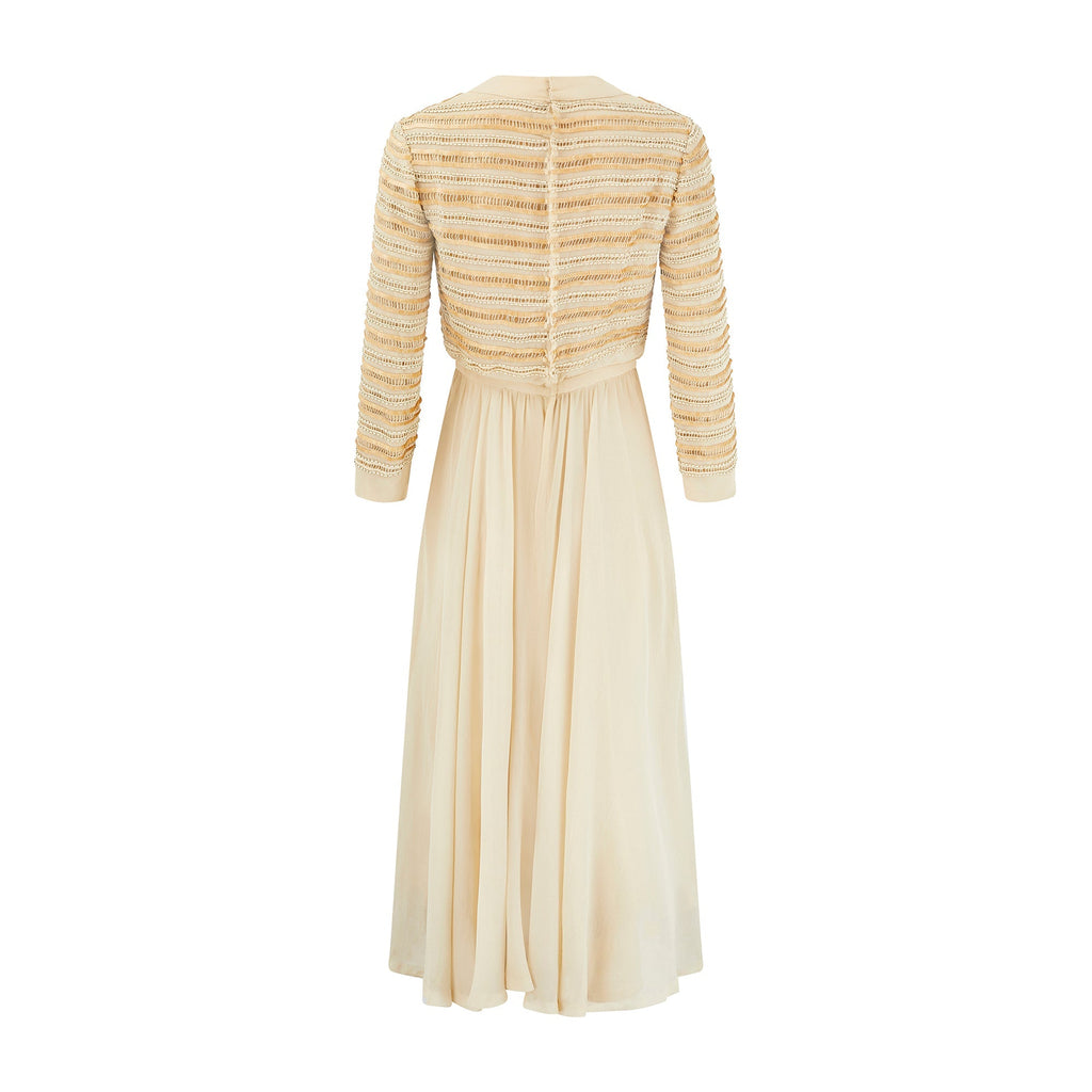 This elegant evening dress was designed by Christian Dior in the 1970s and has a London branch label. Tailored to a long-sleeve, midi-dress cut from the finest semi-sheer butterscotch-hued silk chiffon. The skirt falls with soft pleats from a nipped-in waist and is lined with butterscotch crepe. It has a V-neckline which reveals the décolletage. The embellishment is beautiful across the bodice and sleeves; stripes of cream crochet cutwork grace the bodice, back and sleeves, trimmed alternatively with rows of pale caramel hued sequins with a slight sheen and tonal glass bugle beads. This dress fastens at the rear of the neck with the original hidden zip. The bodice is lined in butterscotch silk. Labelled a sample alongside a hand-written label that reads, “No. 4368”. It may have been made under the direction of Jorn Langberg, who headed up the design team in London in the 60s and 70s, or a sample piece from Paris where Marc Bohan was the House's creative director. Either way, its superbly made with many of the hallmarks of the House's haute couture pieces and a good deal of hand finishing.