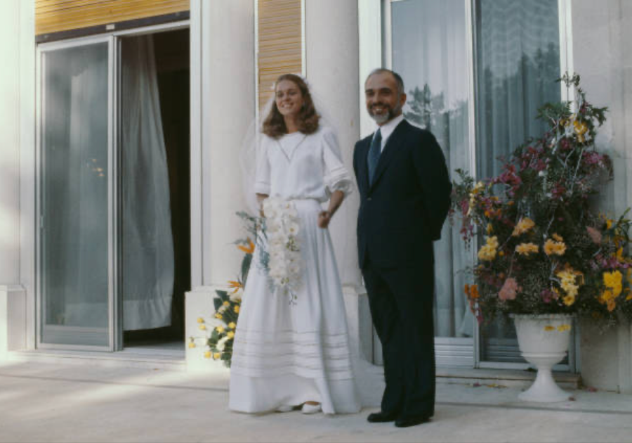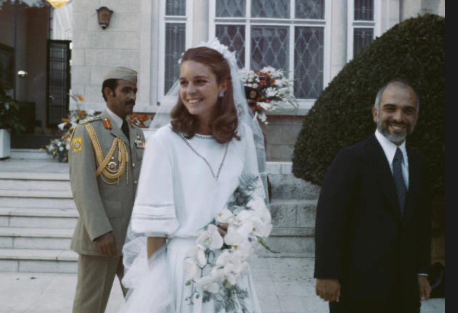 When this dress first came into Circa's collection I was struck by how similar the lattice work design is to the Spring 1978 haute couture collection although this dress appears to be a little older. We've added a few photos from the runway to show the identical design. The collection is particularly important as this design forms the main ornamentation for the Dior haute couture bridal gown made for the Royal Wedding of King Hussein of Jordan to his American bride Elizabeth Halaby. We have added a photograph after their wedding ceremony in Amman, Jordan, June 17th 1978. Twenty six year old Halaby would become known as Queen Noor al-Hussein.
