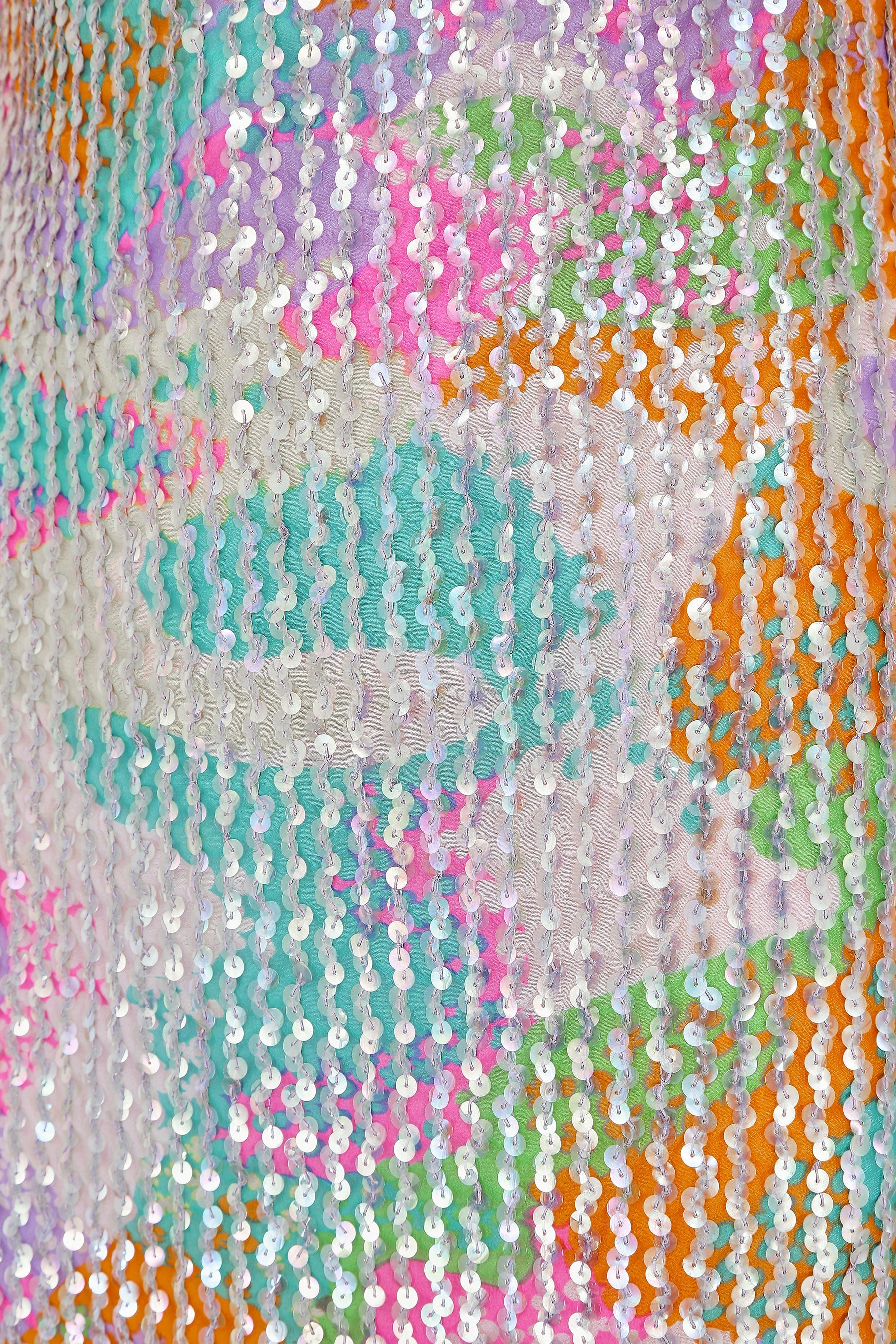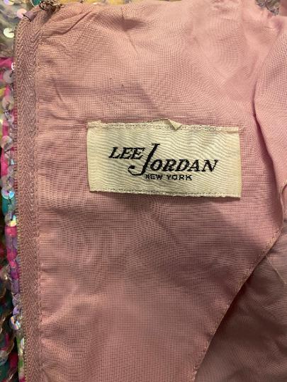 Superb quality Lee Jordan of New York all over floral sequinned three quarter length column dress. Lee Jordan made very high end department store occasion wear for the affluent American market from the 1960s through to the 1980s. This dress is most likely from the late 1960s to early 1970s. Rows of wavy iridescent sequins overlay an abstract design in georgette fabric in a striking neon rainbow of purple, pinks, green, blue and orange. The dress is collared, with a shallow V neck bust line and straight sleeves that are slightly sheer. The dress fastens to the back with the original zip and hook and eyes for the collar. The dress is gently shaped at the bust line and has a rear centre seam slit for ease of movement.