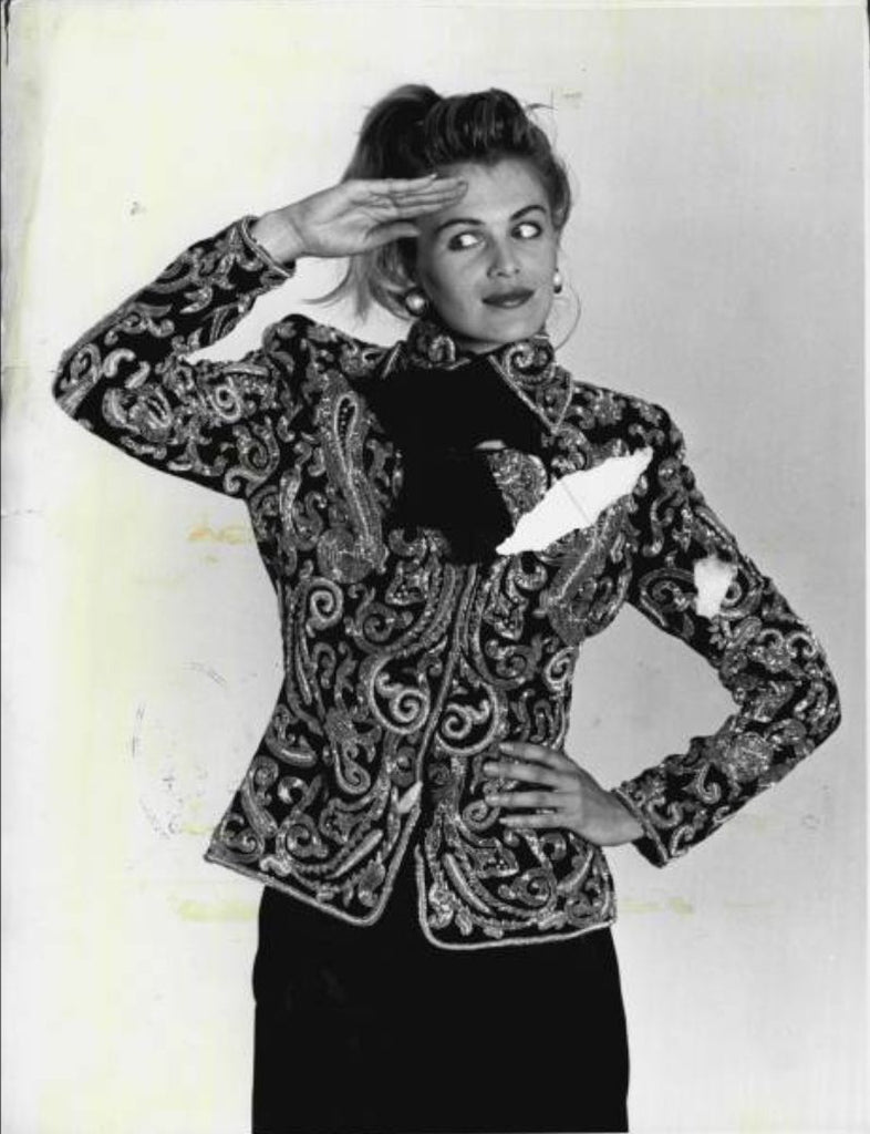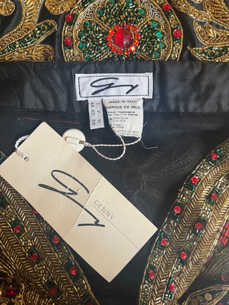 This magnificently ornate skirt was most likely designed by Gianni Versace and created by Italian ready-to-wear manufacturer Genny. Versace became the Creative Director at Genny in 1973 and remained there until the early 1990s. We have found a very similar, ornately beaded advertisement for a ‘Sergeant Pepper’ jacket by Genny which retailed for a staggering $4,900 with the advert dated February 02, 1989.