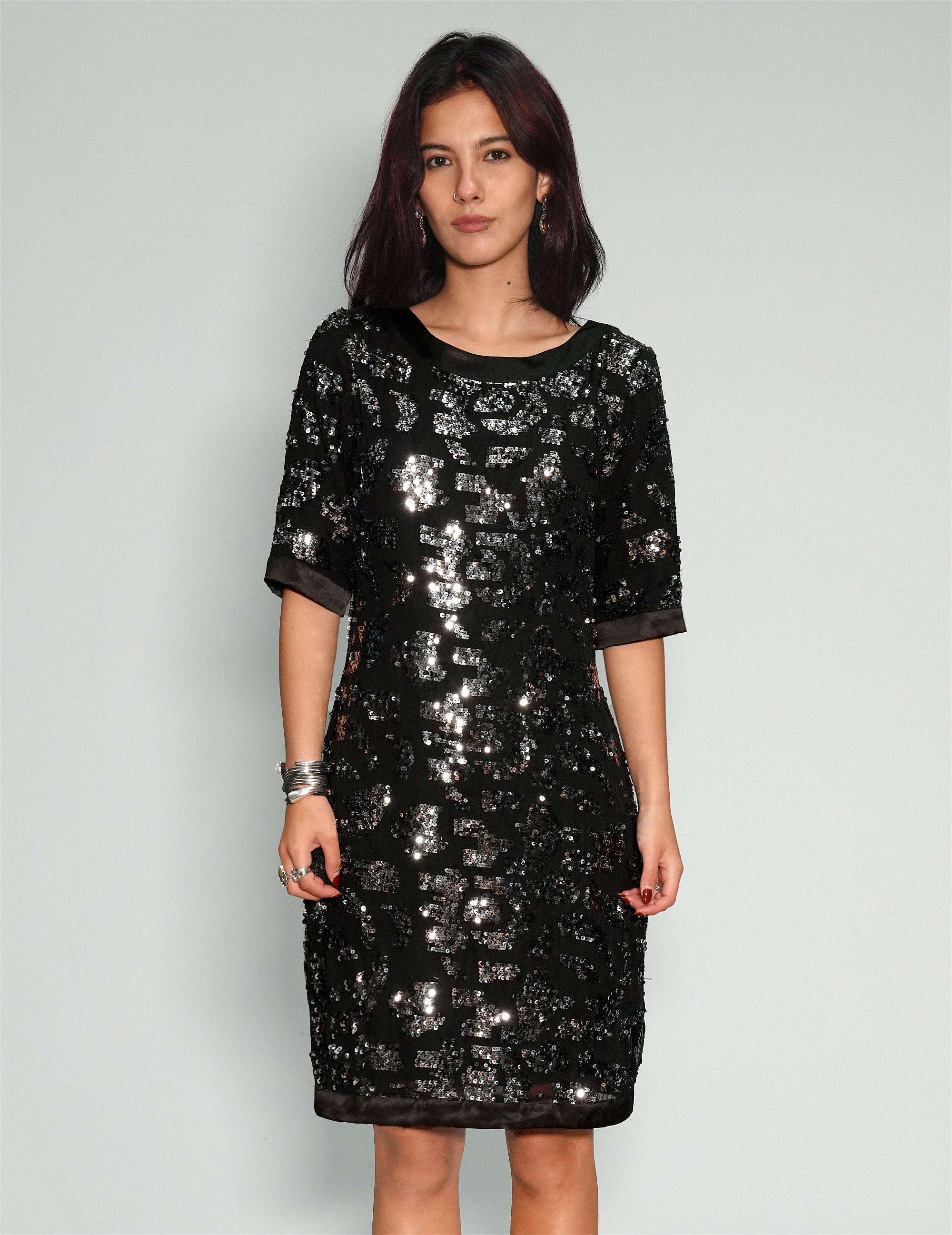 Vintage 60's style cocktail dress by O.R. Silk Fashions. Beautiful sequinned art-deco style pattern, zip fastening back.