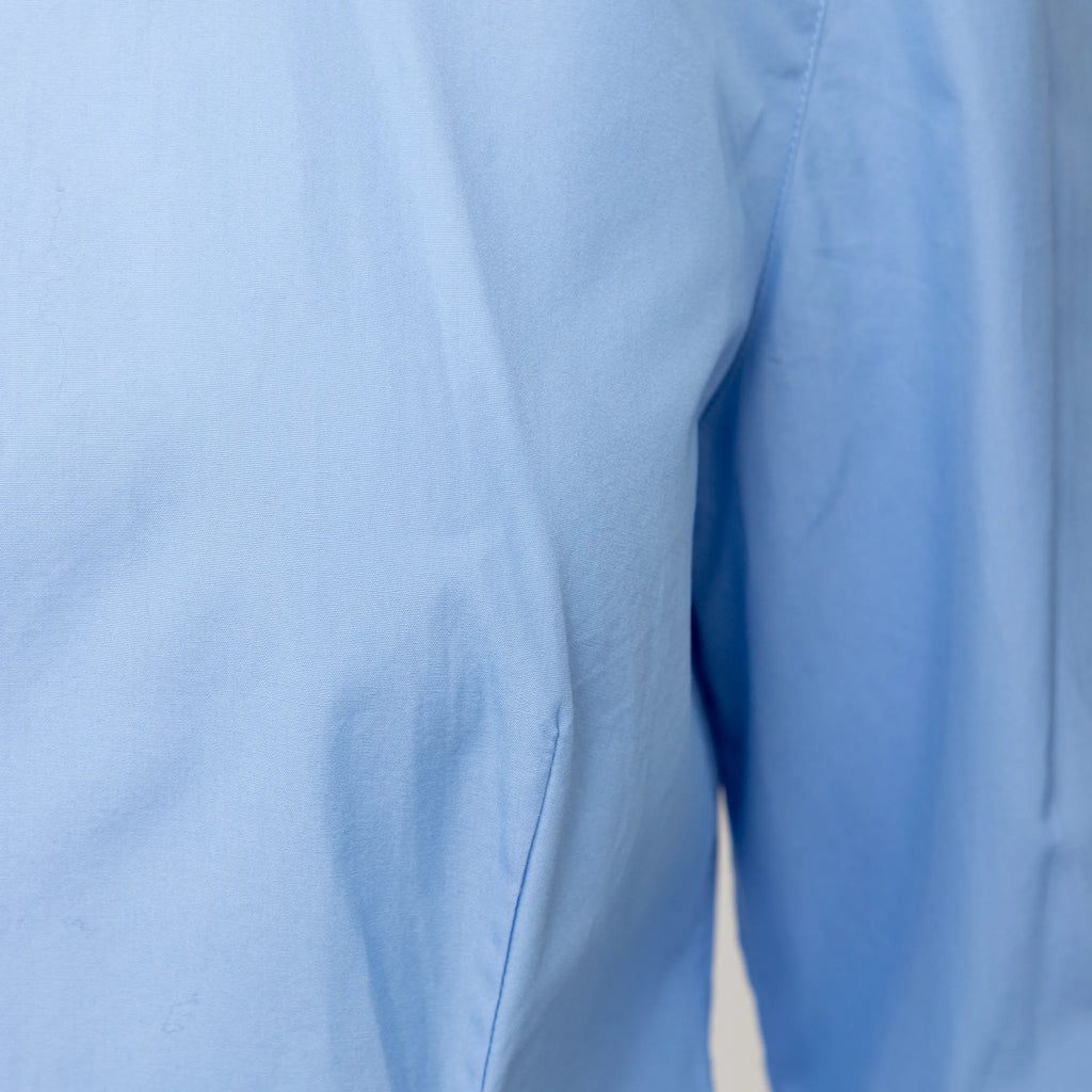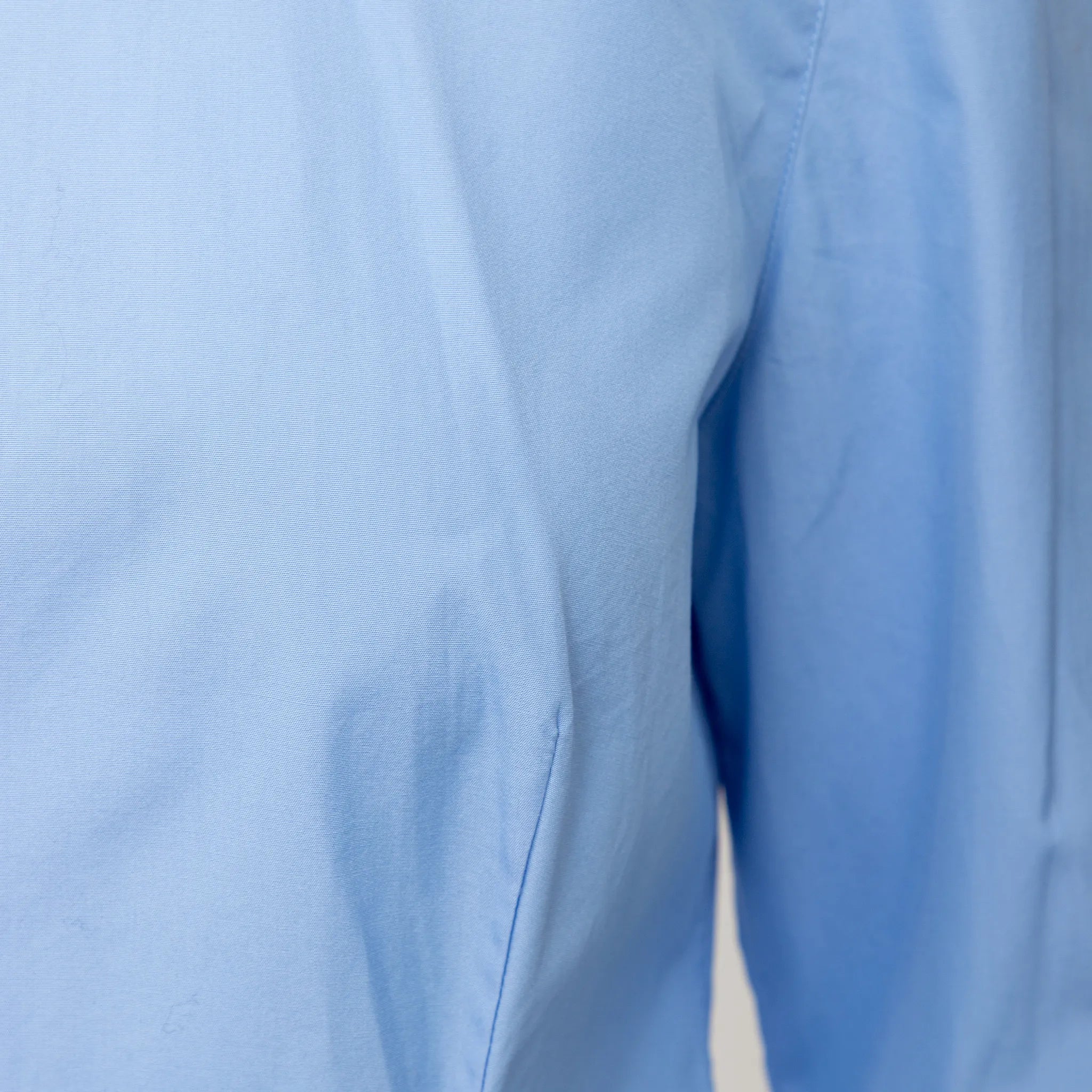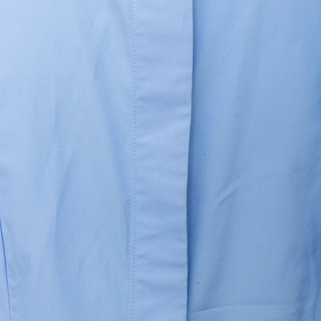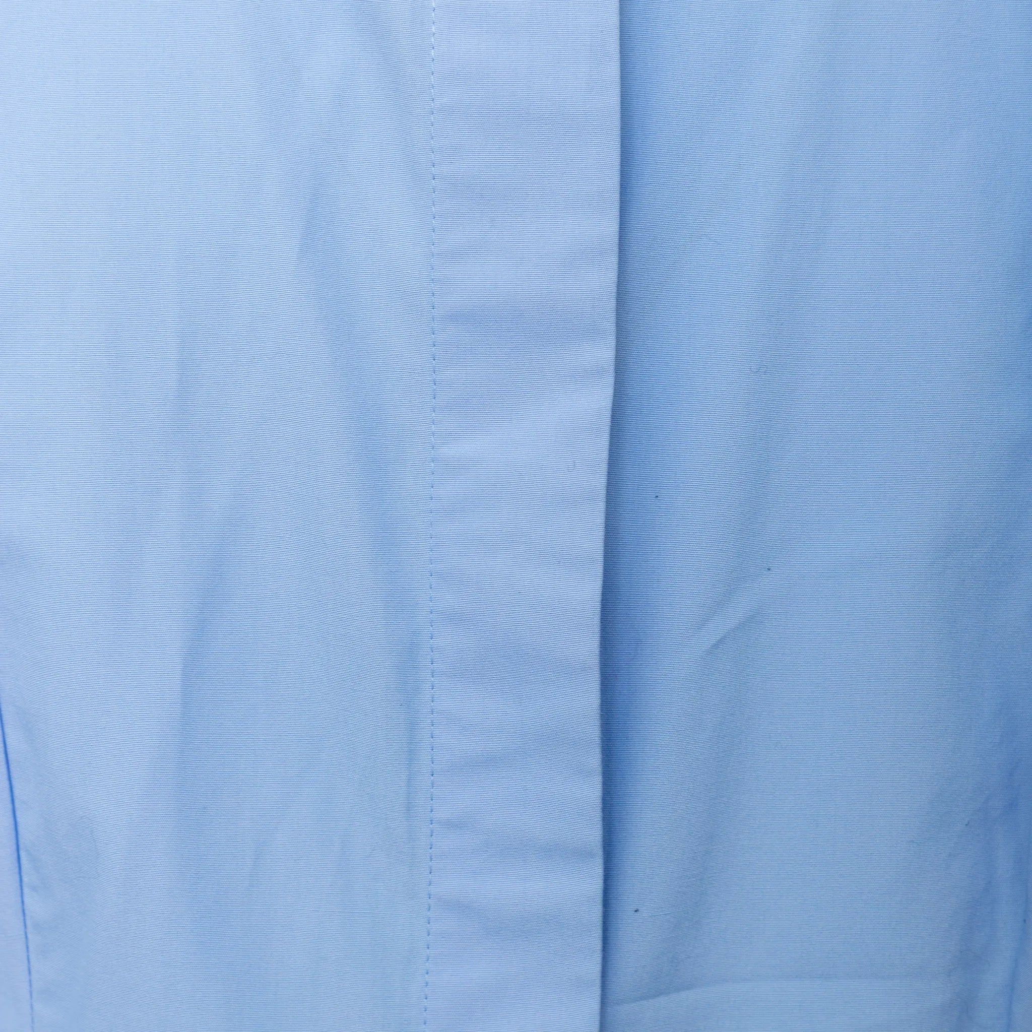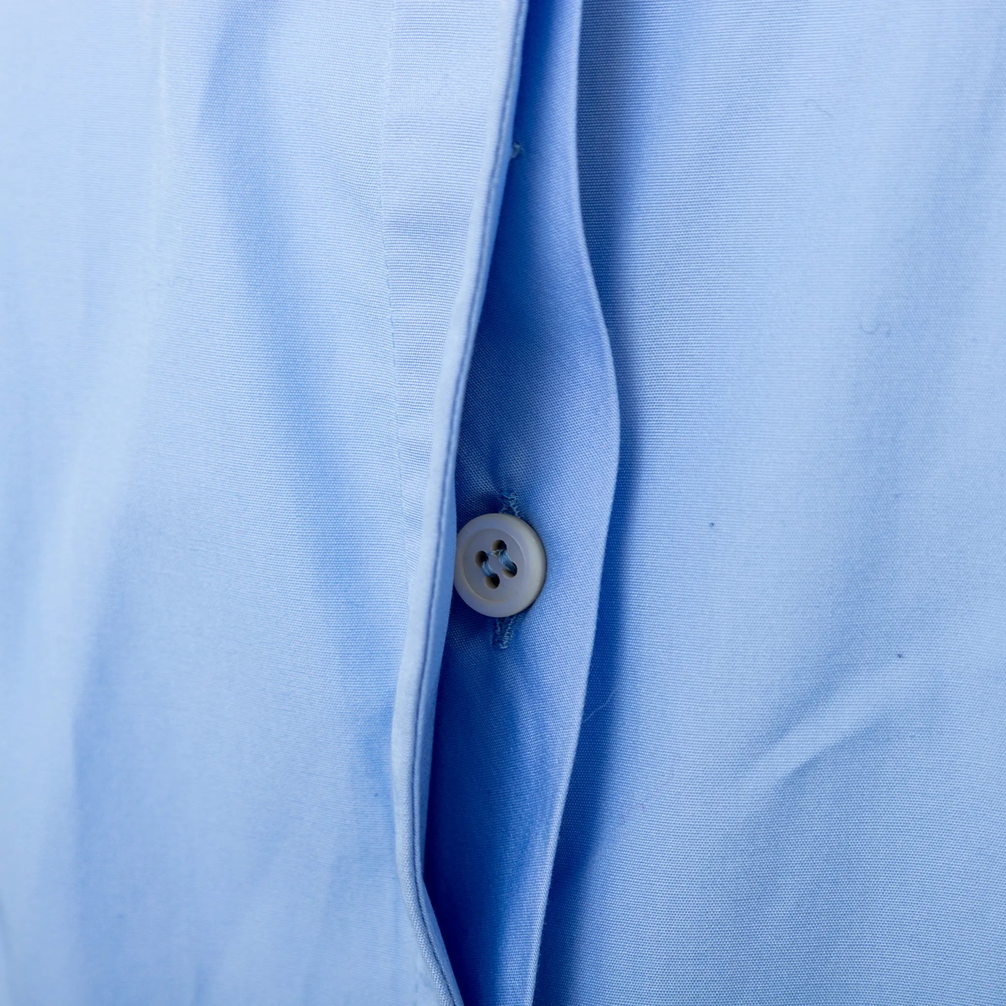 A chic Prada shirt dress in light blue cotton with a sleek tailored fit and back button closure. A modern twist on the classic shirt silhouette.