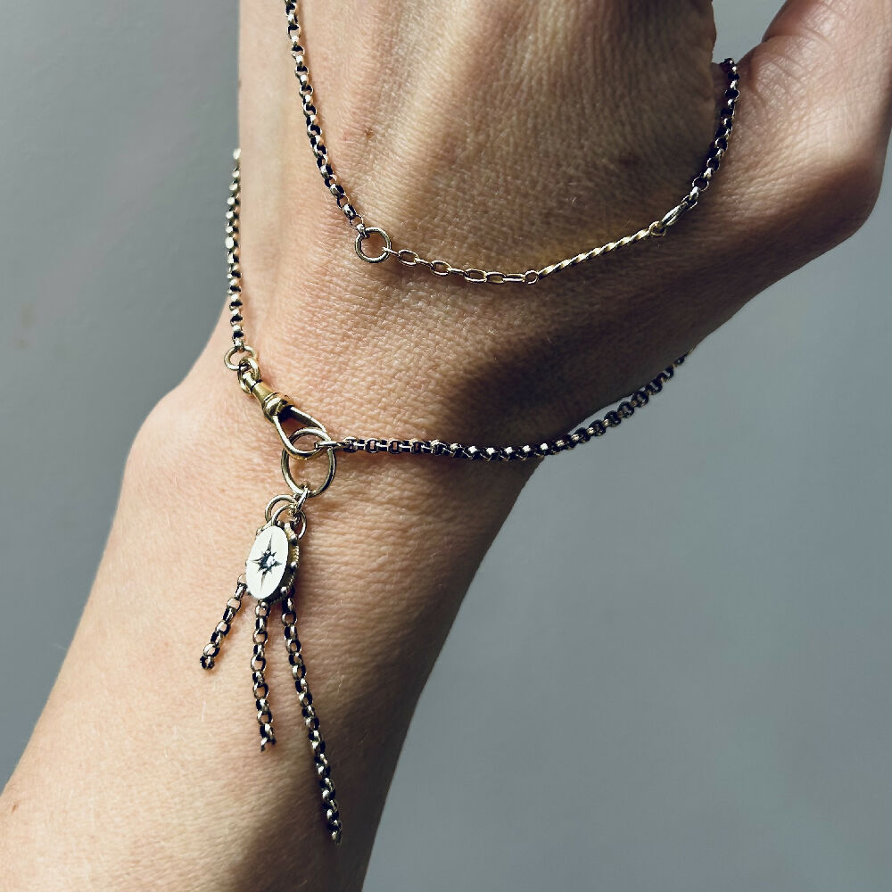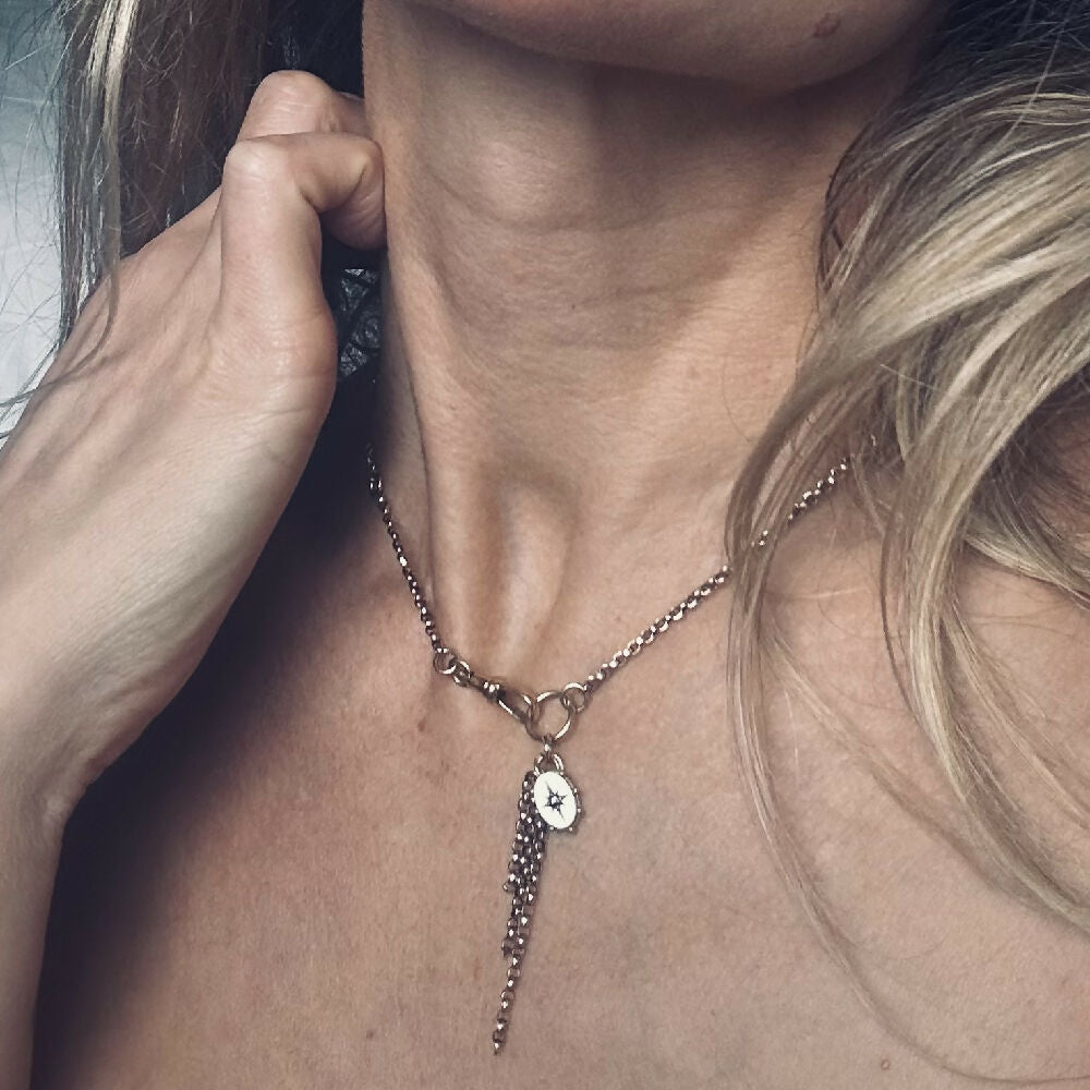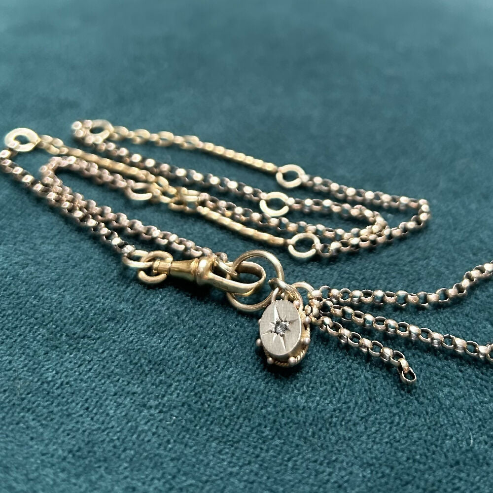 Antique mixed link chain are paired with a converted Diamond tie pin ( marked 9ct on reverse) to give a subtle sparkle among the tassel drop. The Necklace is fastened with a gold Albert clasp which is also hallmarked.