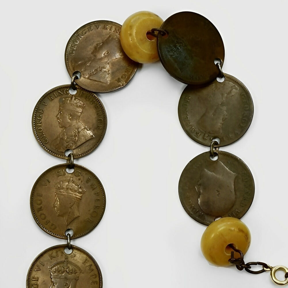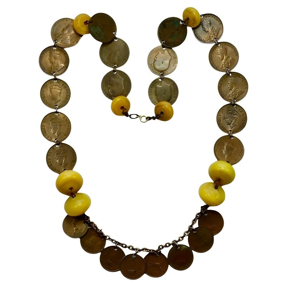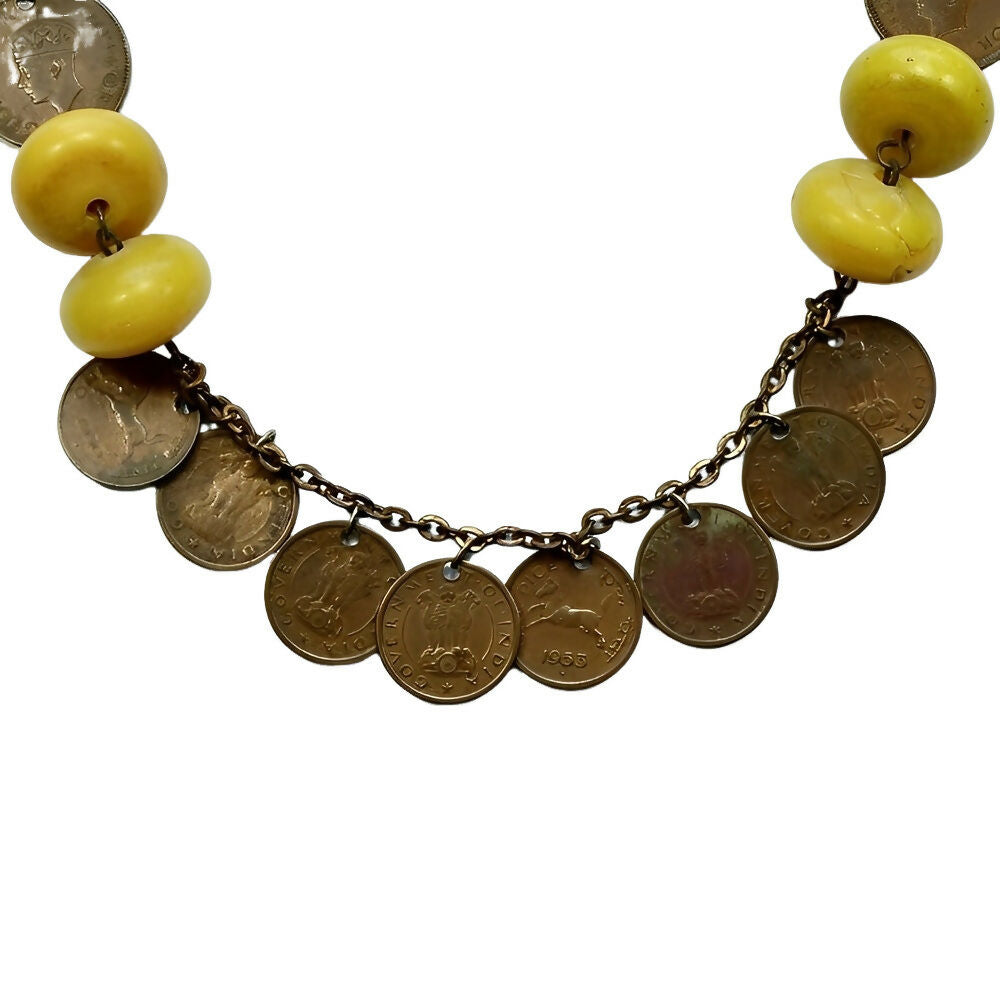 Wonderful Indian Tibetan coin necklace with yellow resin beads. The coins are dated 1908 to 1954.