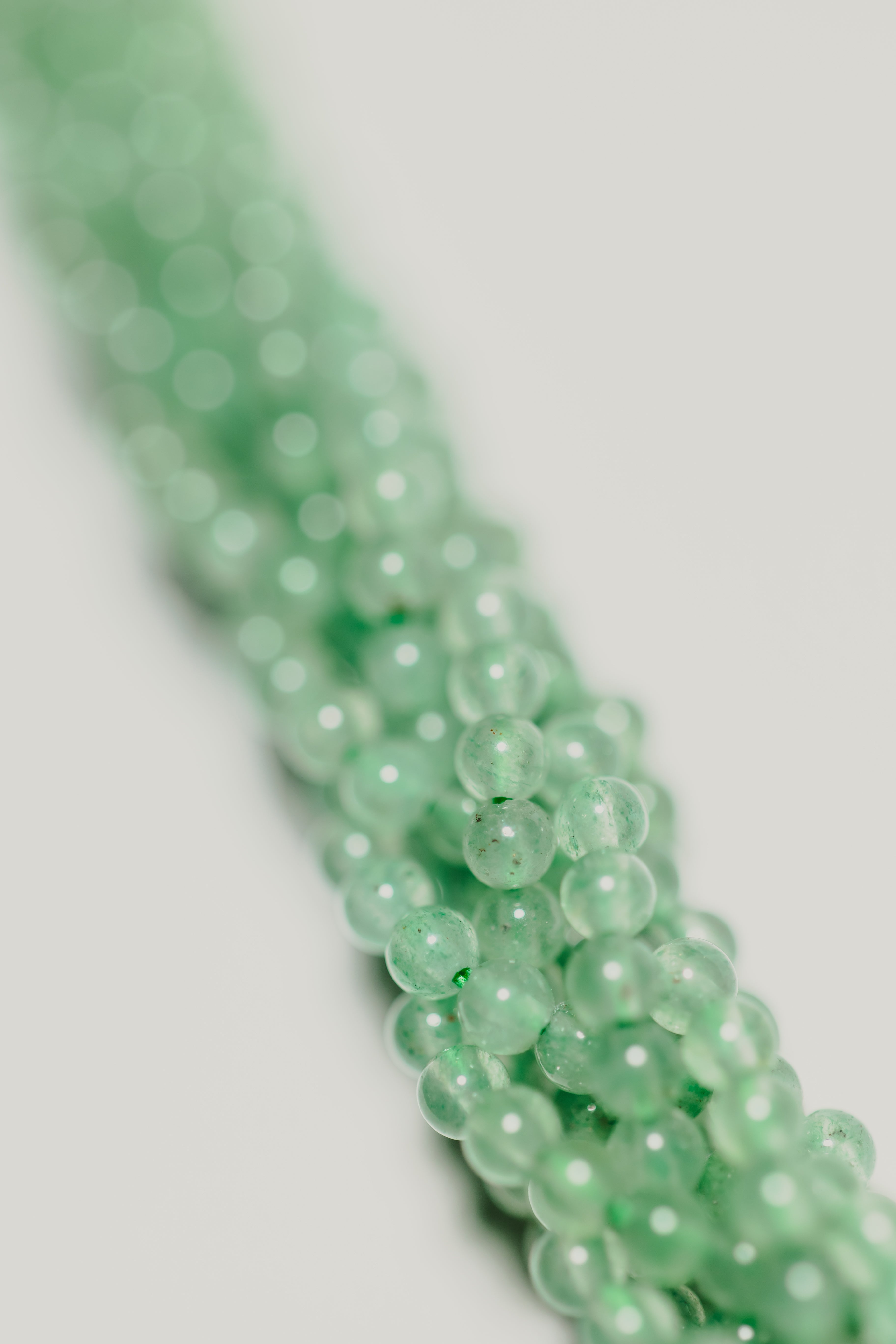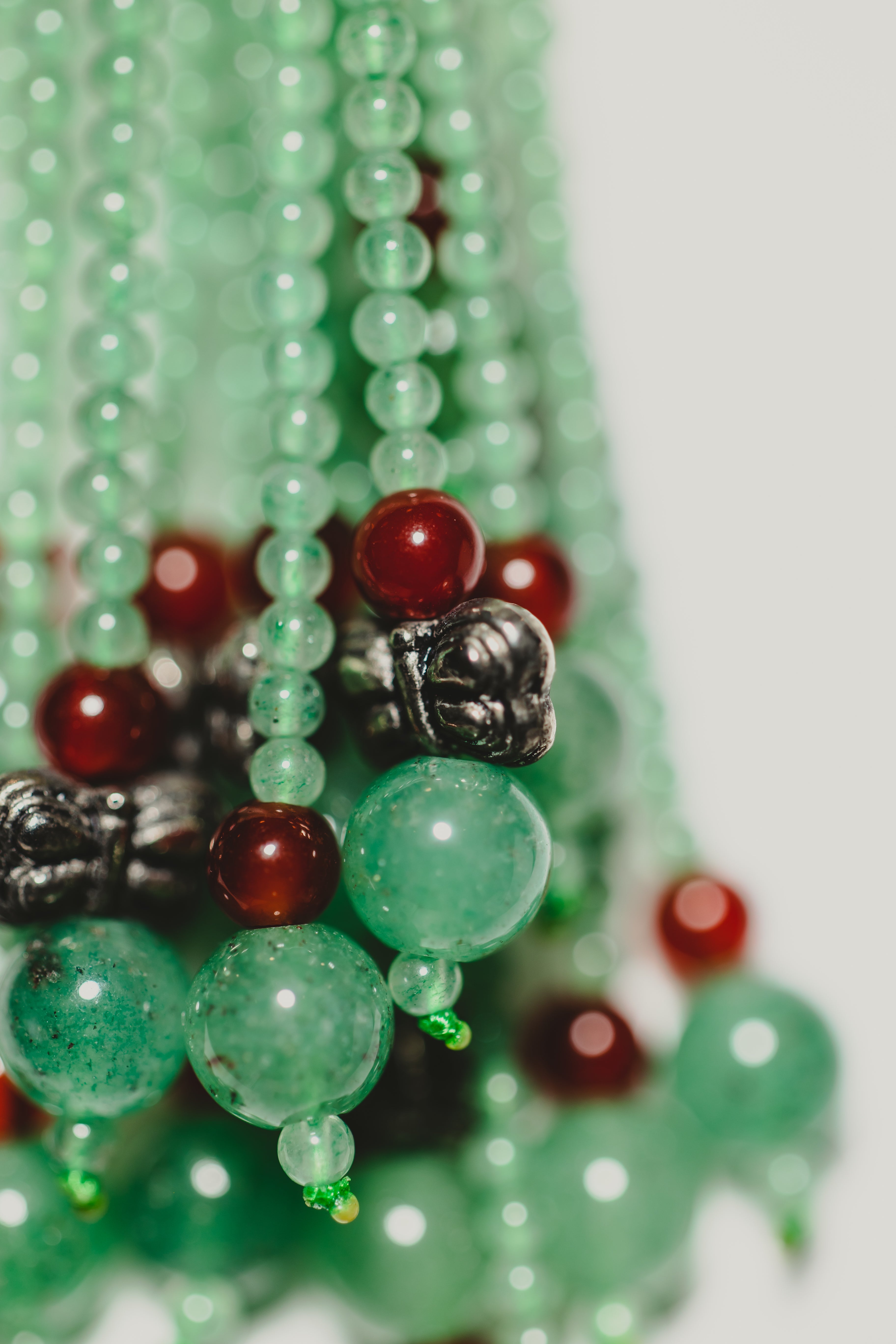 A cascading tassel of aventurine beads, tipped with carnelian, and sterling silver butterflies beads, punctuates the entire piece, while a taught, green silk cord connects the pieces.