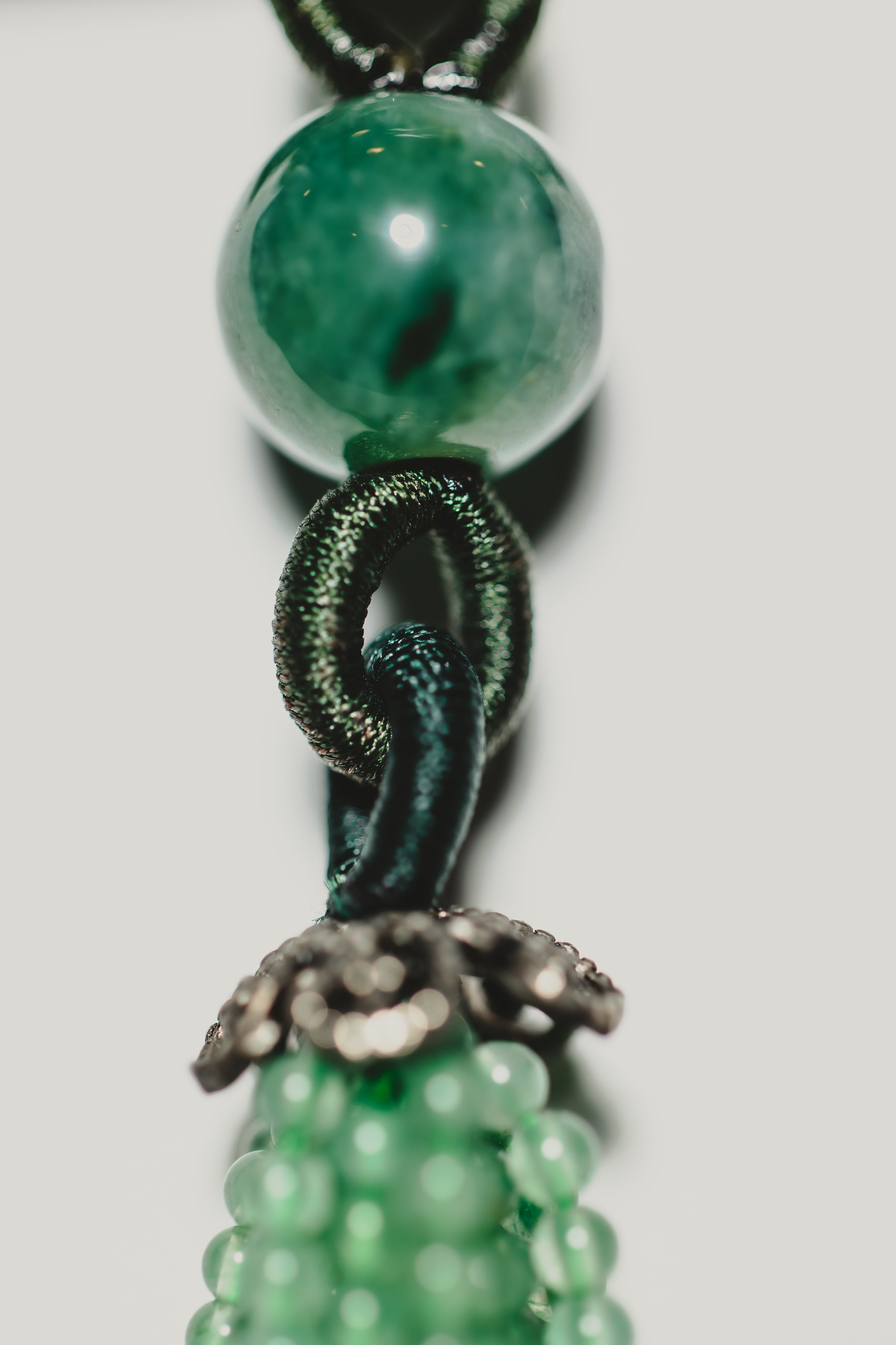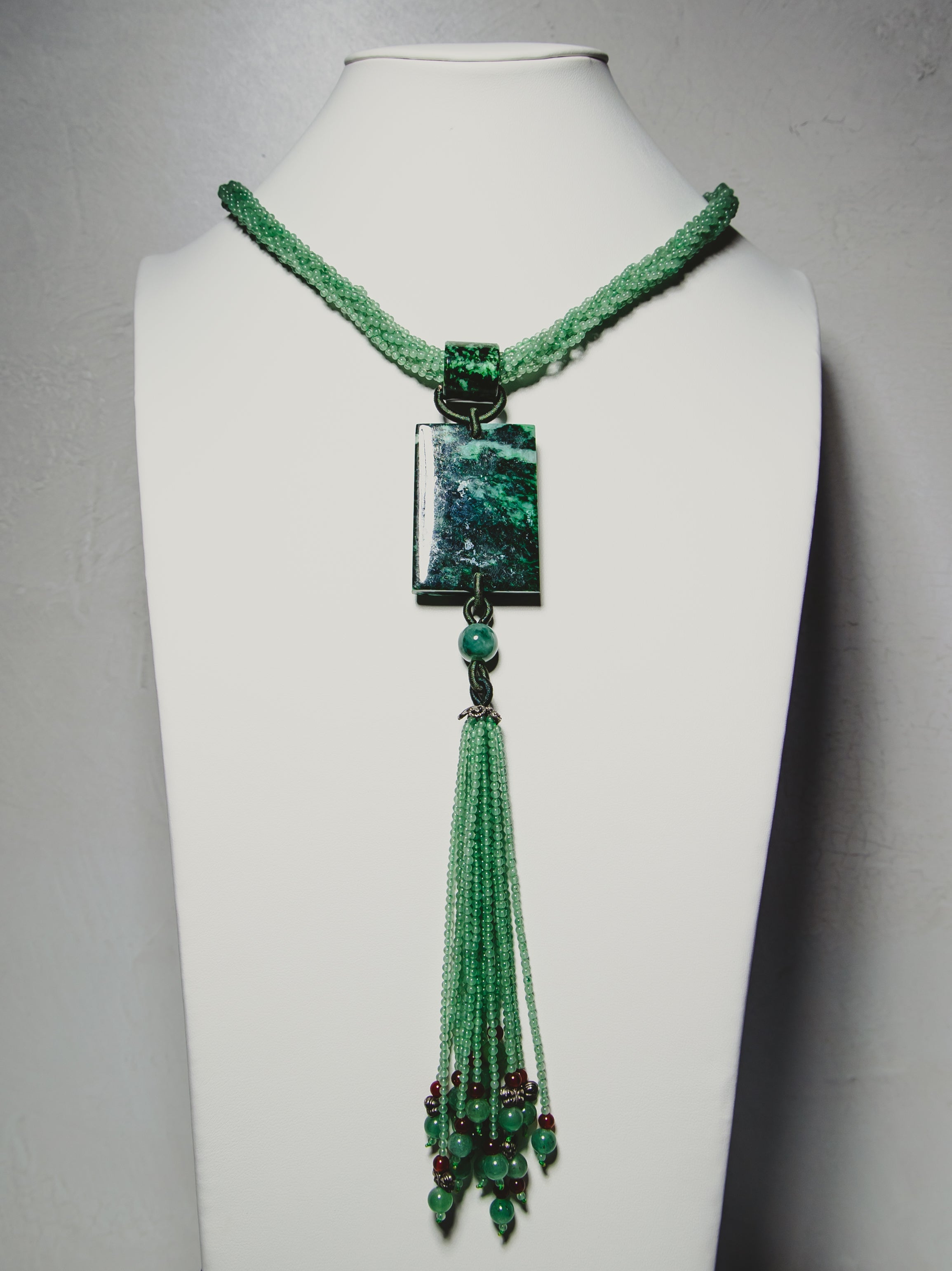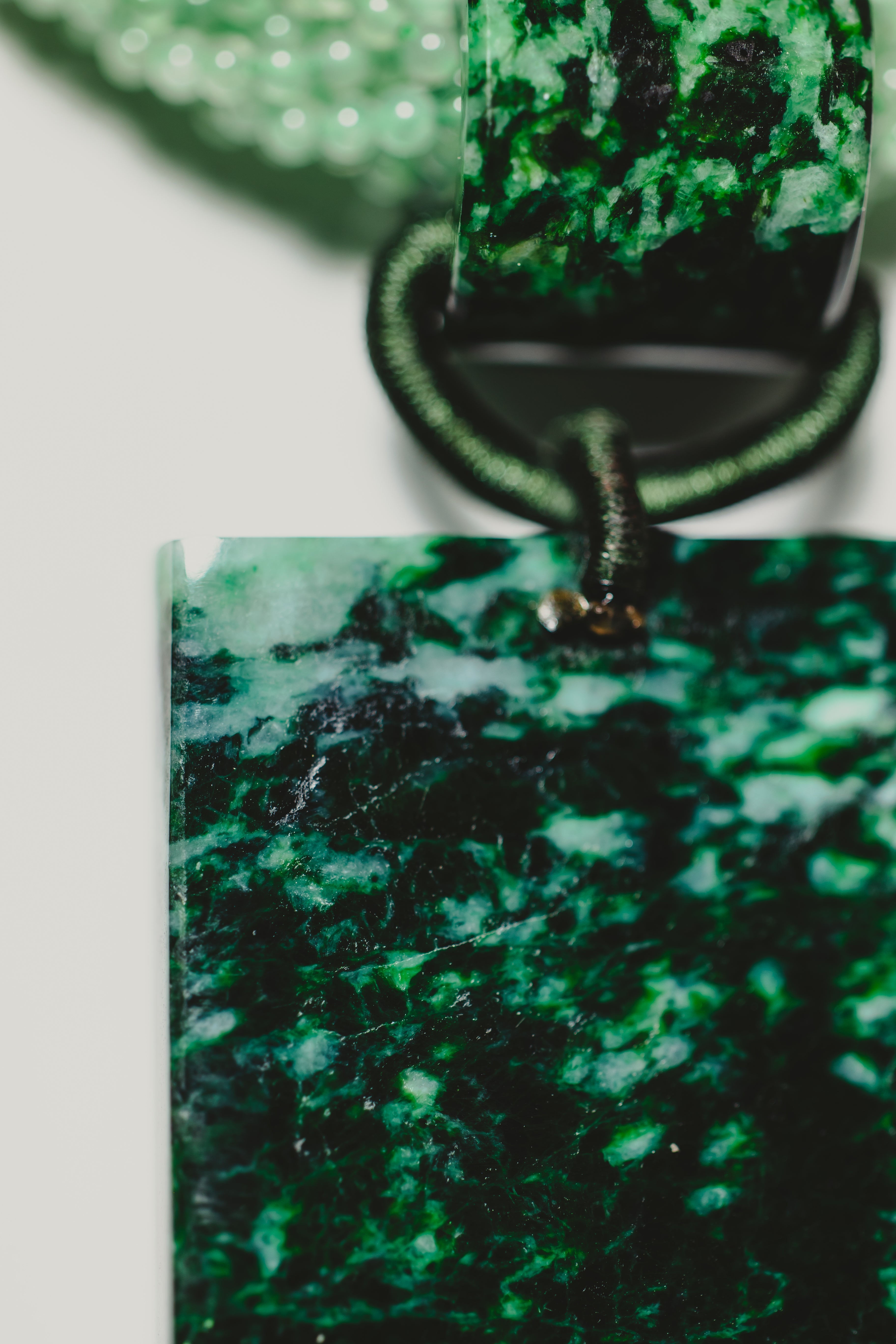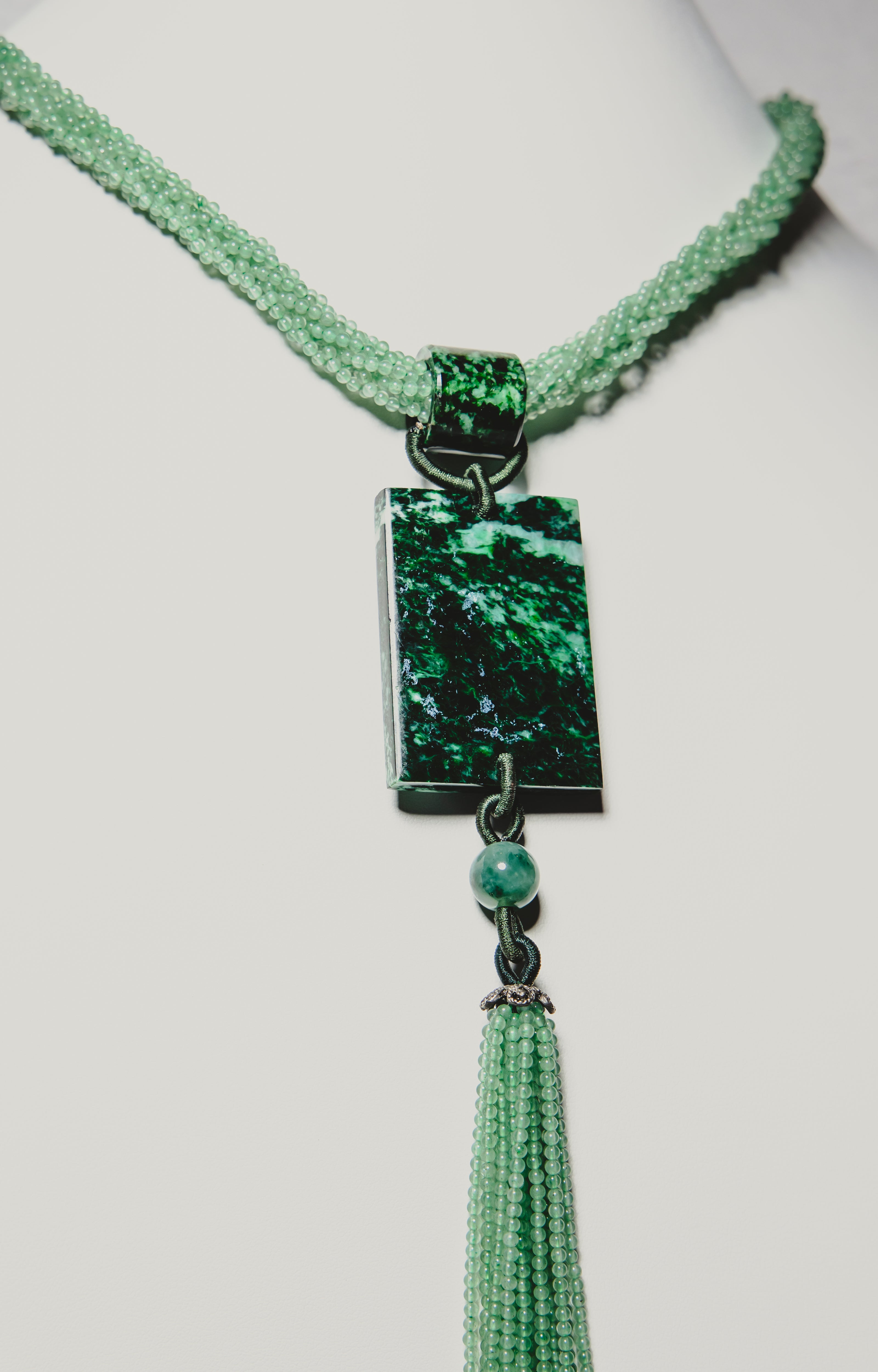 In an explosion of green, hundreds of tiny beads create a silky smooth, braided  necklace that holds a show-stopping rectangle jade pendant, carved to perfection and perfectly smooth.