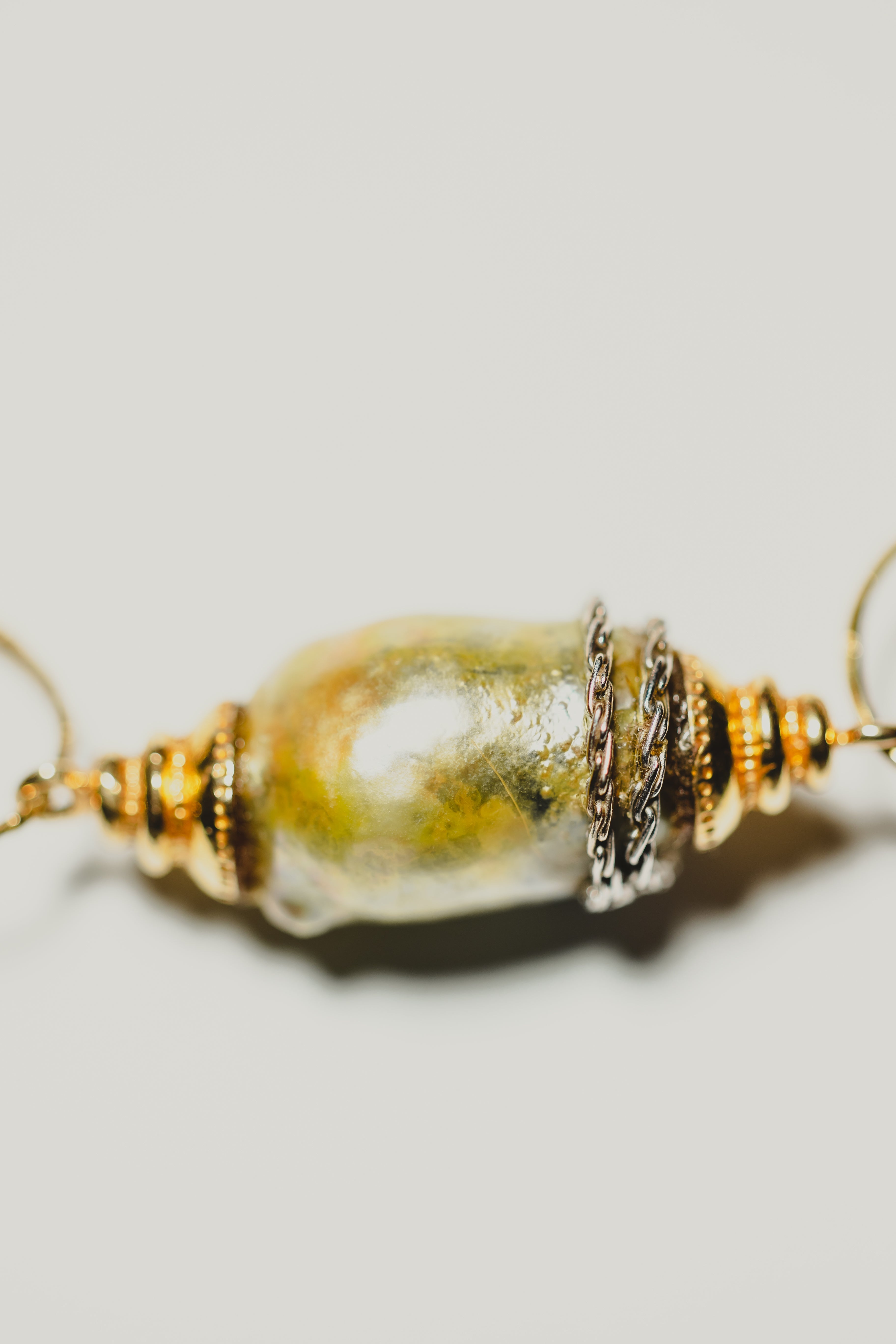 The 18K interlocking circular chain suspends a pistachio colored gift of nature and she feels like a dream on.