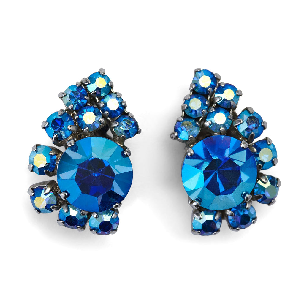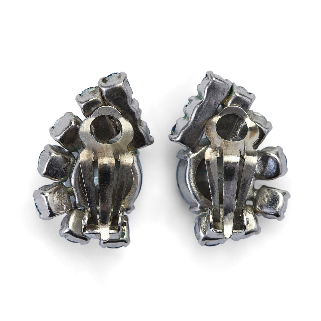 Original aurora borealis rhinestone crystal earrings from the 1950s. Austrian crystal manufacturer, Daniel Swarovski, invented this finish in 1956 when he began coating crystals with a special iridescent sheen. These clip-on earrings are in a teardrop-shaped array of round stones around one large central round stone. The back is formed from silver-toned metal and features a classic clip-on clasp.