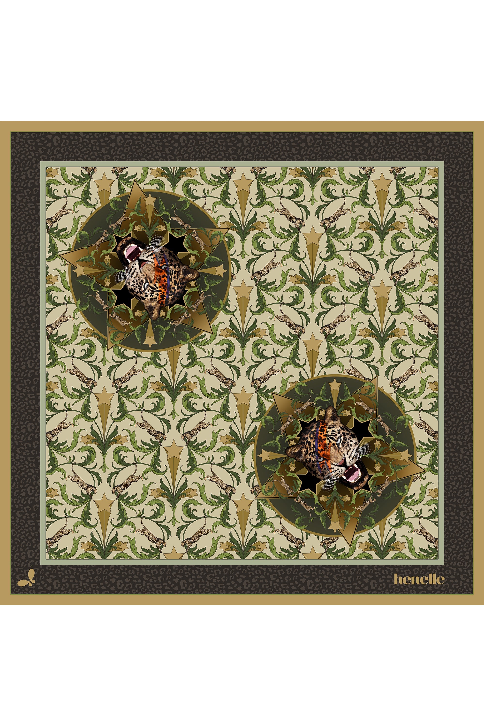 Inspired by Hollywood Regency design this print features leaping leopards, scroll like leaf patterns and shooting stars. Neutral sandy and sage green tones.