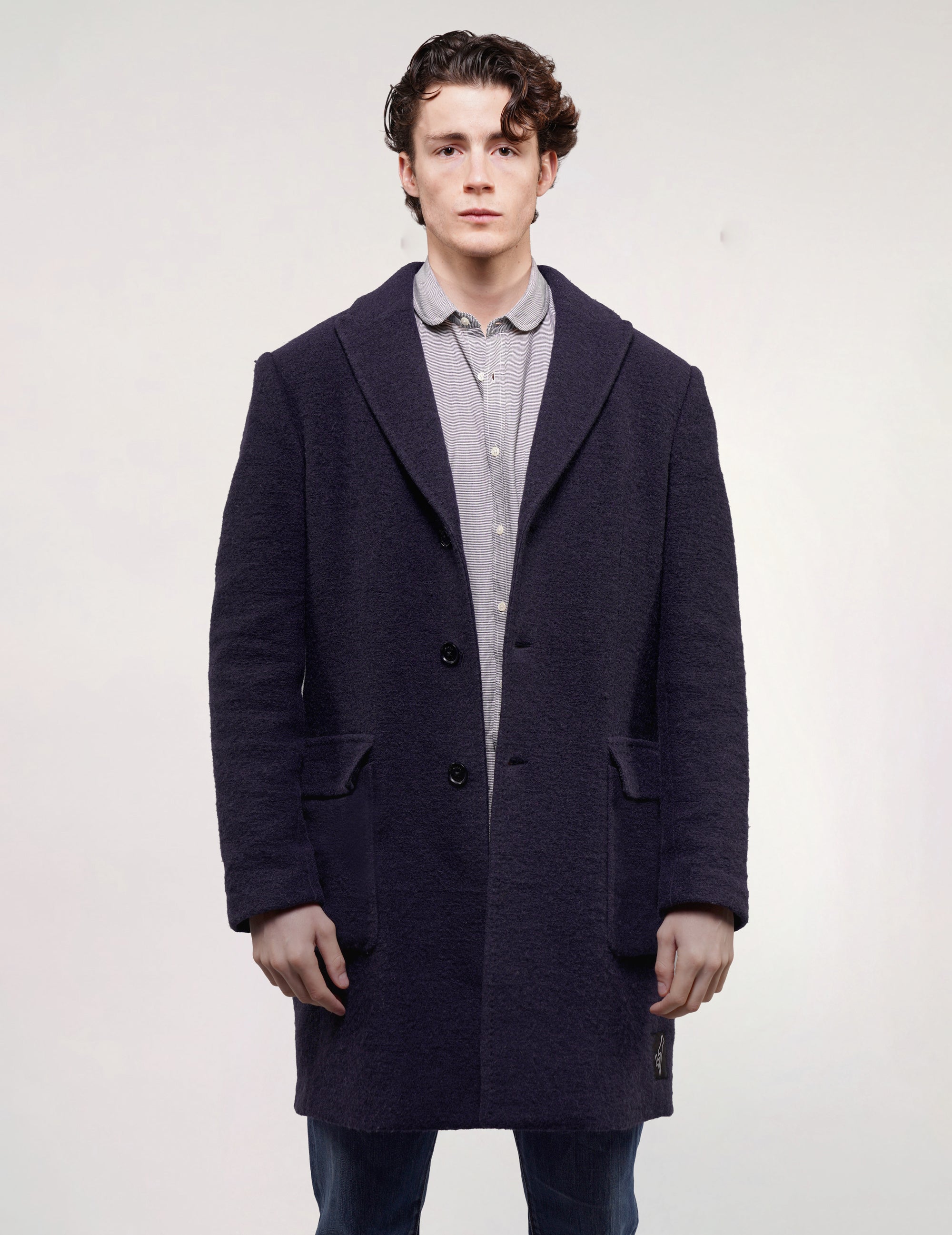 Nigel Hall navy blue single breasted overcoat, composed of the finest wool fabric made in Italy by IN. TES. PRA. Features two large front pockets and navy blue Nigel Hall buttons. Perfect for a sophisticated, tailored look.