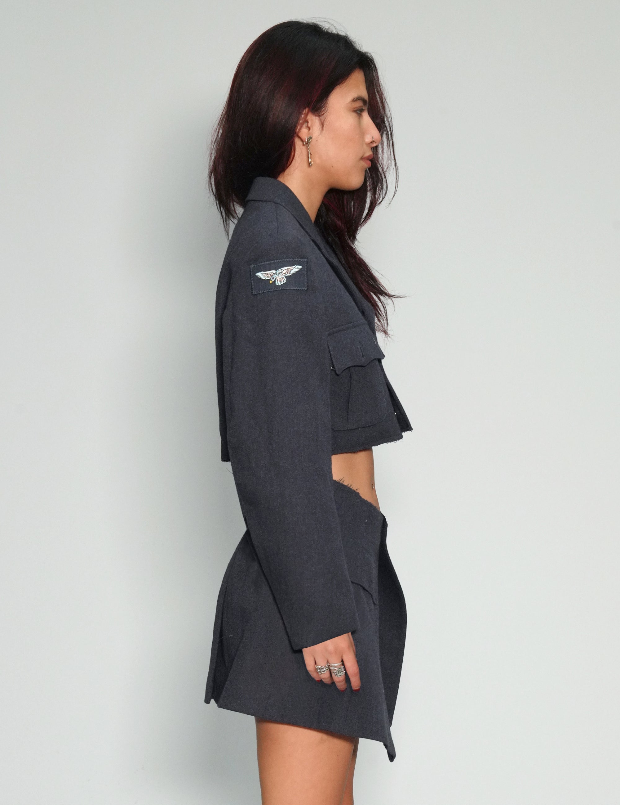 A beautiful two-piece set, repurposed from a vintage RAF uniform. Super cool raw edge finished hem and waist. 100% Wool. Top features breast pockets inside and outside, and skirt features hip pockets